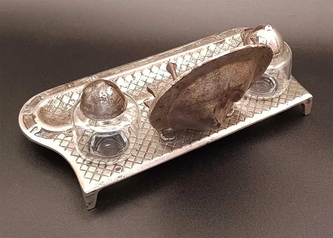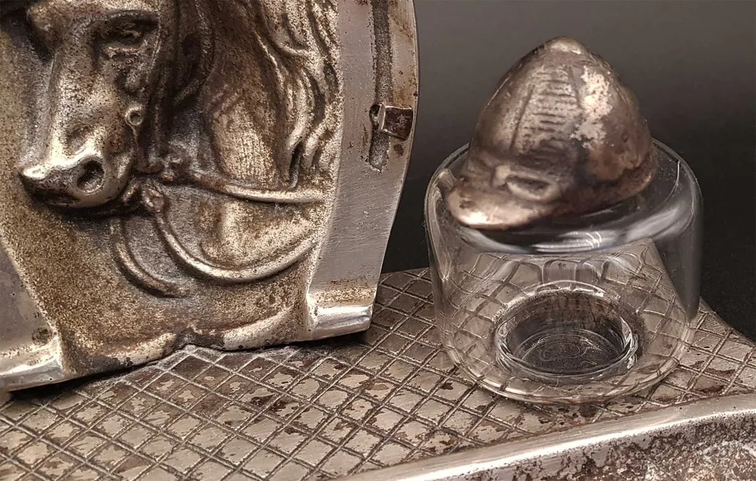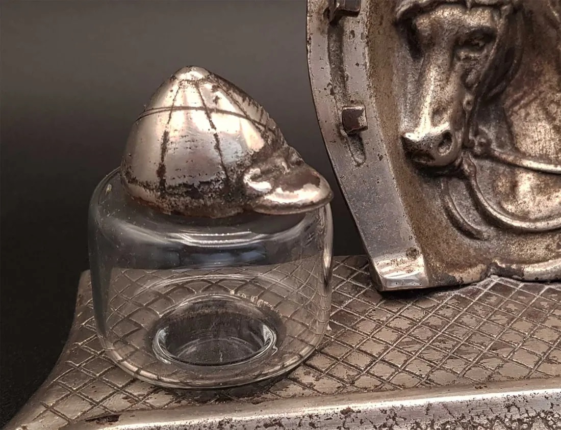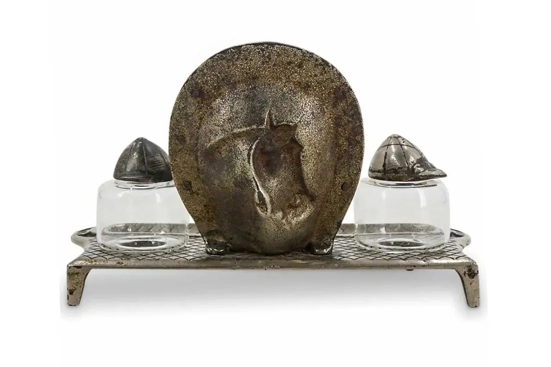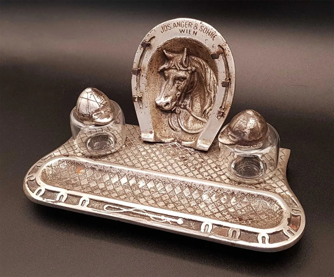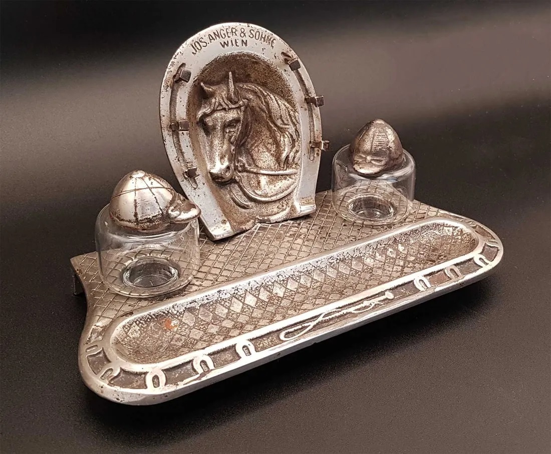 A double inkstand featuring a horse head in relief framed by a horseshoe with extruding nails, which can hold a pen. The footed base is decorated with cross-hatched designs. Around the edges are horseshoes and a riding crop. The two glass inkwells have unattached lids in the form of jockey’s caps. Engraved on the horseshoe is “Jos. Anger & Sohne, Wien” (Joseph Anger and Sons, Vienna) likely the owners of this inkstand.