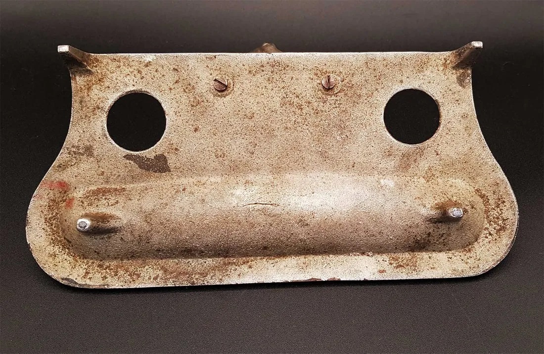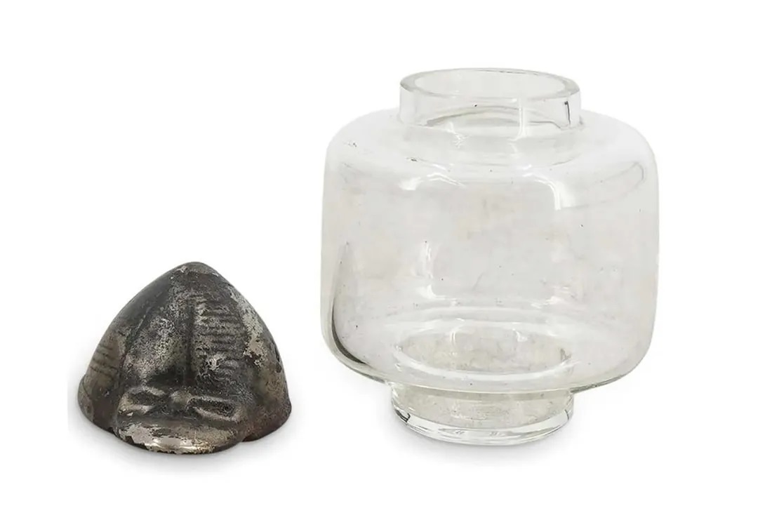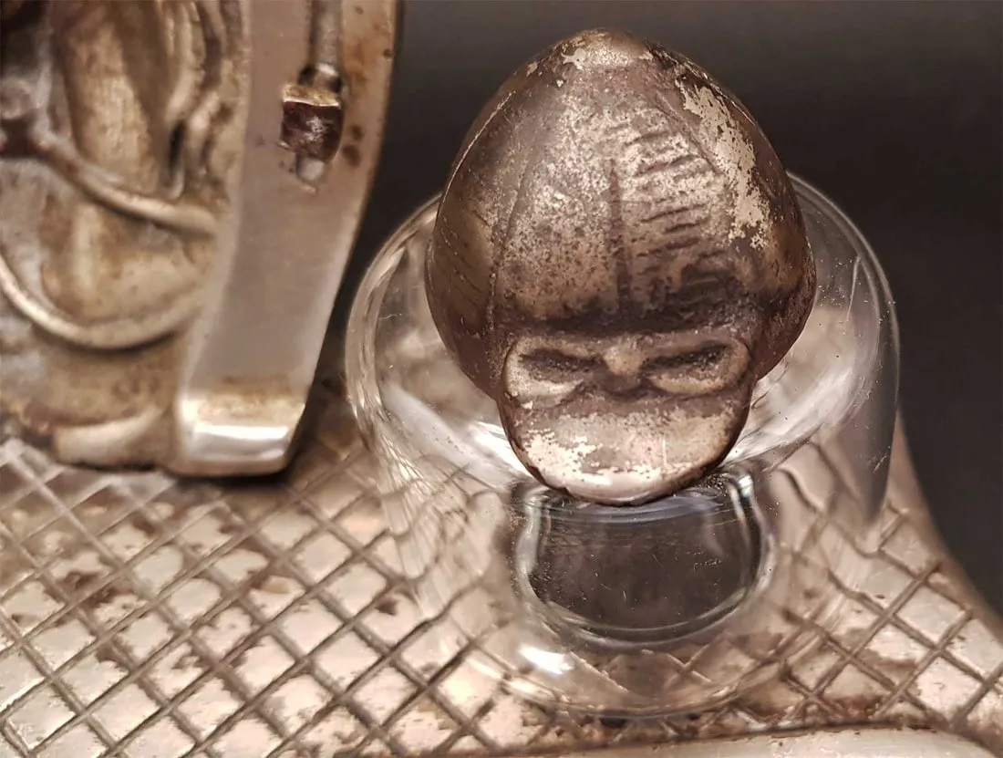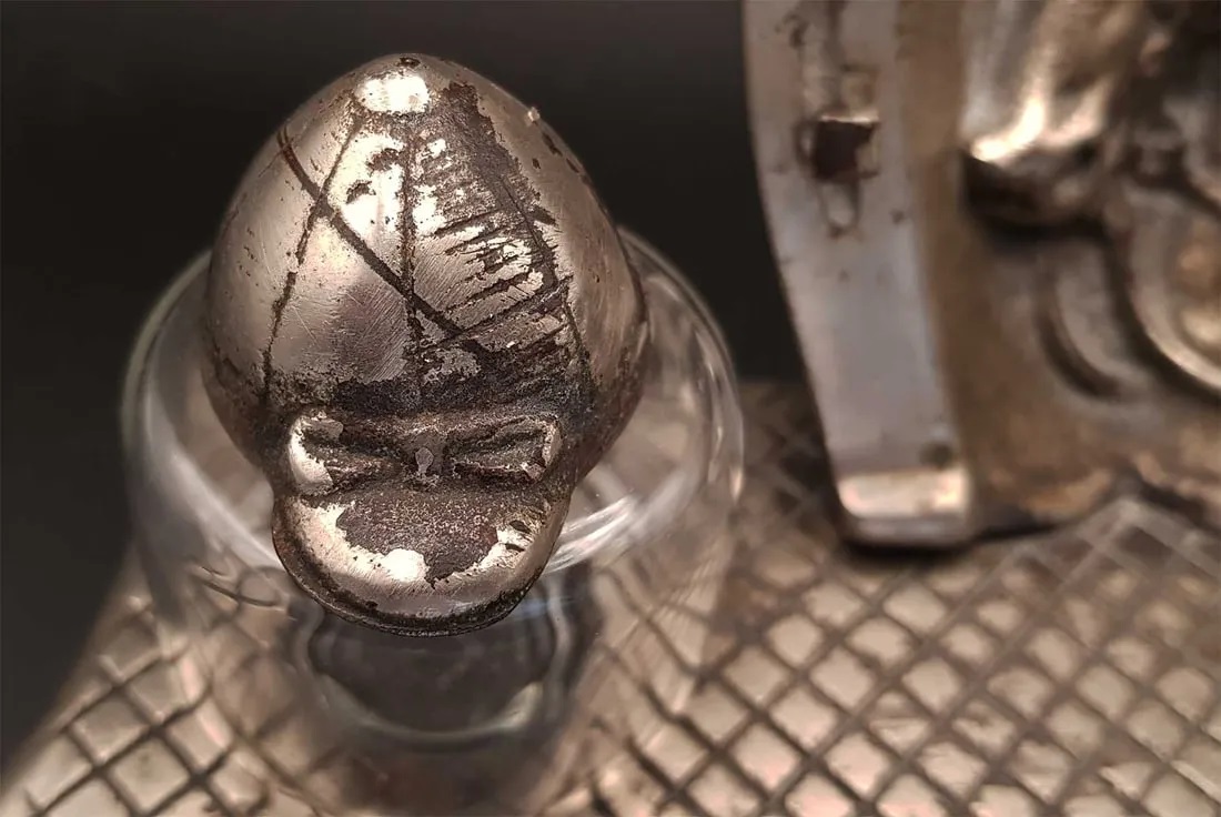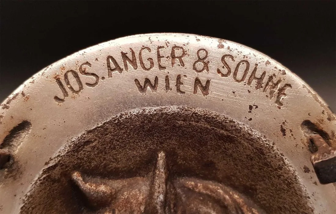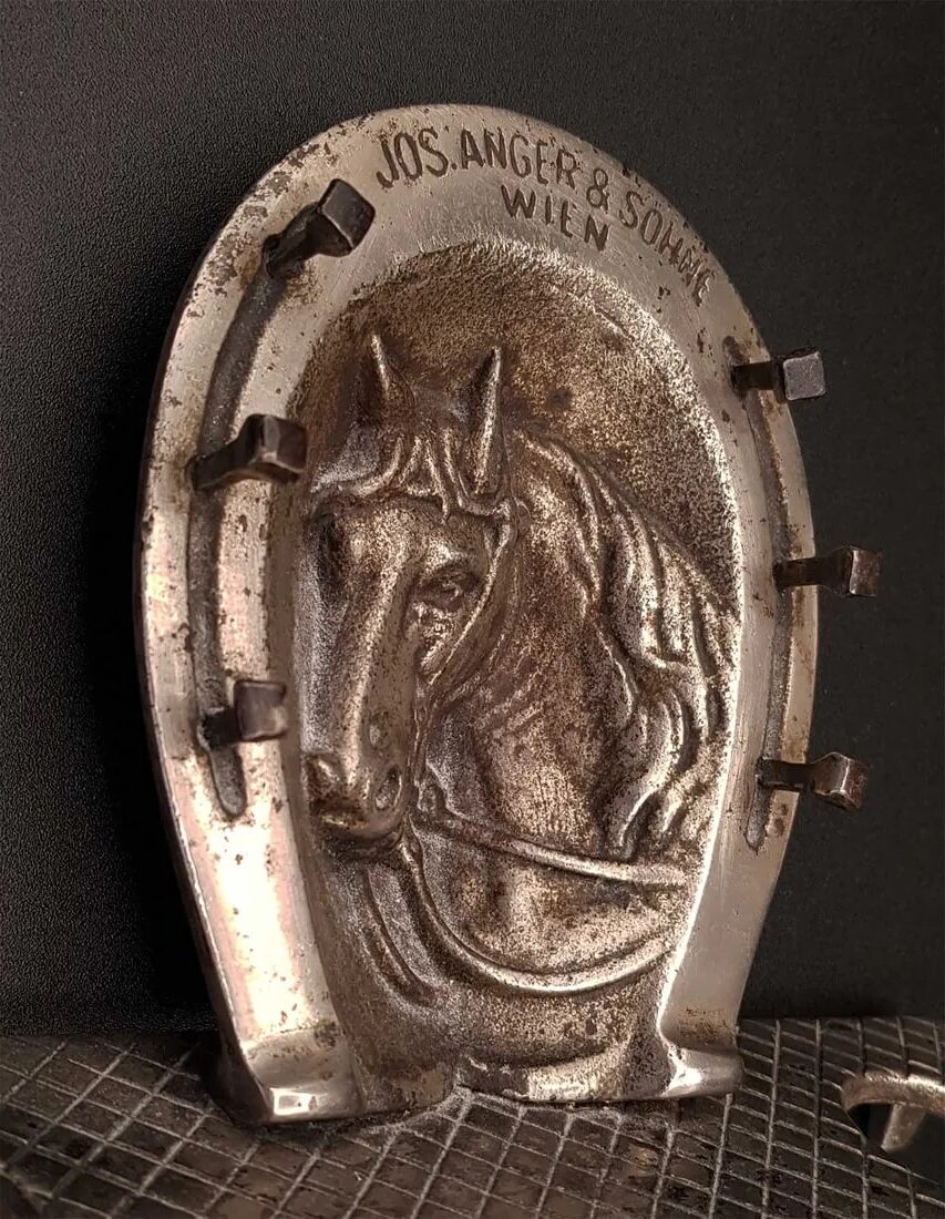 A double inkstand featuring a horse head in relief framed by a horseshoe with extruding nails, which can hold a pen. The footed base is decorated with cross-hatched designs. Around the edges are horseshoes and a riding crop. The two glass inkwells have unattached lids in the form of jockey’s caps. Engraved on the horseshoe is “Jos. Anger & Sohne, Wien” (Joseph Anger and Sons, Vienna) likely the owners of this inkstand.