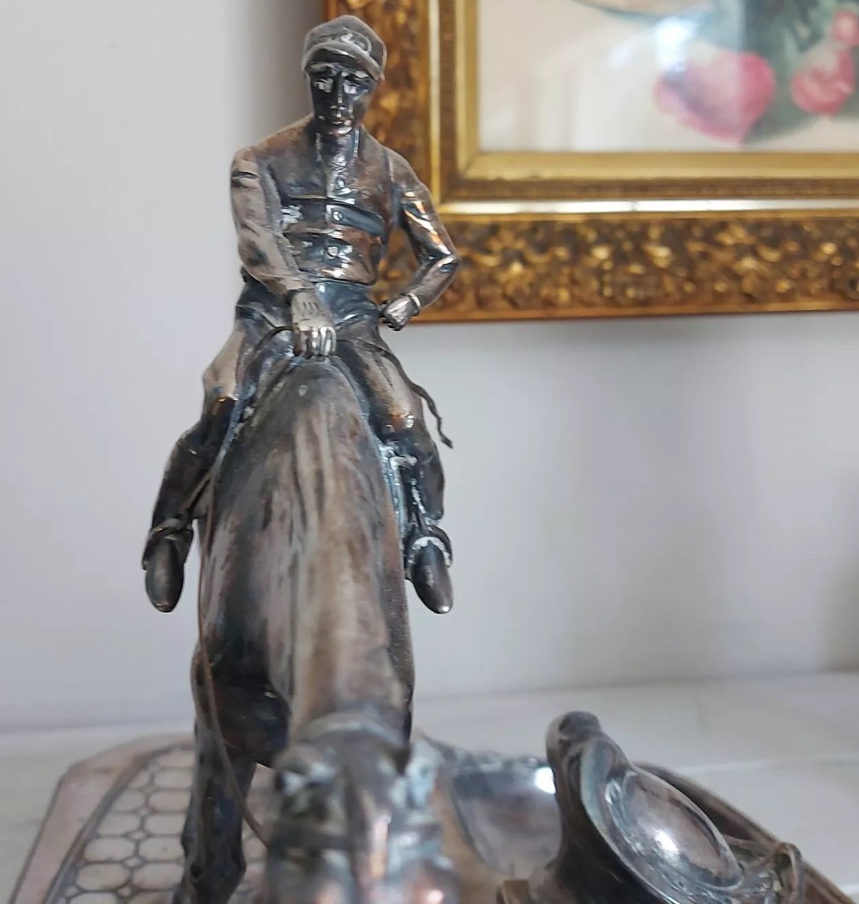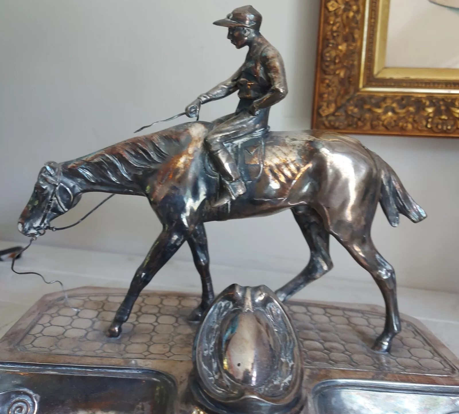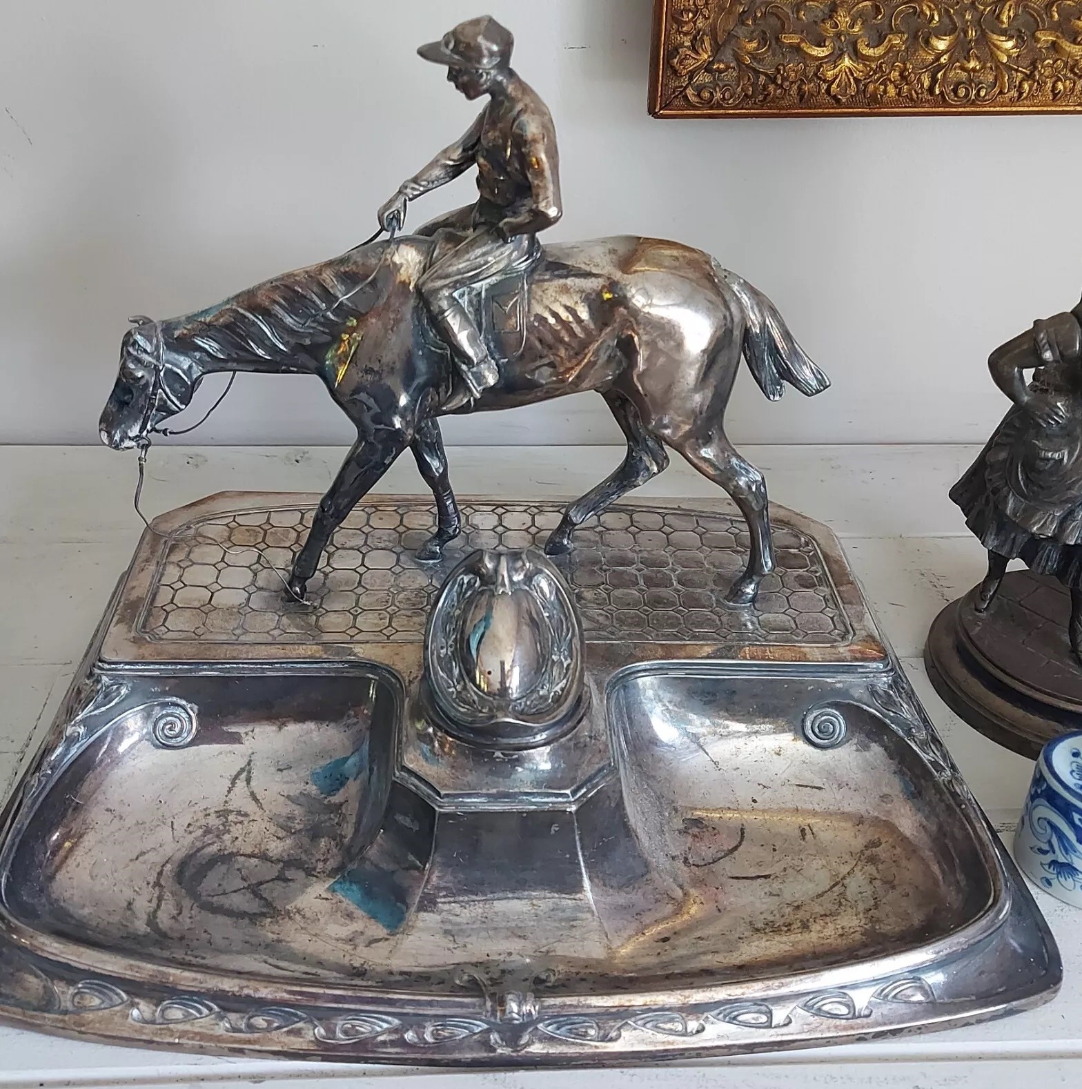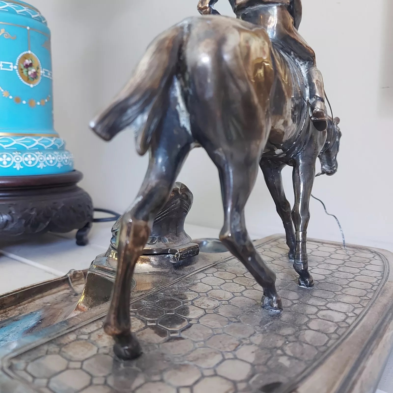 J P Kayser plated pewter equestrian inkstand, modelled with a jockey on horseback with inkwell and pen tray.