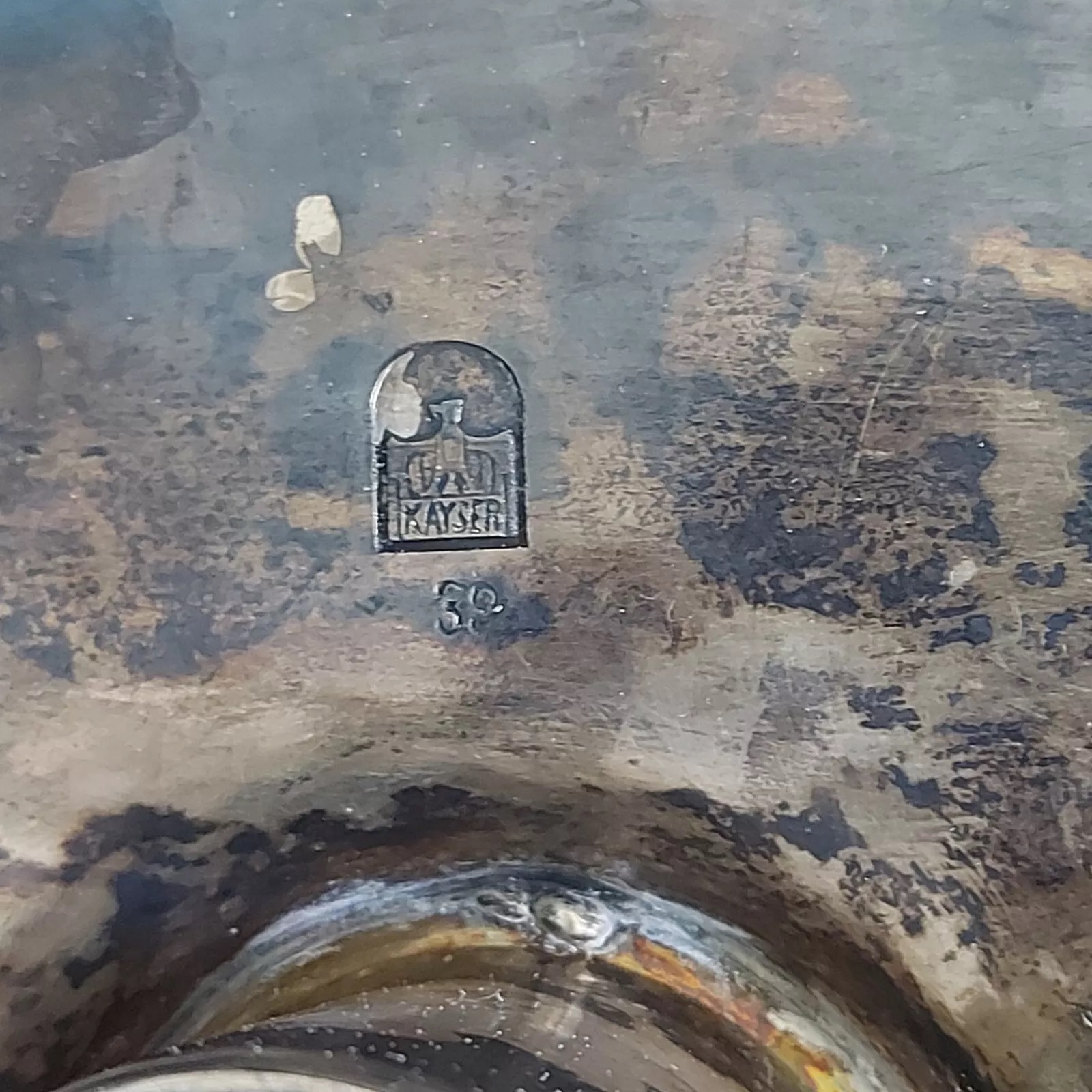J P Kayser & Son of Krefeld-Bochum, near Düsseldorf, Germany was originally the ‘Leuconide Metalware Factory, founded around 1885. They were tin manufacturers and developed a lead-free pewter with the trade name ‘Kayserzinn’ from 1894 to 1912. Under Jean and Engelbert Kayser, this was used in the making of Jugendstil items designed in Cologne by Hugo Leven and others. They also produced well-made copper and brass items.