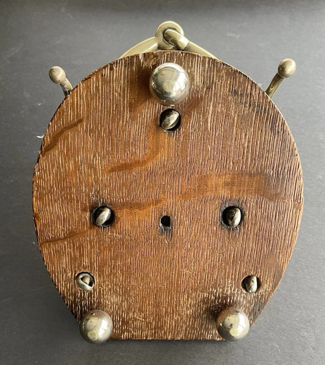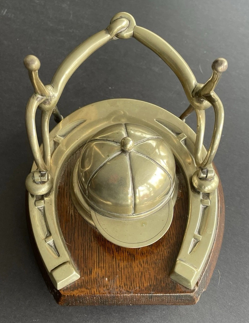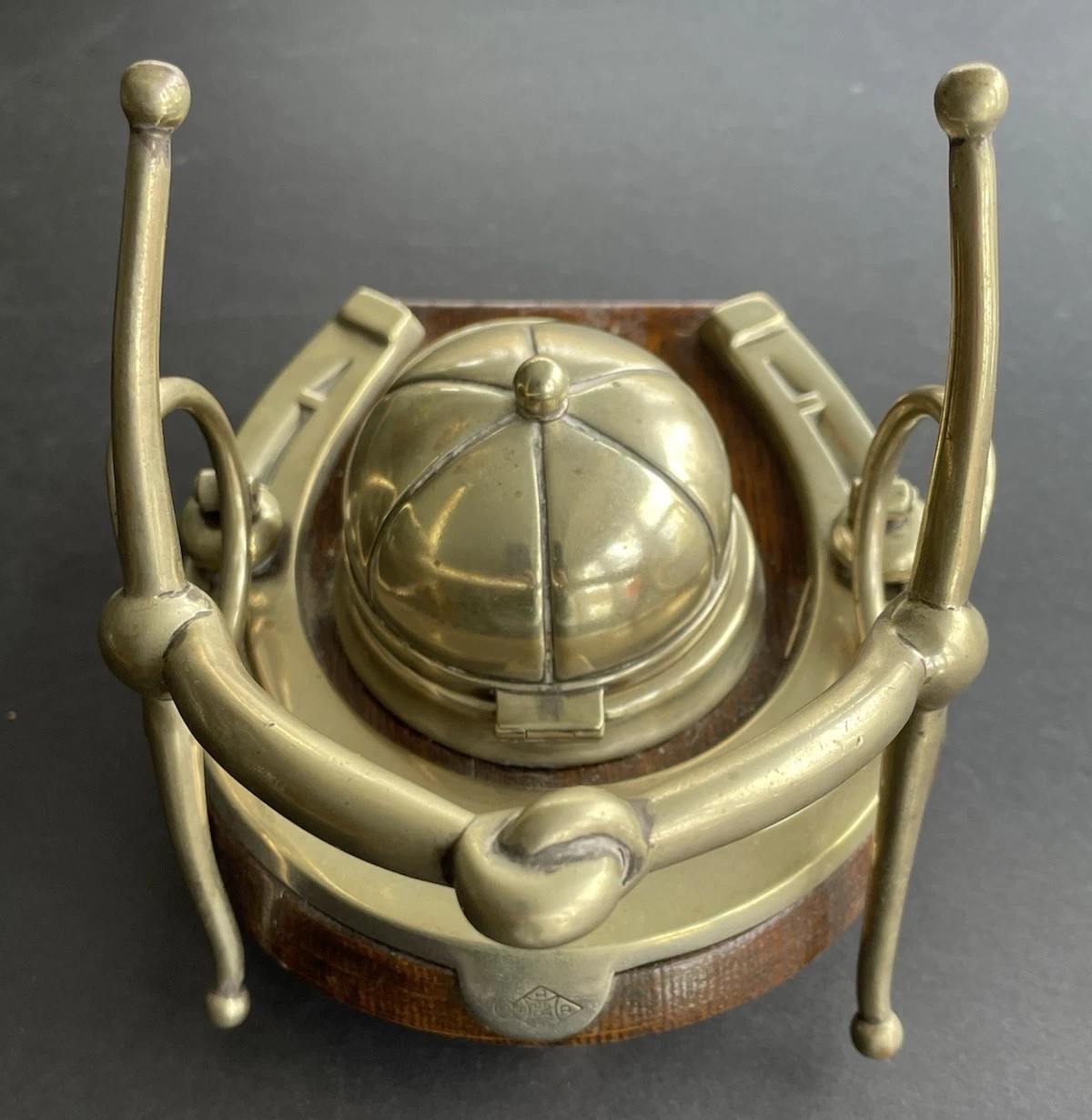 - Brass Framework: The inkwell is framed by an ornate brass structure. The most prominent feature is a horseshoe, which is an integral part of the design and sits on the wooden base. Above the jockey’s cap, two curved brass pieces rise and connect at the top with a decorative knot or loop. These side pieces have small, rounded finials at their ends and form a holder for a pen. The design resembles a bridle bit, which reinforces the equestrian theme.