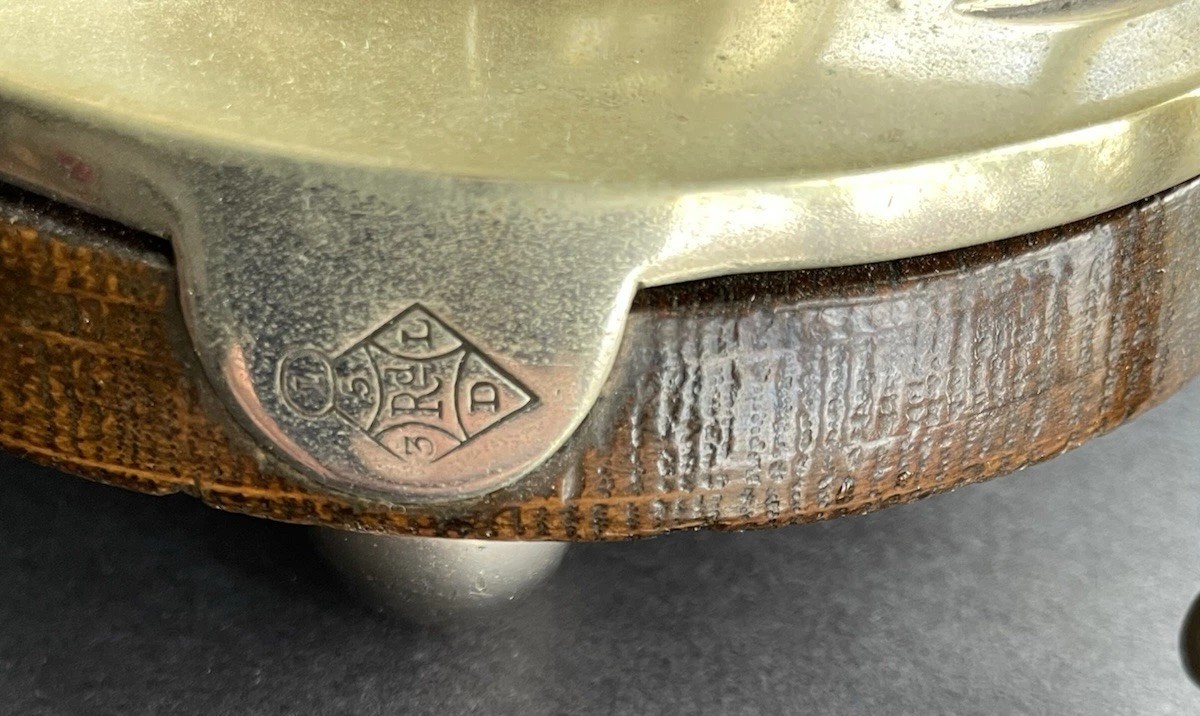 - Markings: The inkstand features a clear English design registry mark on the brass base, located next to the jockey’s cap.