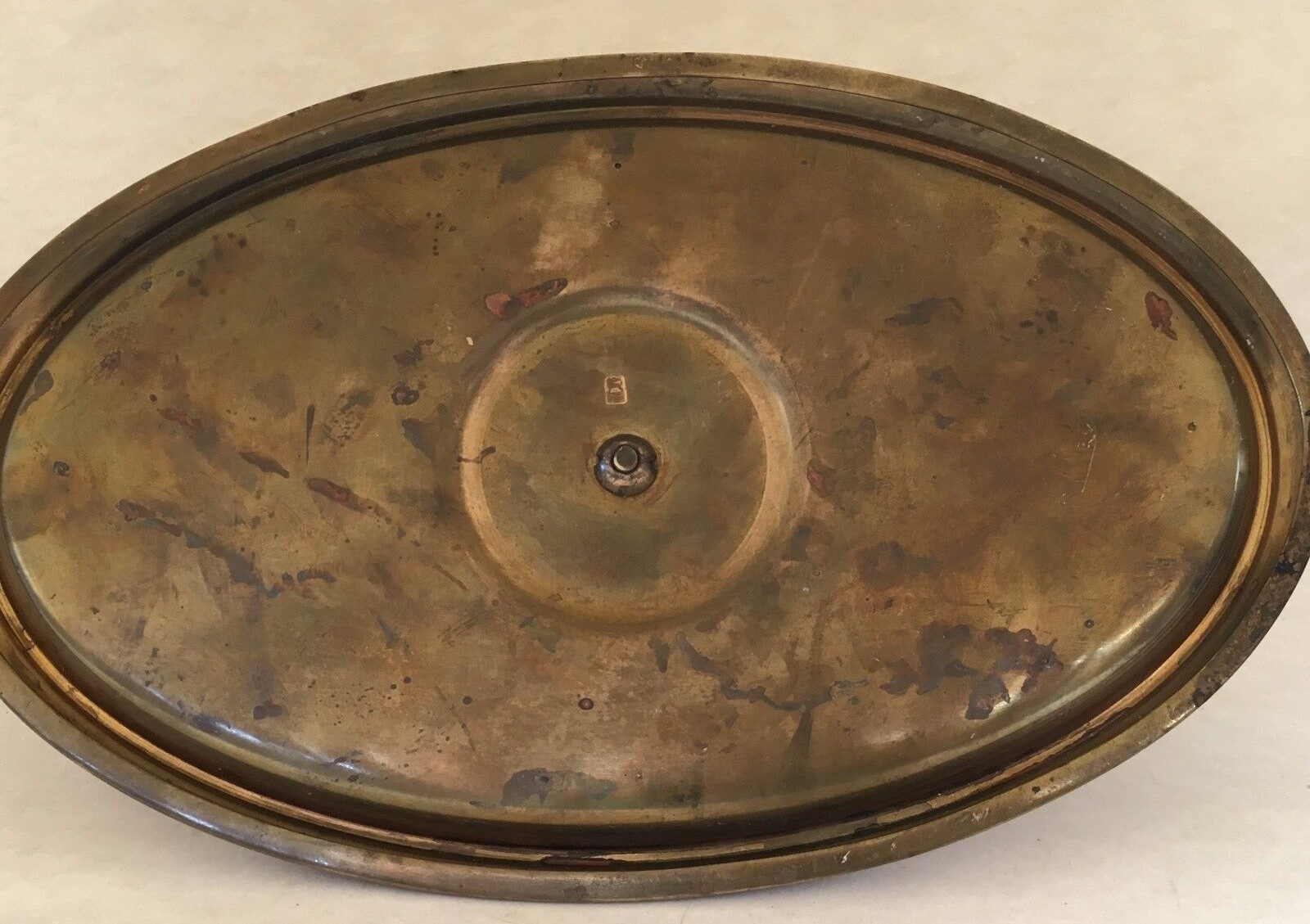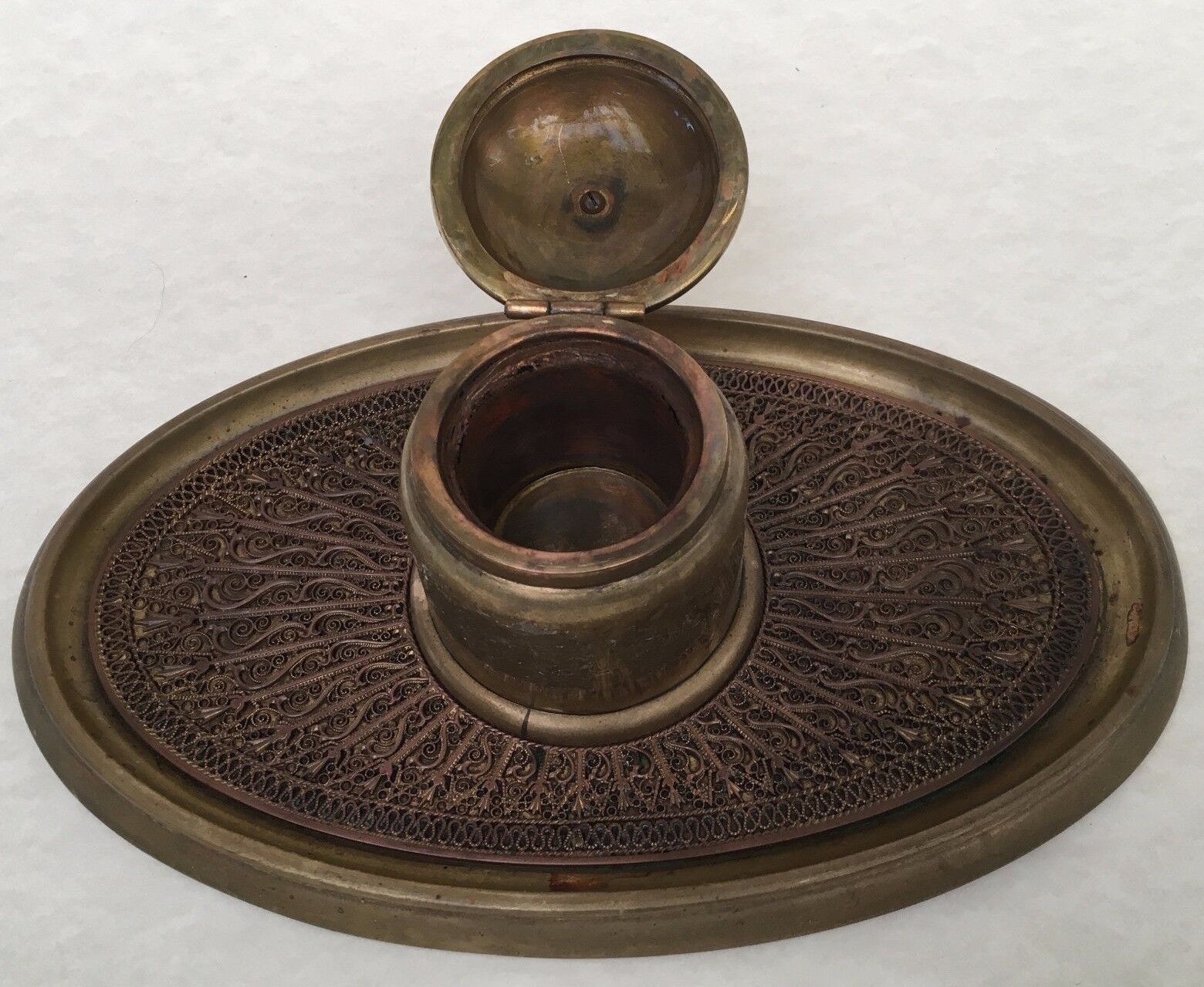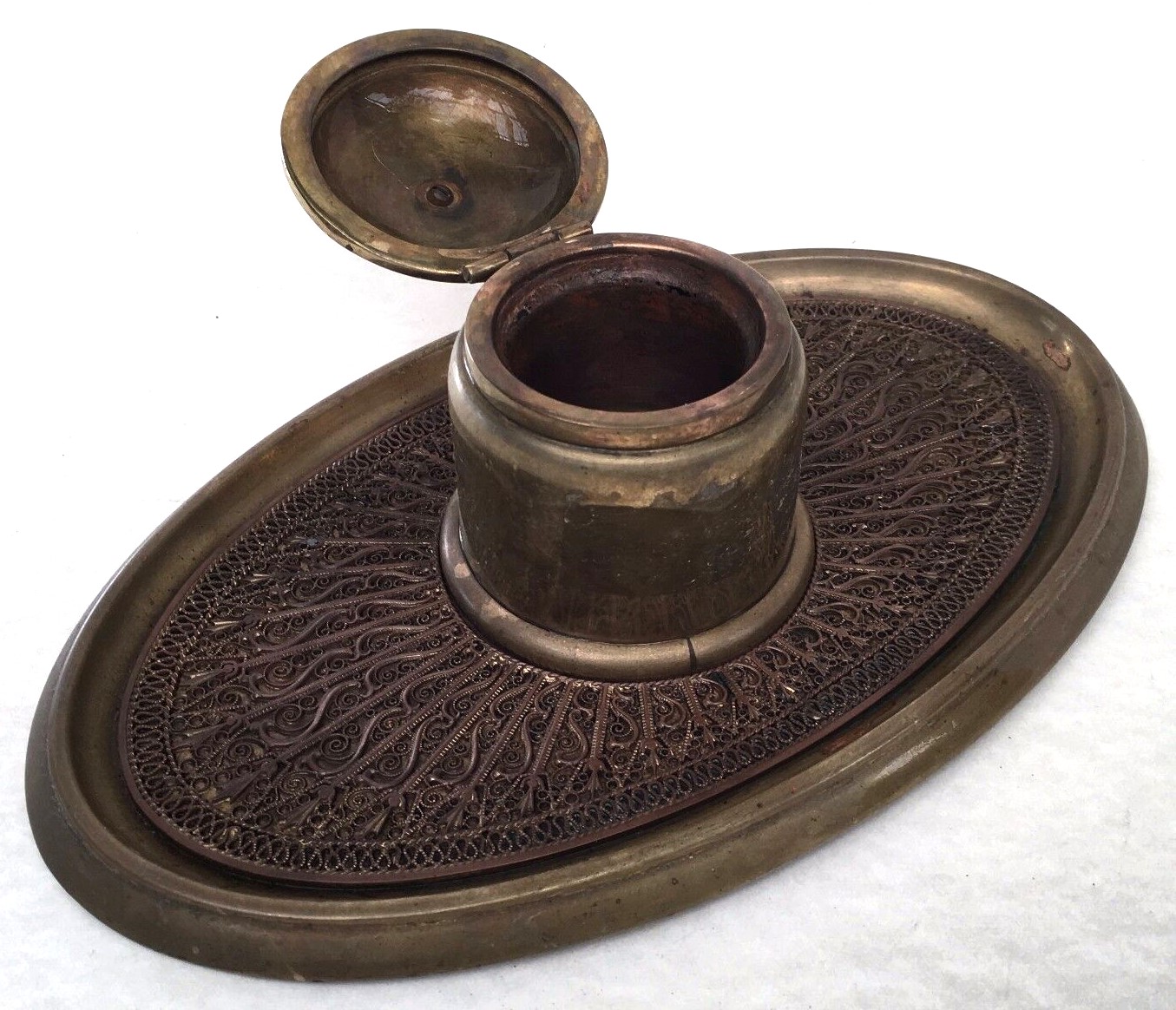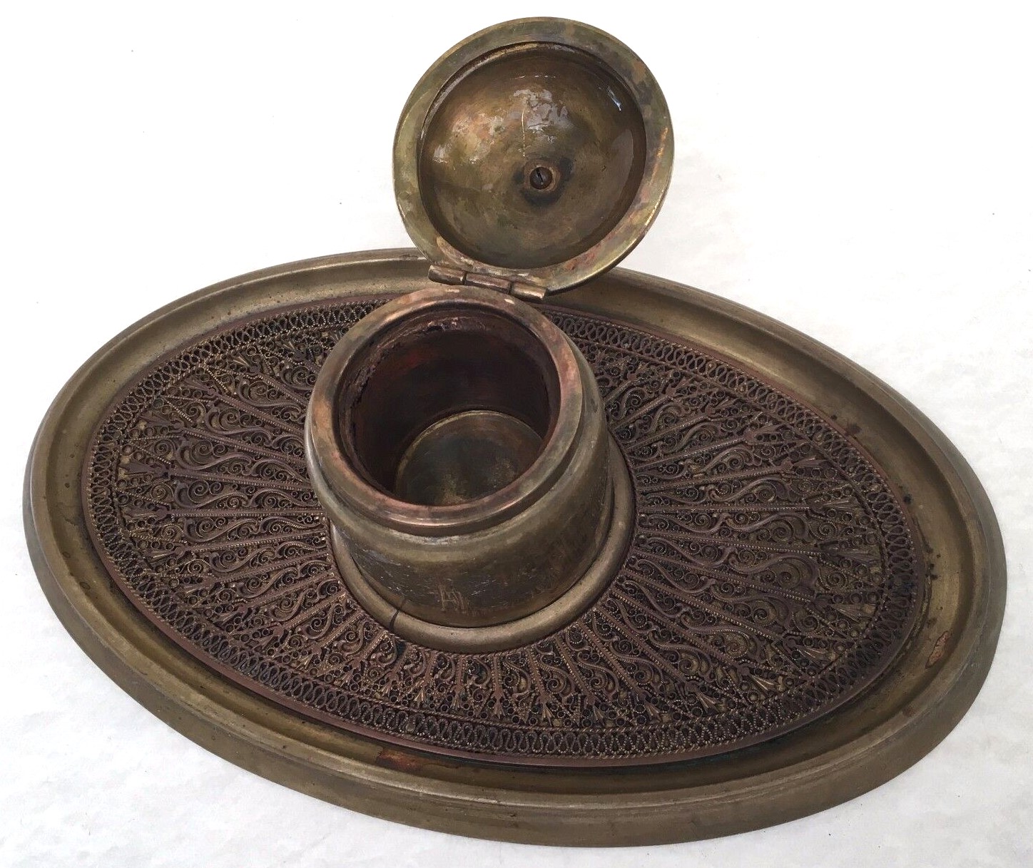 ERHARD & Söhne was established in 1844. The company Erhard & Sons was established by Carl Gottlieb Erhard and his two sons in Schwäbisch Gmünd in 1844. Erhard & Söhne had the world-patent for the manufacture of brass-inlay in 1904. Since then, they designed and manufactured high-quality brass-inlay boxes and items which represented unique and noble German Art-Nouveau style at its peak. This inkstand is marked: Erhard & Söhne maker’s mark, an “E” and Lion-aquamanile. It displays beautiful filigree. Insert missing.