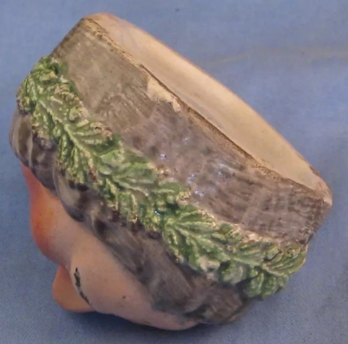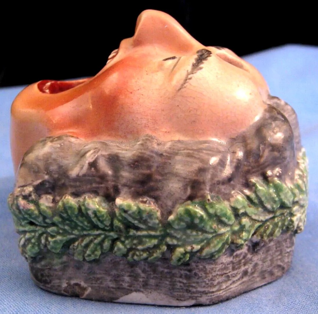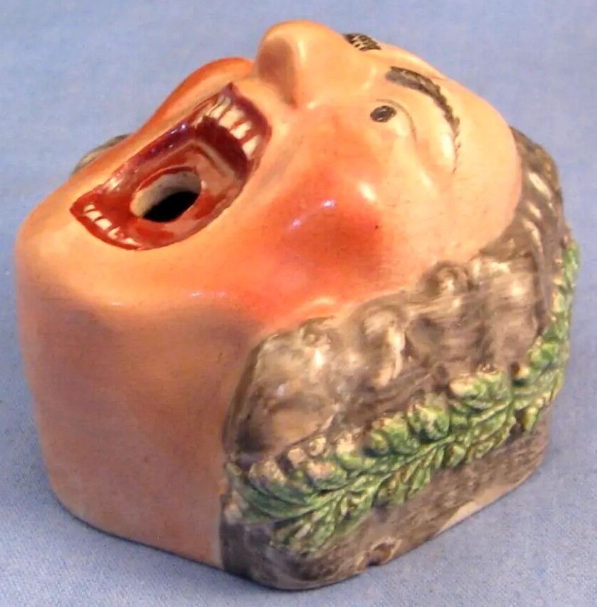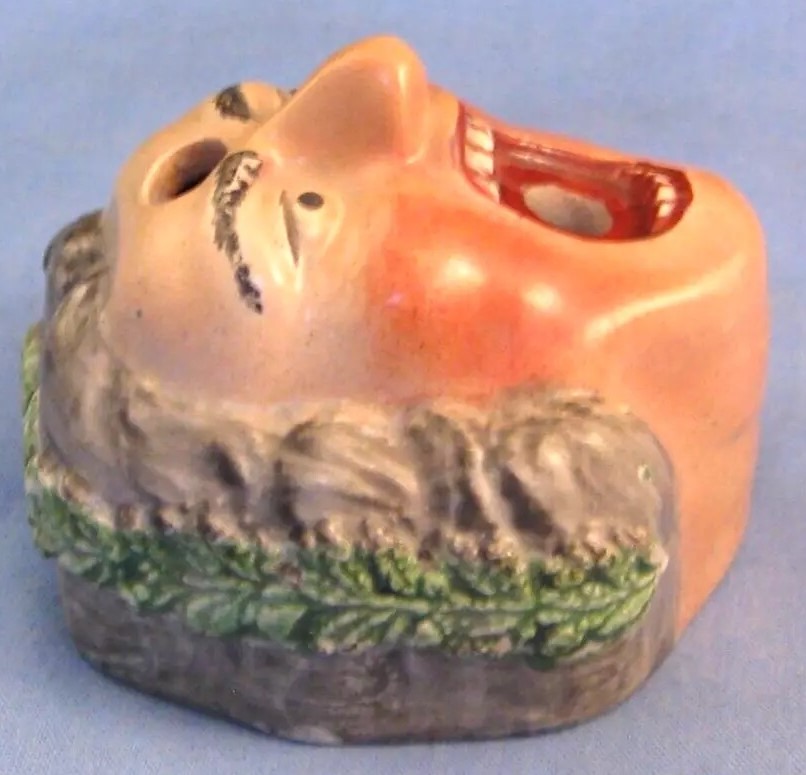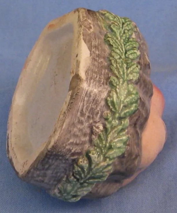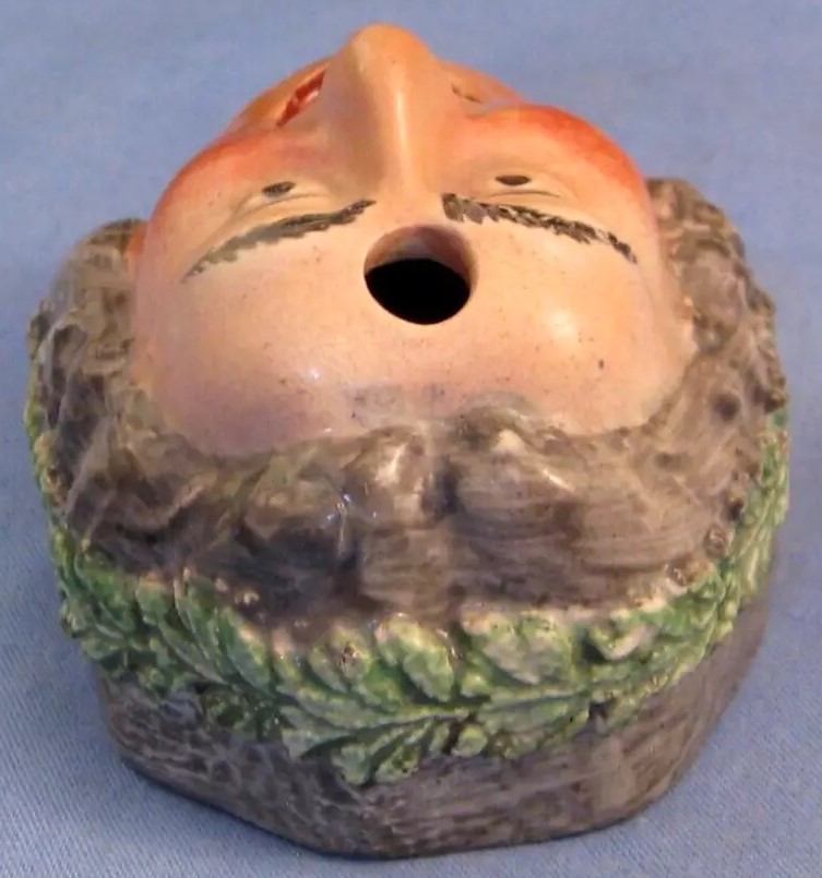 This ceramic inkwell is nicely detailed with Walpole’s grey hair and with a band of mistletoe around the sides. His mouth is wide open with a hole for dipping the pen and another hole on his forehead for resting the pen.