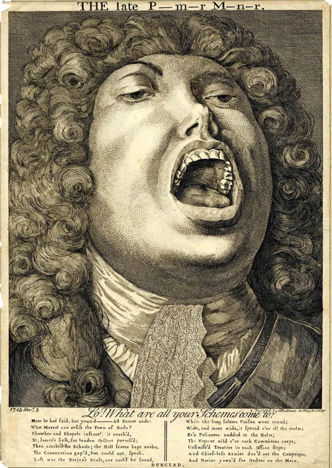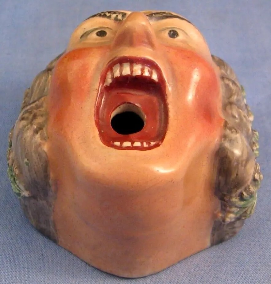 This inkwell is based on a caricature drawing by George Bickham the Younger dated 1743. Walpole is pictured yawning but in an even more grotesque manner than seen in this inkwell. Walpole’s mouth is wide open almost in the shape of a fish and with severe looking teeth jutting out from it. George Bickham the Younger (c. 1706–1771) was an English etcher, engraver, and one of the first English caricaturists. He produced didactic publications, political caricatures, and pornographic prints.