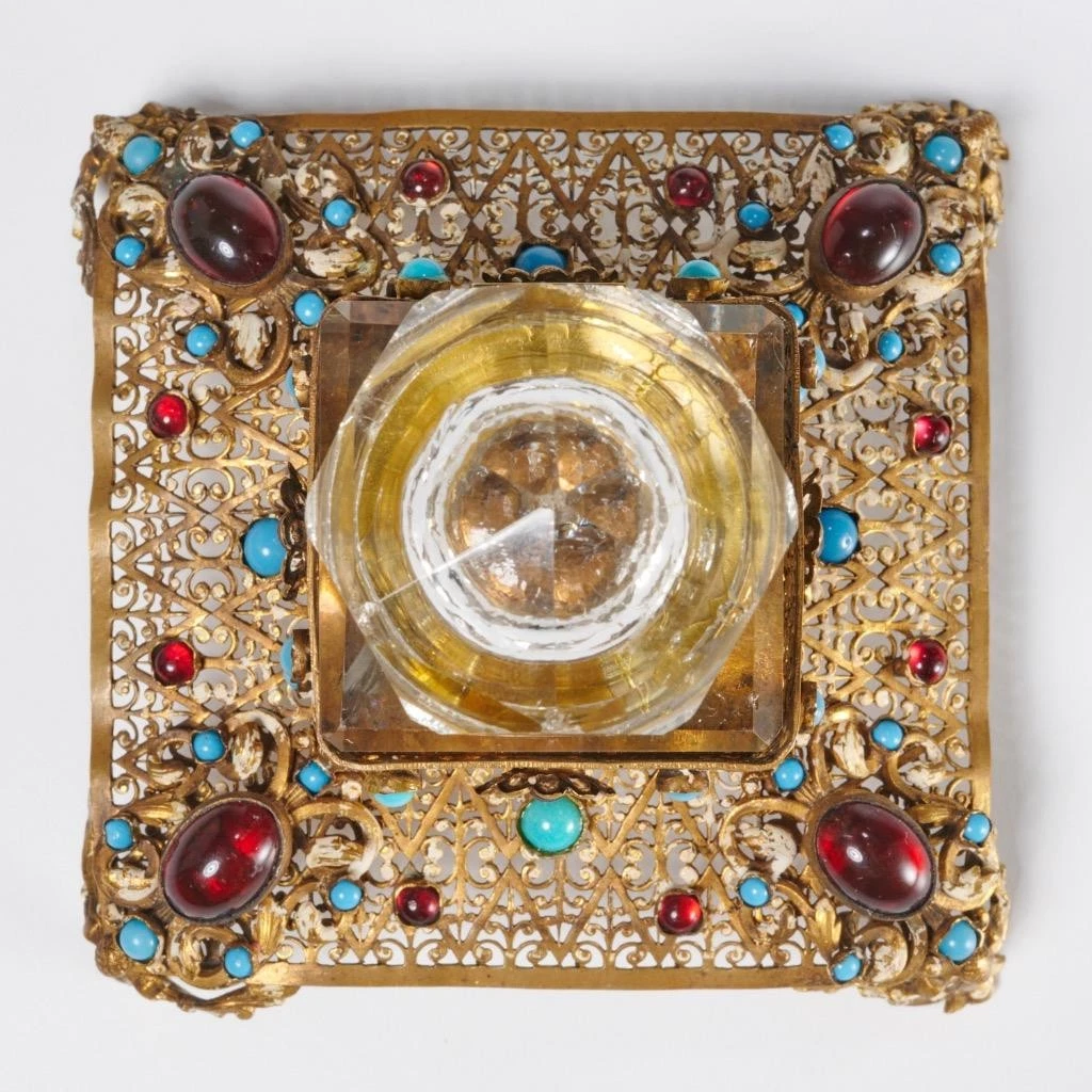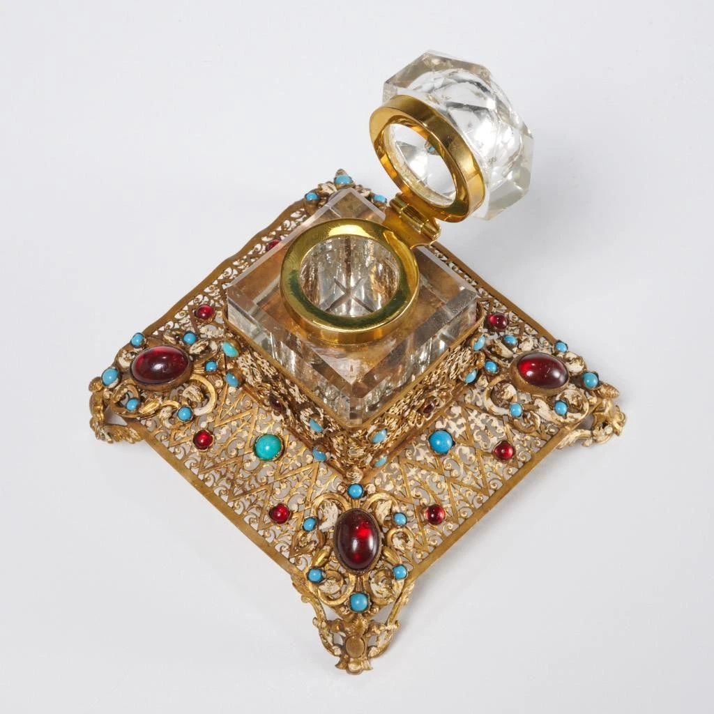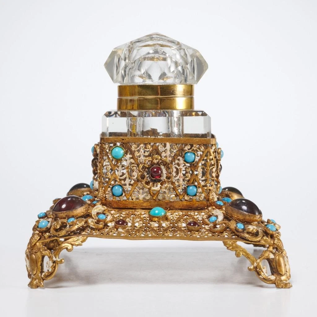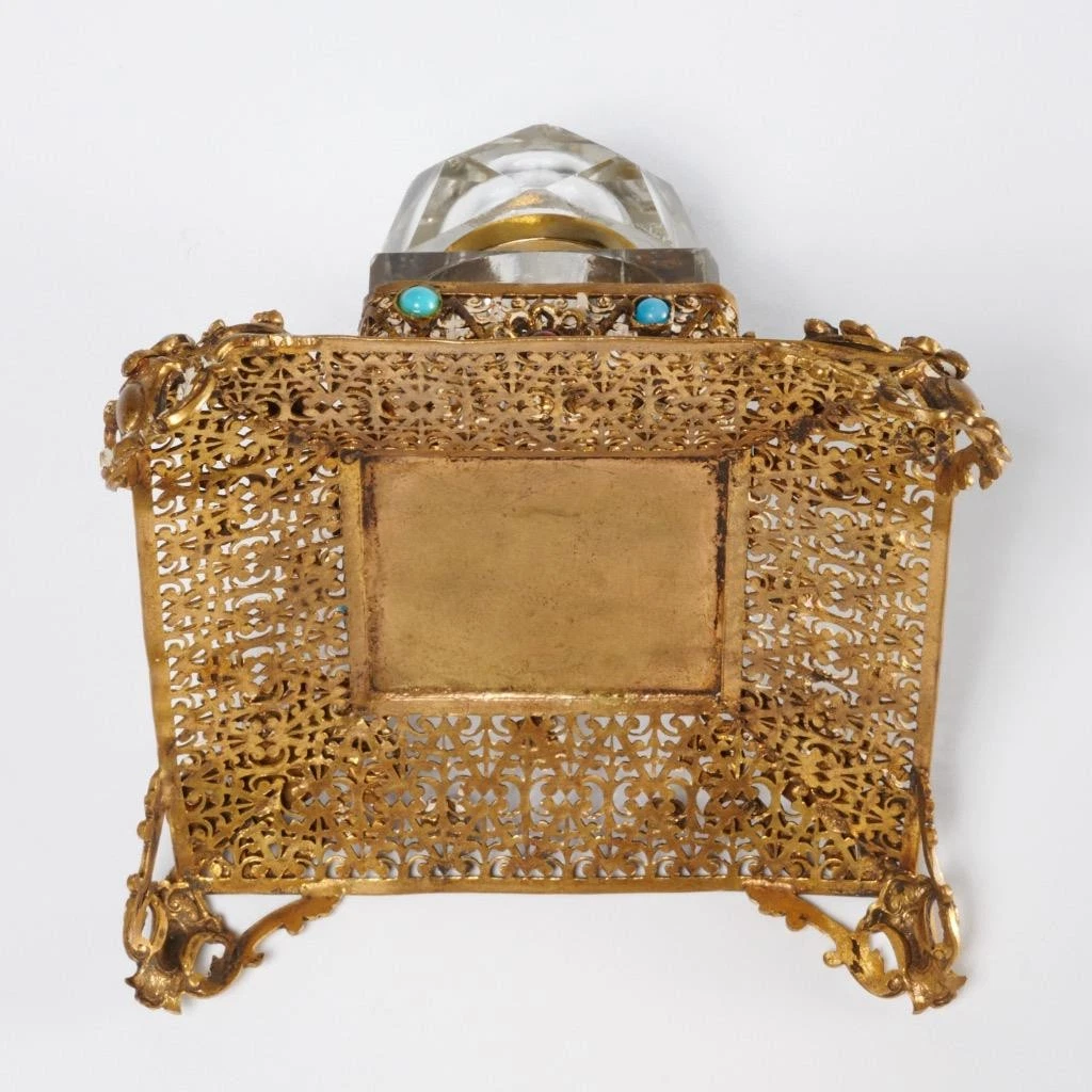 - Overall Form: An inkstand consisting of a highly decorative metal stand encasing a precision-cut crystal inkwell. This style is often referred to as Bohemian, Russian, or Continental in origin, reflecting the high standards of European crystal and metal factories.