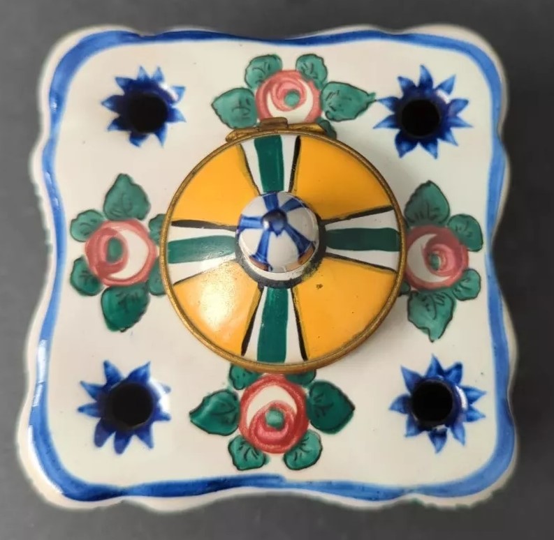 This is a nice example of a hand-painted faience pottery inkwell. The inkwell features a square base with rounded corners, supported by four small feet. The body is adorned with vibrant, hand-painted designs in blue, green, yellow, pink, and red, showcasing floral motifs and geometric shapes. The top edge of the inkwell has four pen holes. The hinged lid is decorated in yellow and green, and it is topped with a small, round knob. The bottom of the inkwell is marked “Aladin France”.