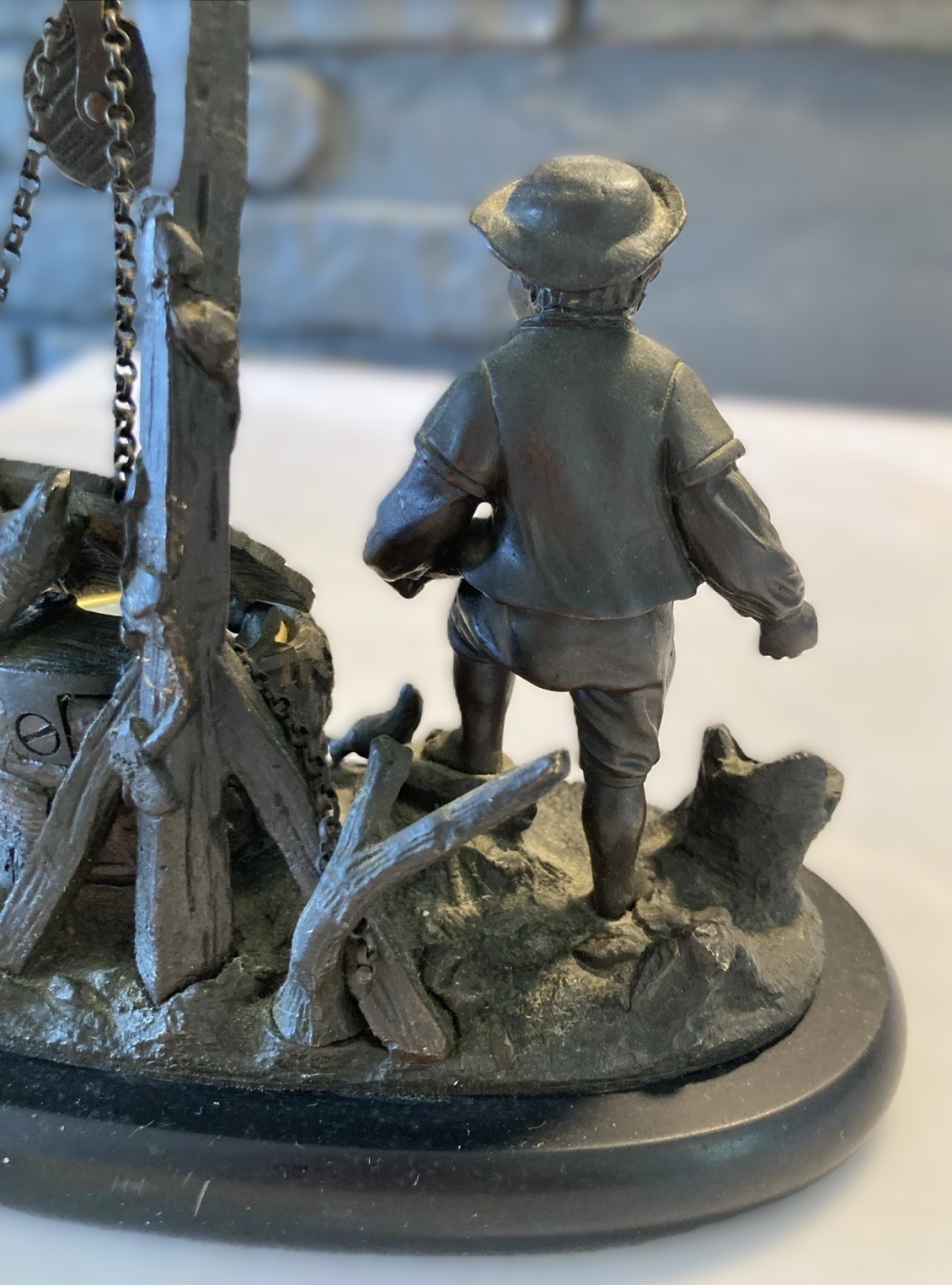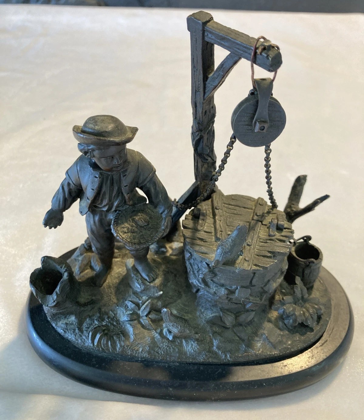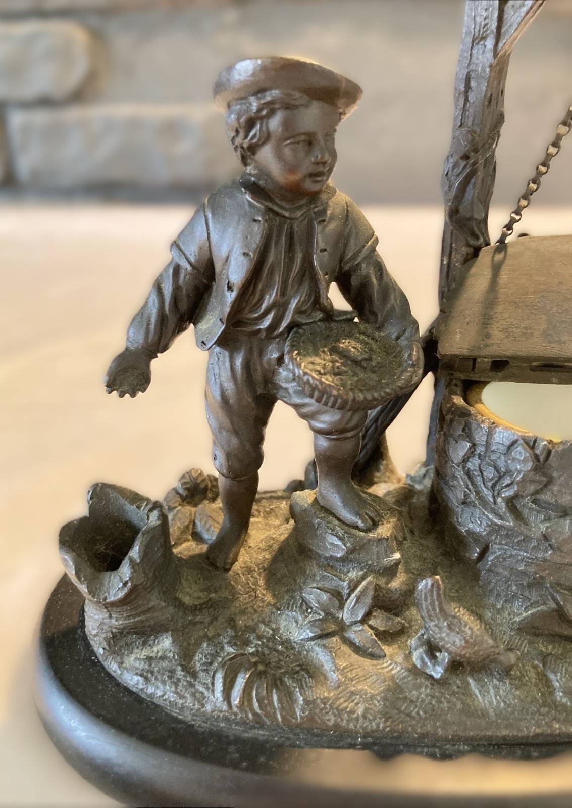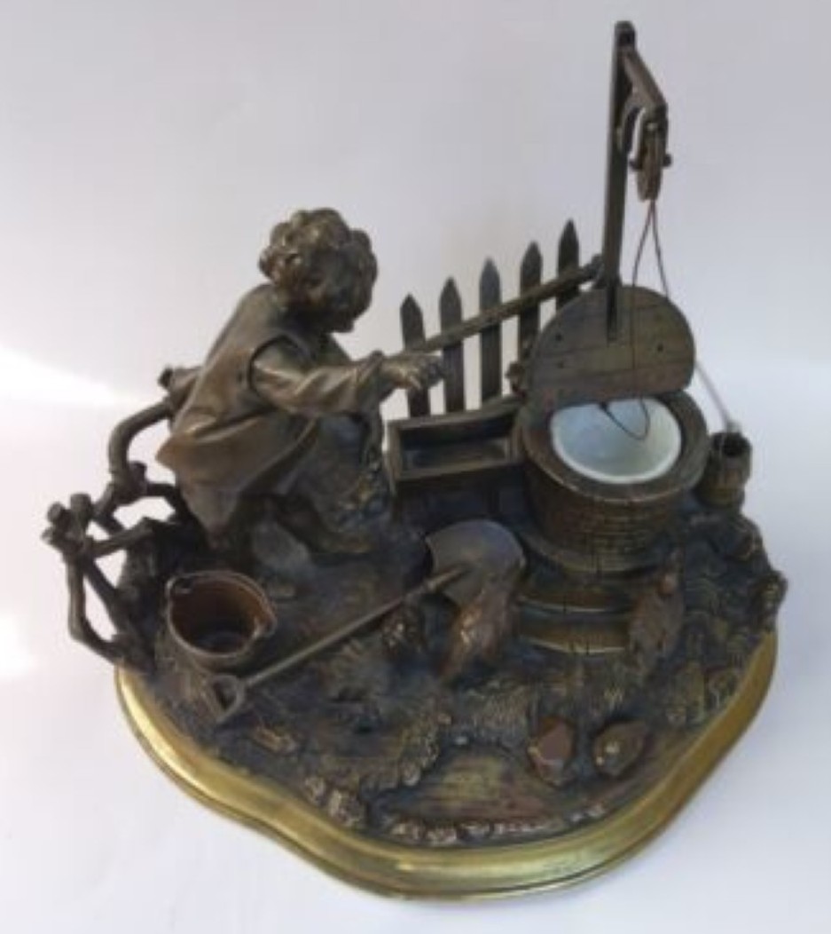 Summary: These are two variations of the same popular sculpture. The foundry utilized the same central mold (the boy and well) but created two distinct products by changing the base and background accessories.