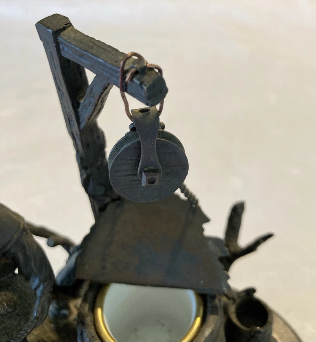 - The Setting (No Fence): unlike the first inkstand, this version does not have the picket fence background. Instead, it features a simpler, more open composition with just the central post holding the pulley mechanism.