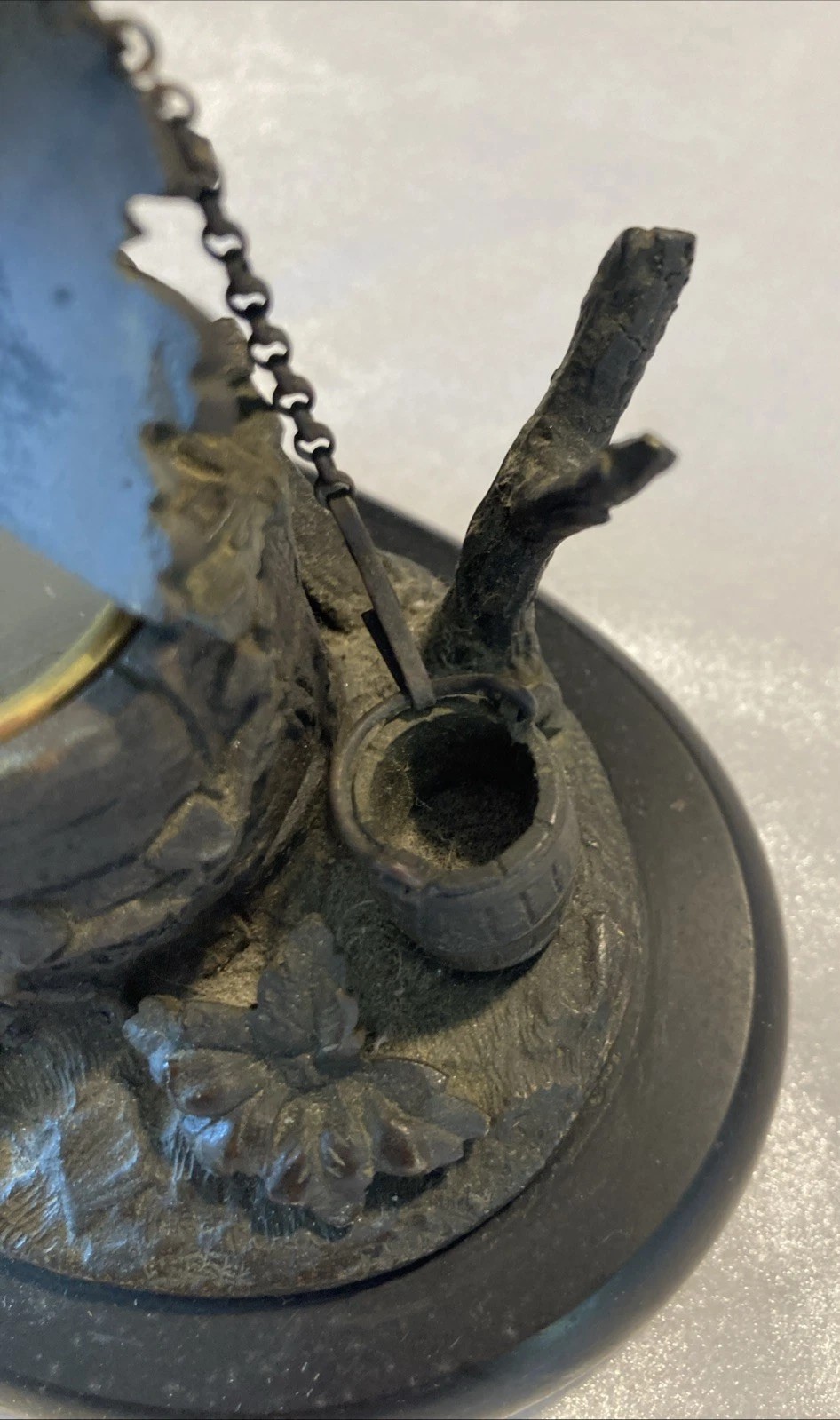 - To open the inkwell, you would normally lift the lid, and the pulley serves as a decorative (and perhaps partially functional) guide for the cord.