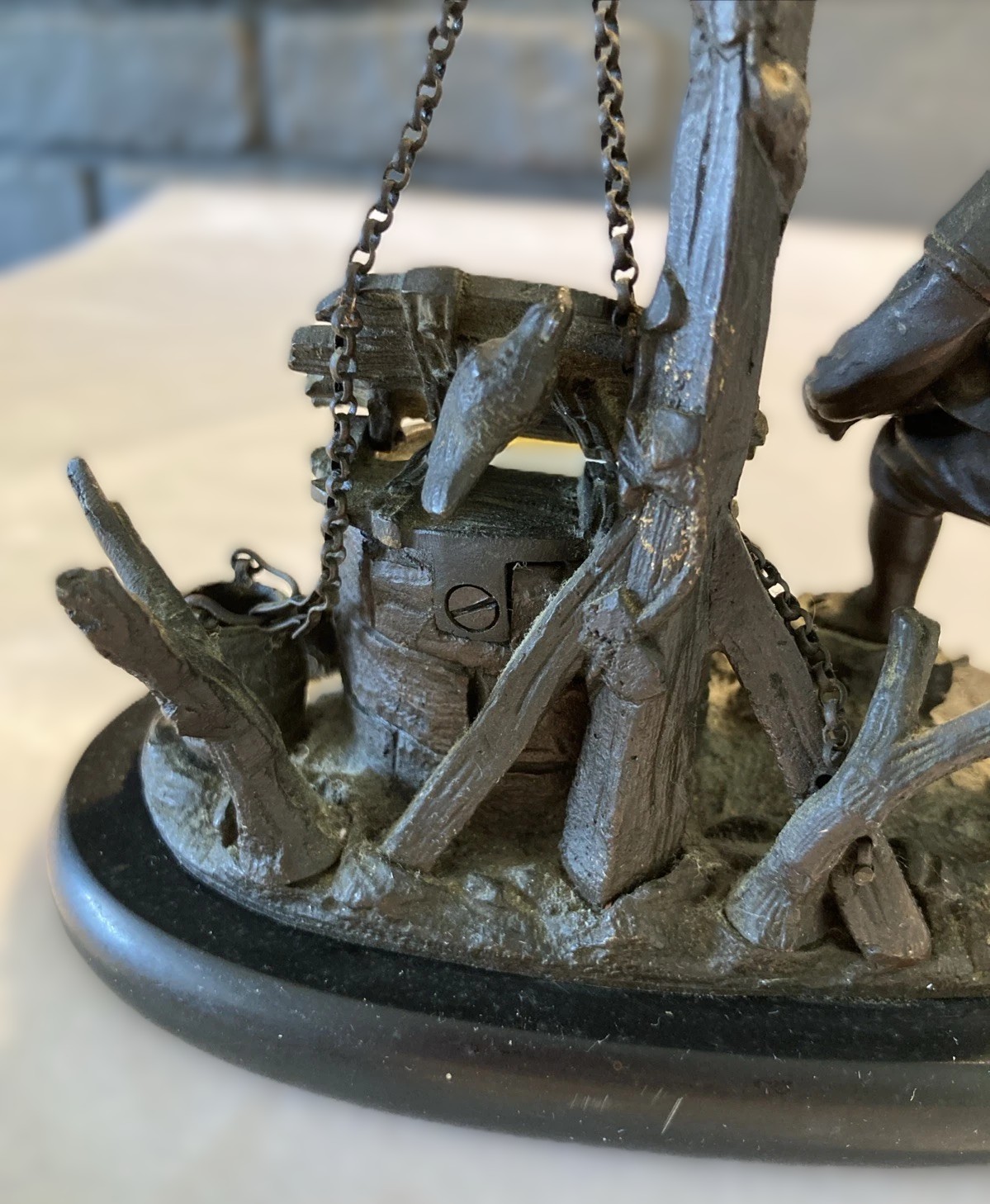 - The Base: This version is mounted on a heavy, oval base of slate rather than the elaborate Rococo metal base of the first one. The metal “ground” works are minimized here, focusing all attention on the figure and the well.