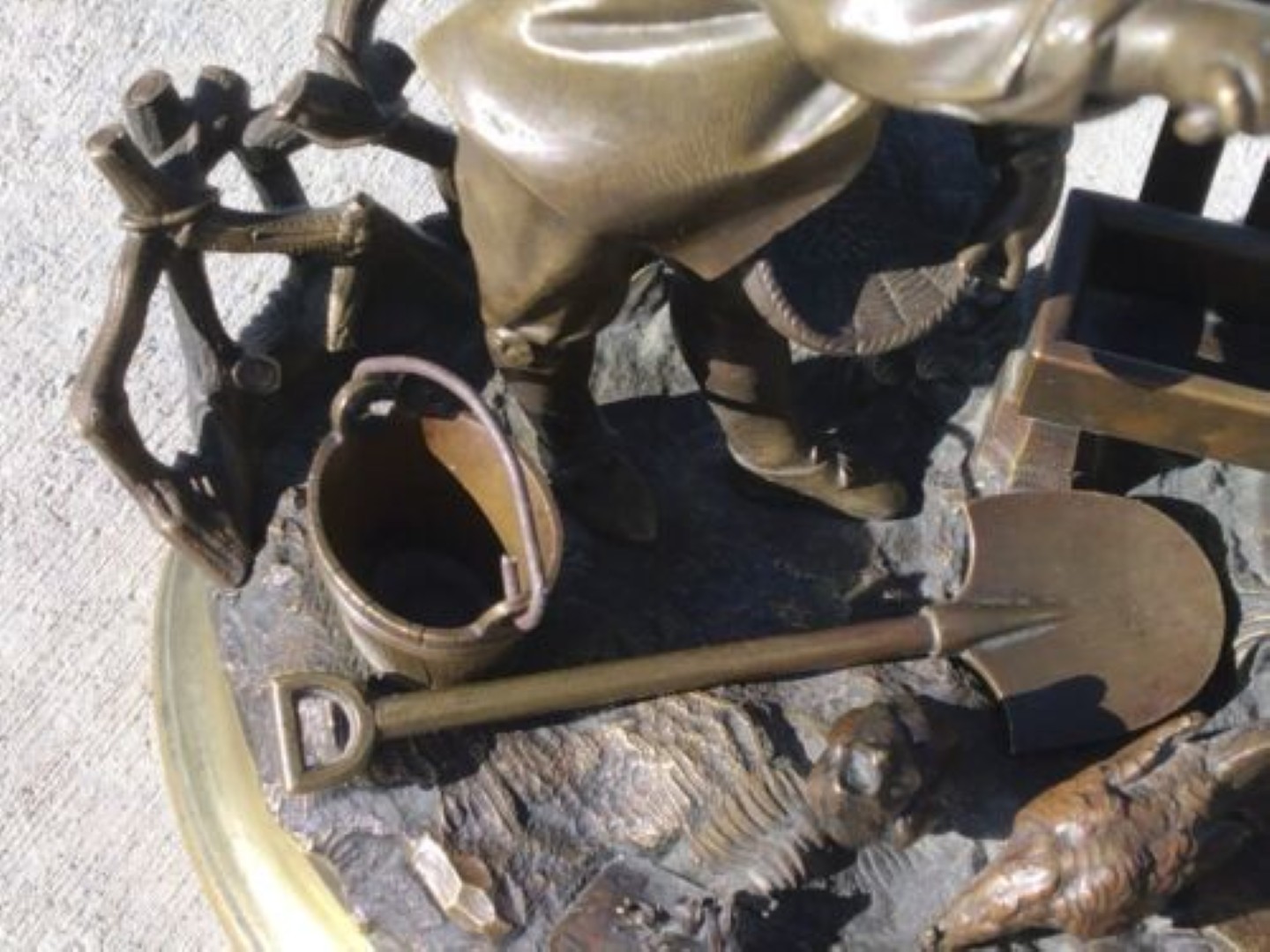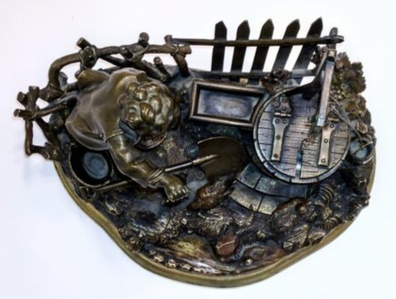 - Finish: The patina combines dark bronze tones with lighter brass/gold highlights on the base and fence to accentuate the details.