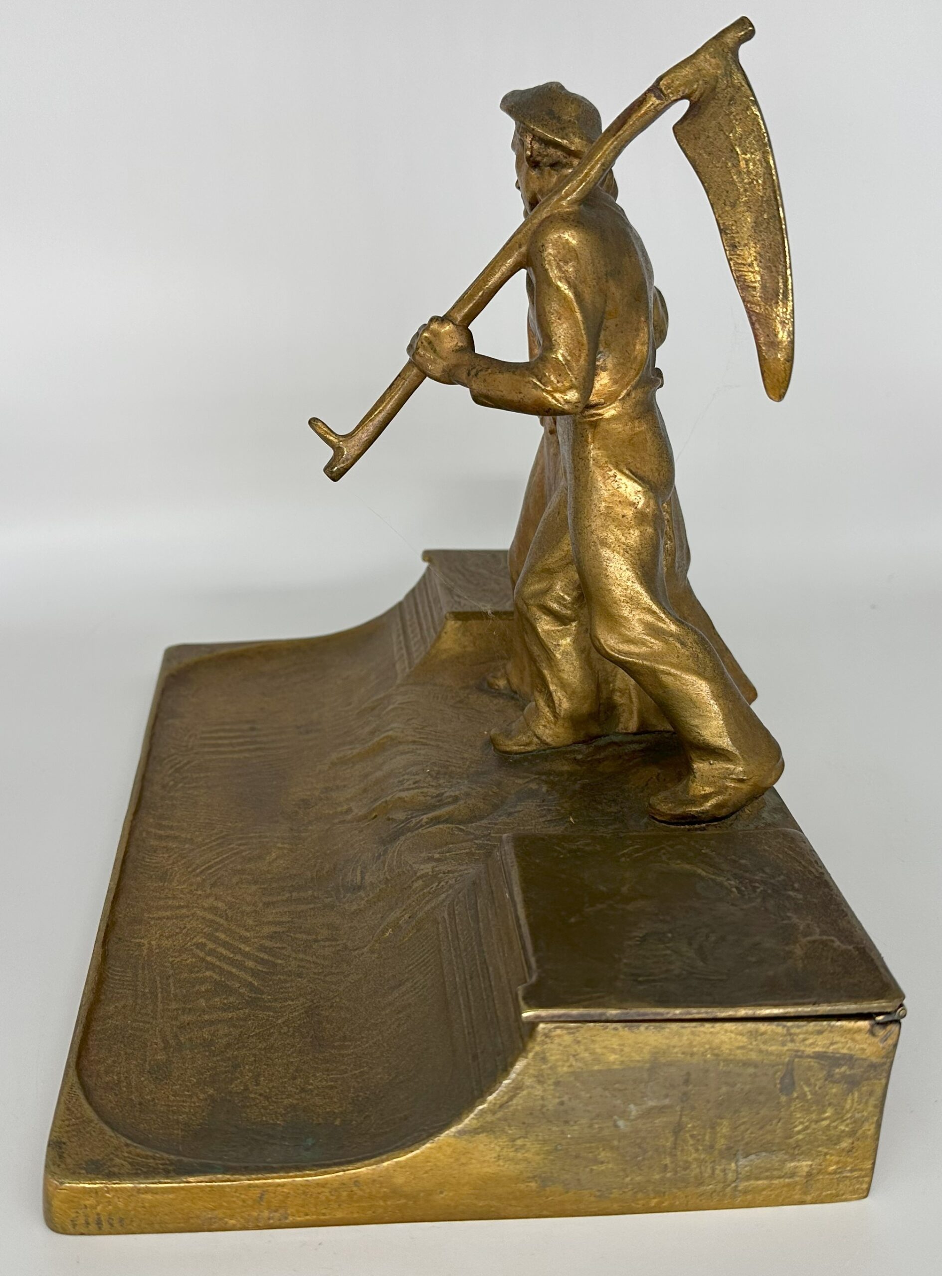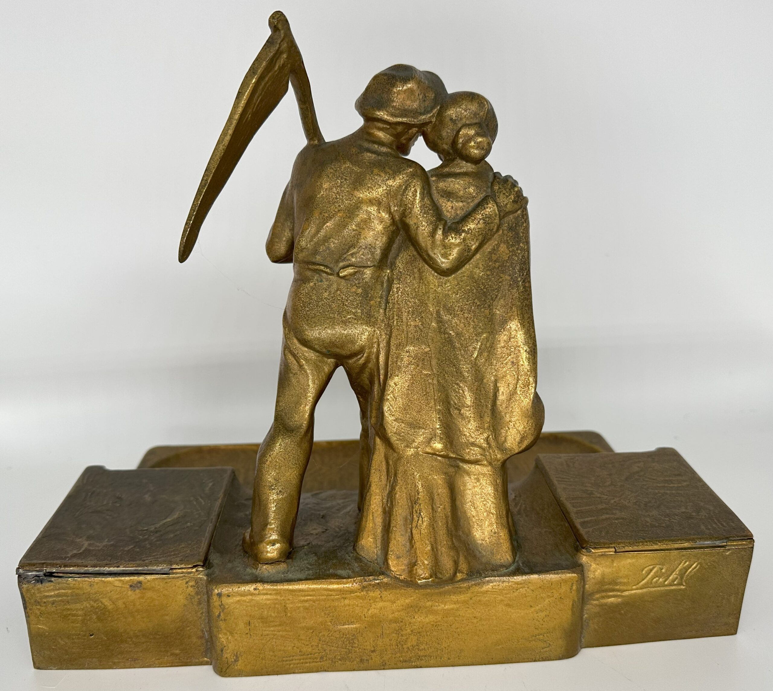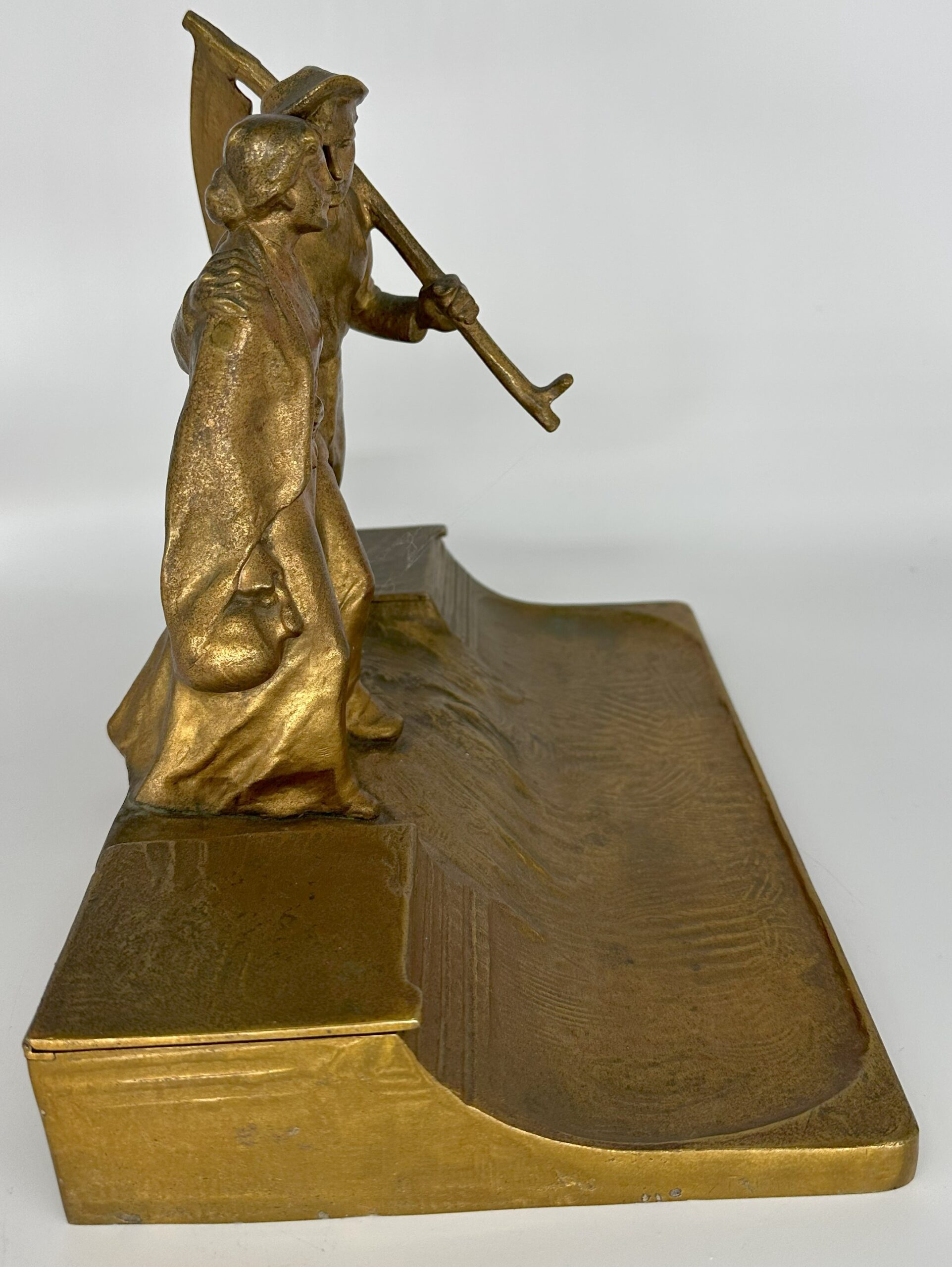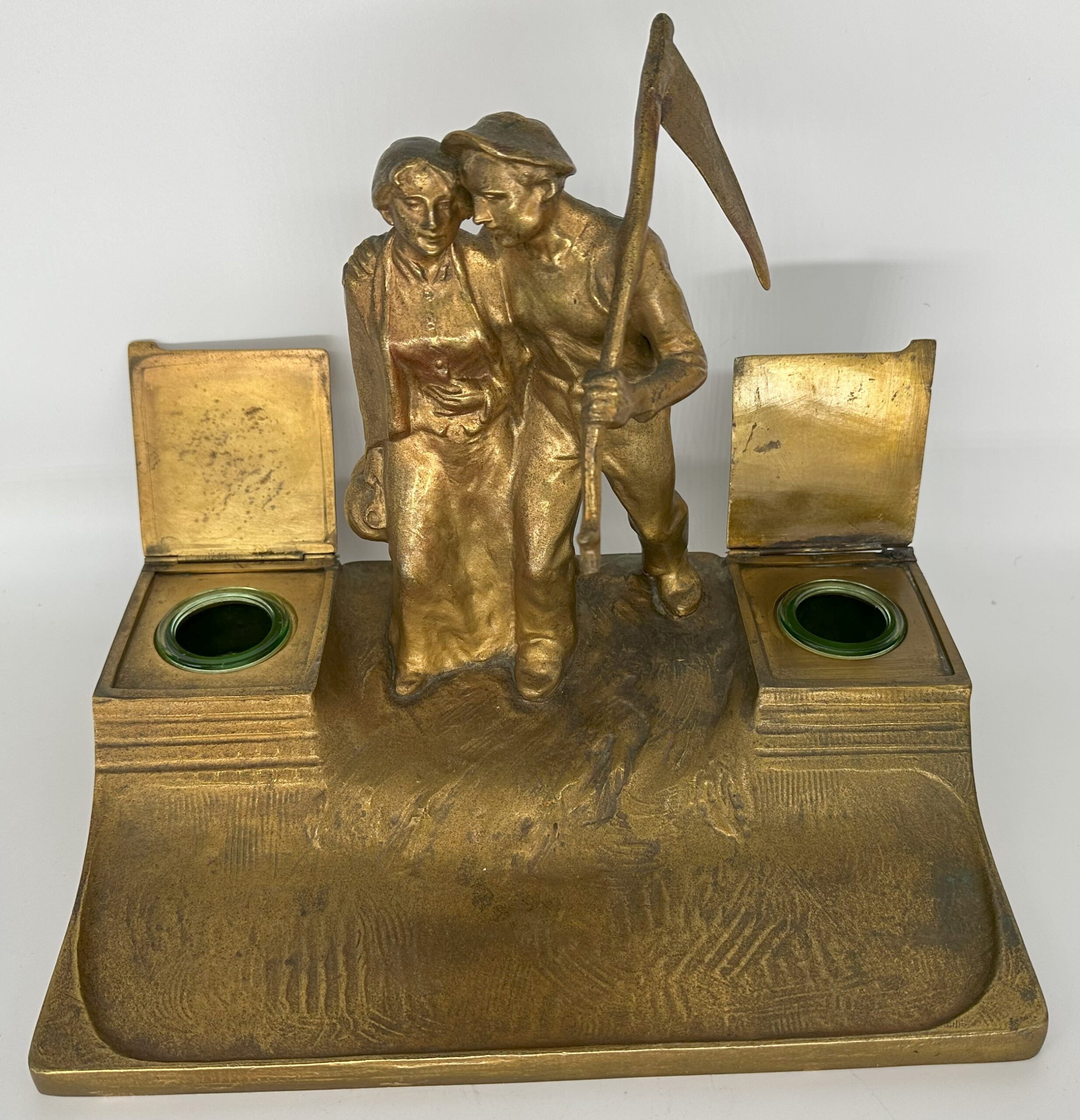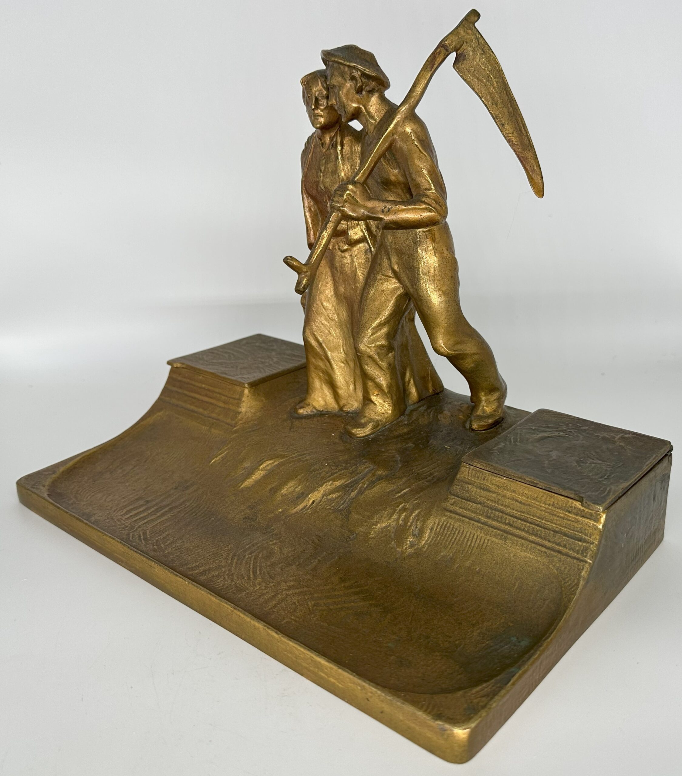 This gilt bronze inkstand features a farming couple walking together. He carries a scythe in one hand, his other arm is around her shoulder. The woman carries a water jug. The couple stands between two inkwells with hinged covers. This Social Realist bronze inkwell with a large pen tray is signed on the back “Pohl”. Adolph Joseph Pohl was an Austrian artist and bronze sculptor lived from 1872 to 1930.
