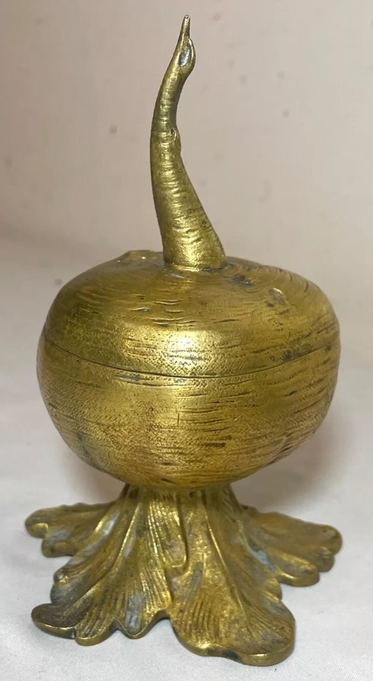 This brass inkwell is designed to resemble a beet. The body of the inkwell is rounded and textured to mimic the naturals lines and grooves of a beet’s bulb. At the top, a long, curved root serves as a finial when opening the hinged center. The base resembles spread out leaves.