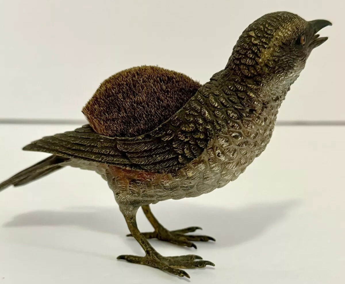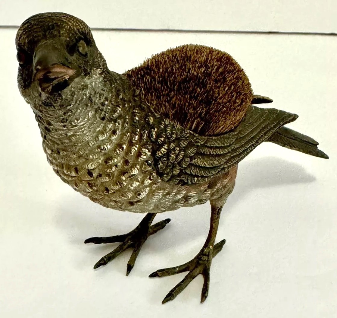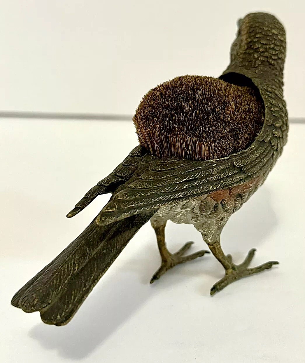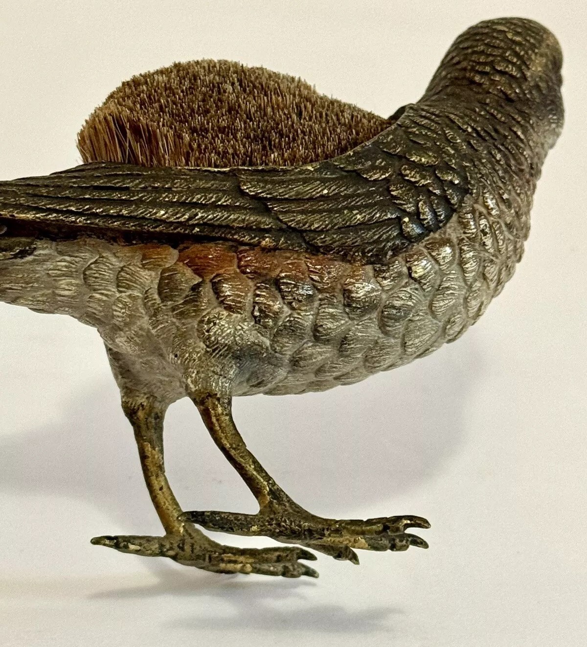 This is a cold painted bronze pen wipe designed to resemble a bird. The bird is intricately detailed to mimic feathers and stands on two feet with distinct claws. The back of the bird features bristles, likely made from natural boar’s hair, used for cleaning pen nibs. The underside is marked “Geschutzt,” indicating that the design is protected or patented in German.