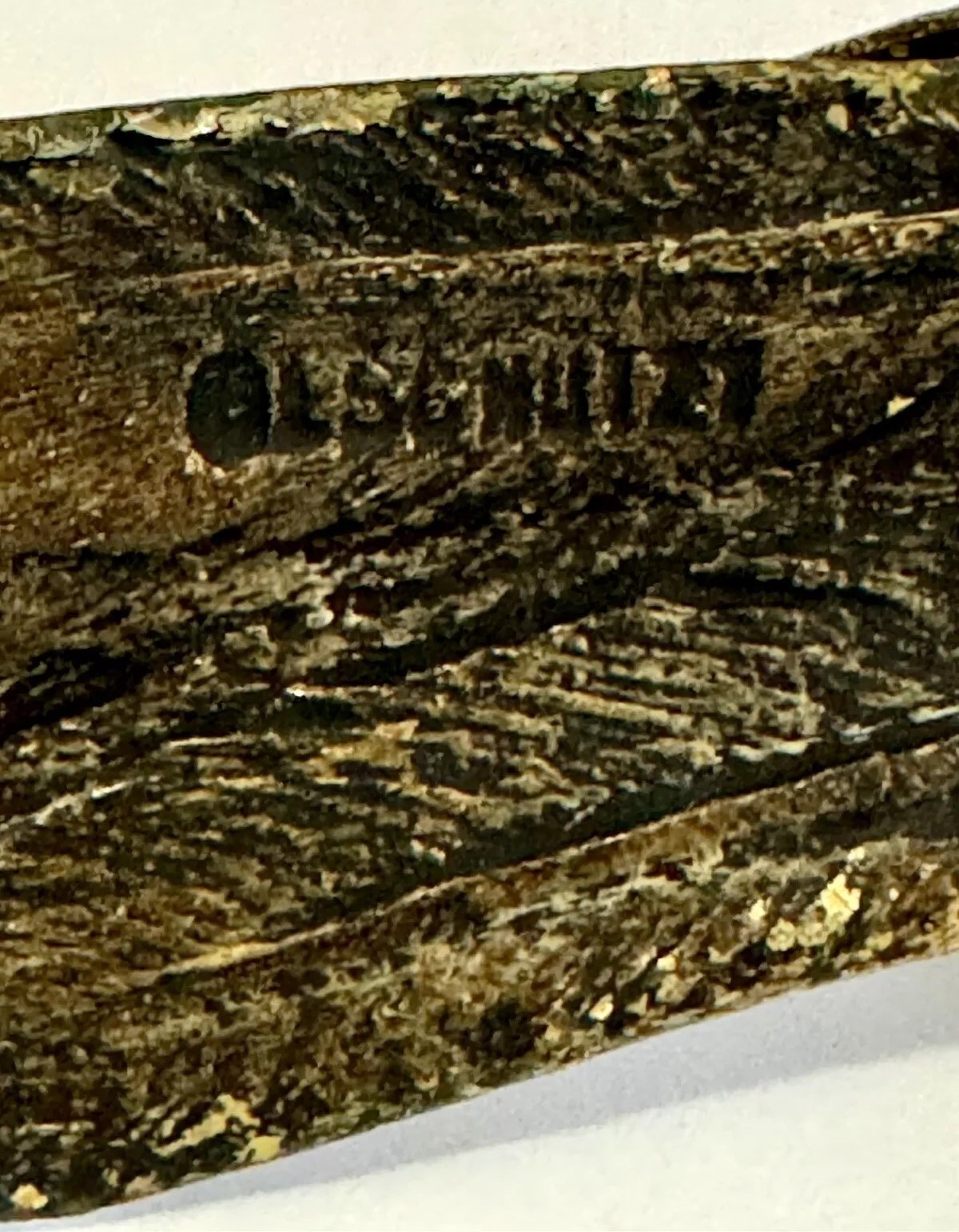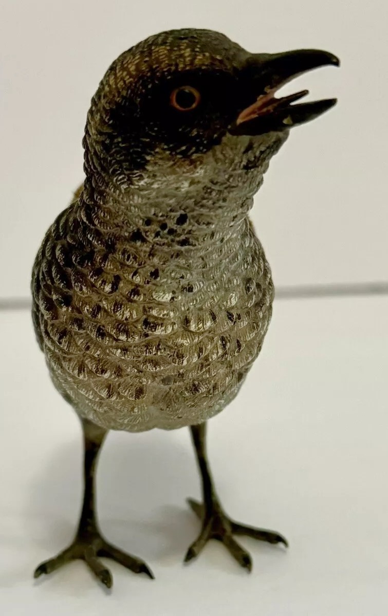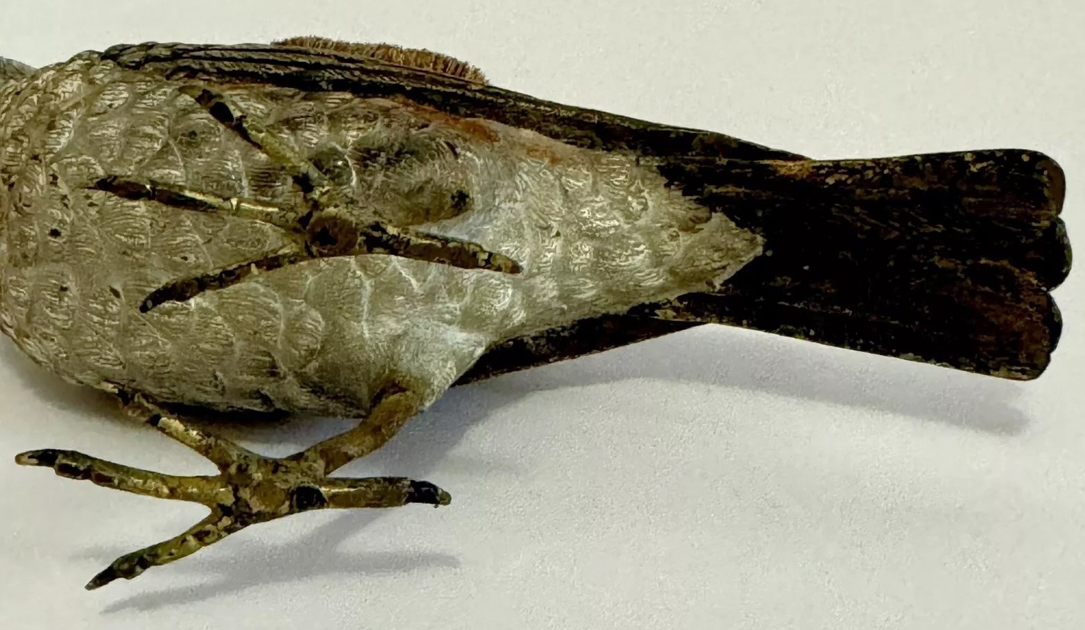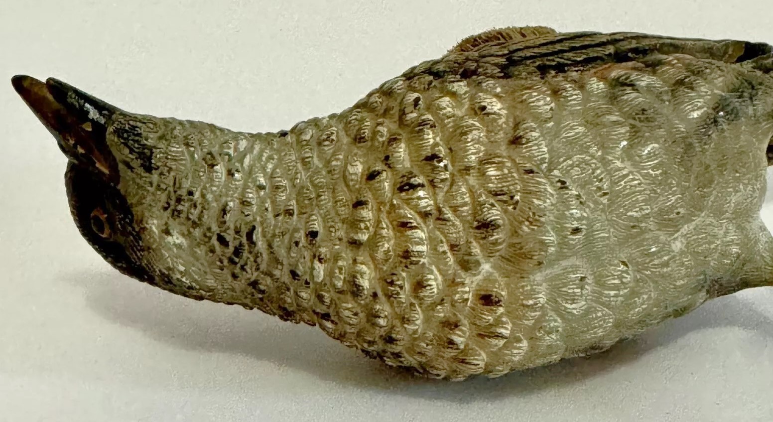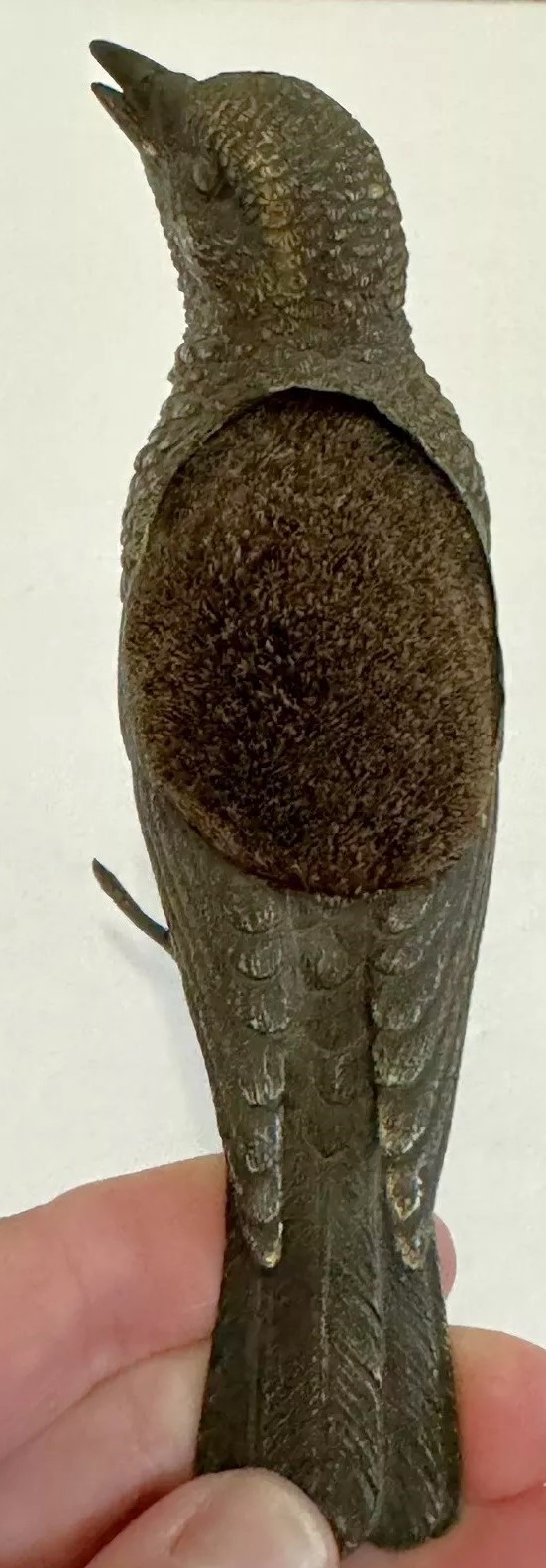 This is a cold painted bronze pen wipe designed to resemble a bird. The bird is intricately detailed to mimic feathers and stands on two feet with distinct claws. The back of the bird features bristles, likely made from natural boar’s hair, used for cleaning pen nibs. The underside is marked “Geschutzt,” indicating that the design is protected or patented in German.