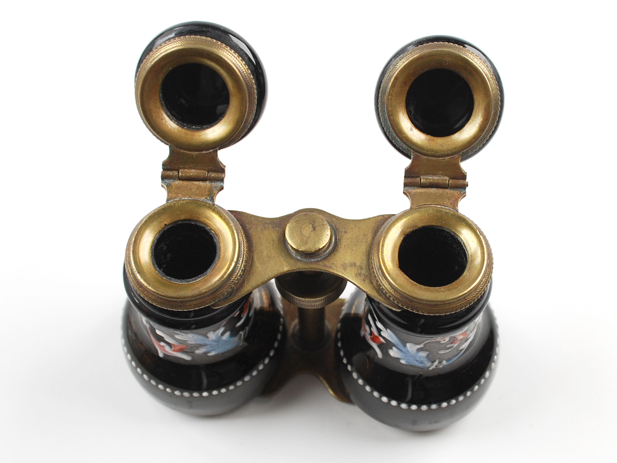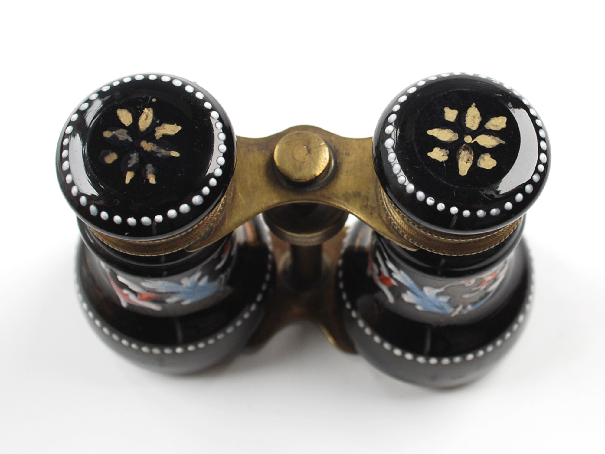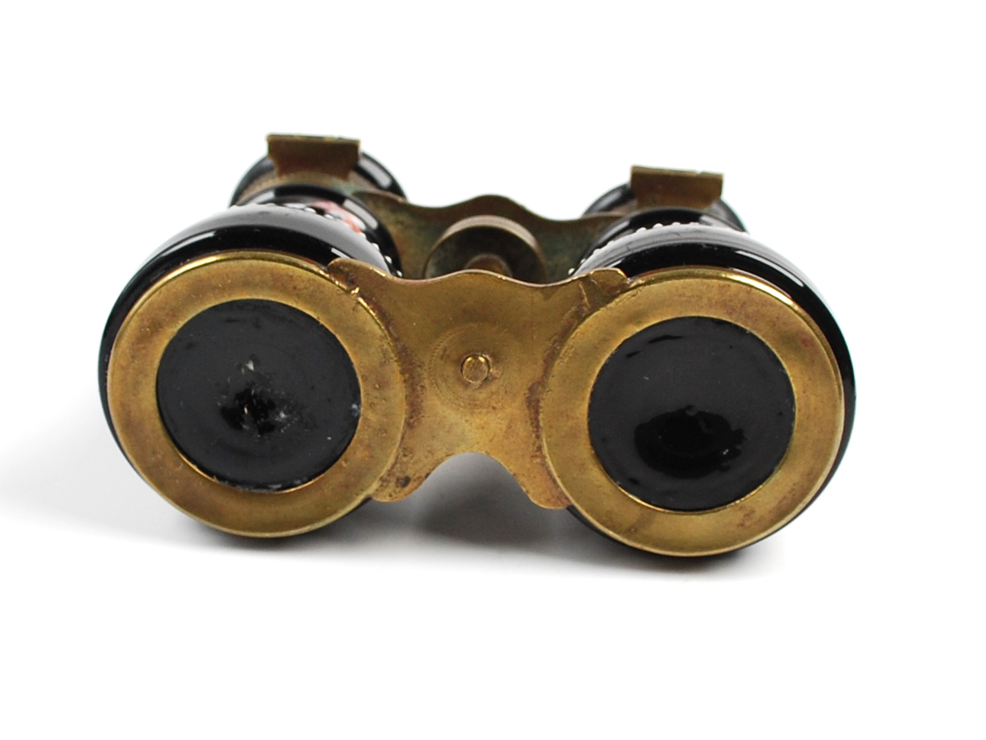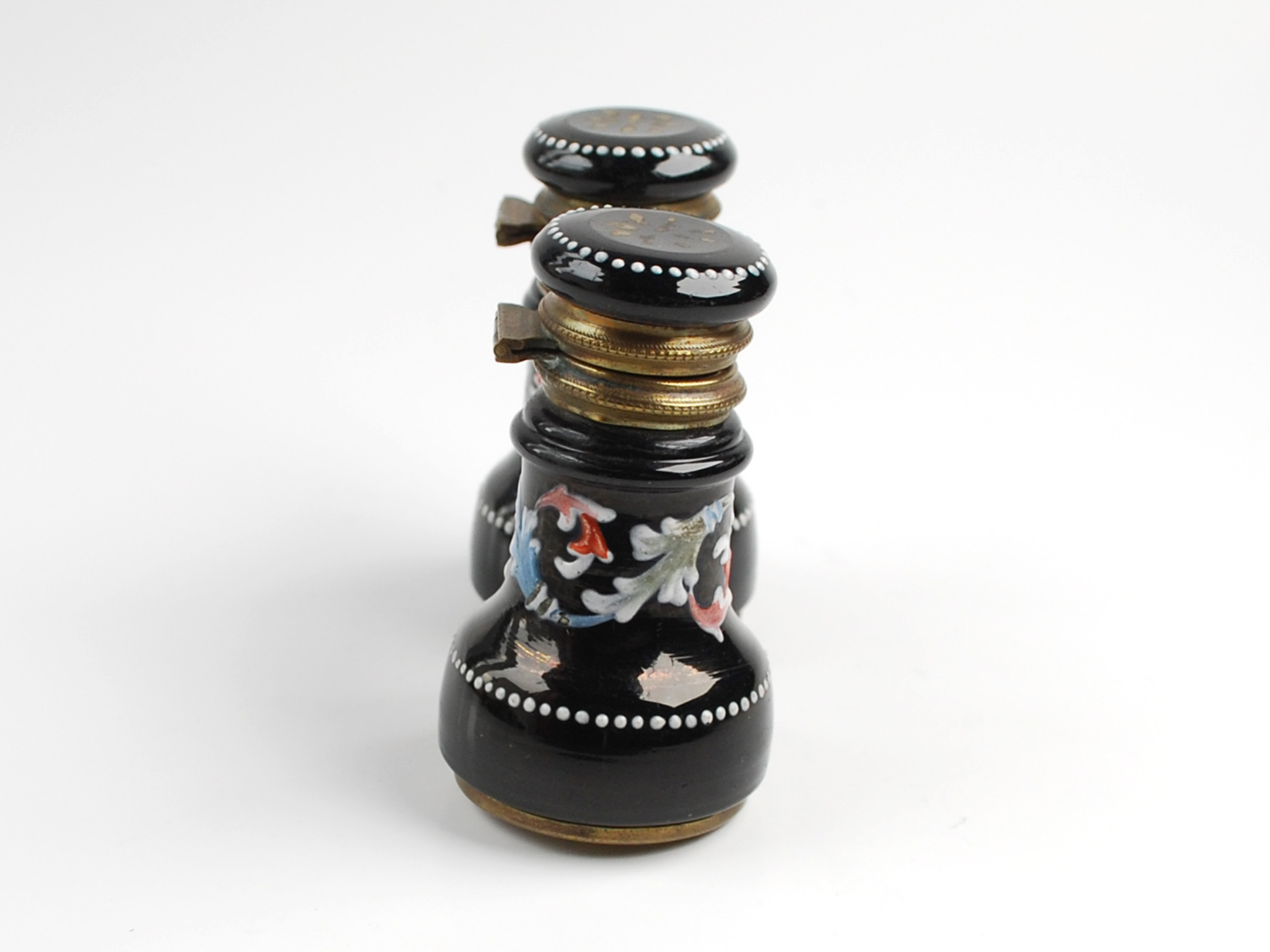 This figural double inkwell was designed to look like a pair of opera glasses, or binoculars. They are made of black glass which was enameled in a colorful scroll pattern. The lids are hinged; the brass collars are nicely tooled with decorative bands and were gilded. The holder is also made of brass, or possibly bronze. These do not have inserts; I am not sure if they did originally. If so, they would have been very small and thin glass inserts. Since the glass is black, it is possible the maker did not see a need for inserts.