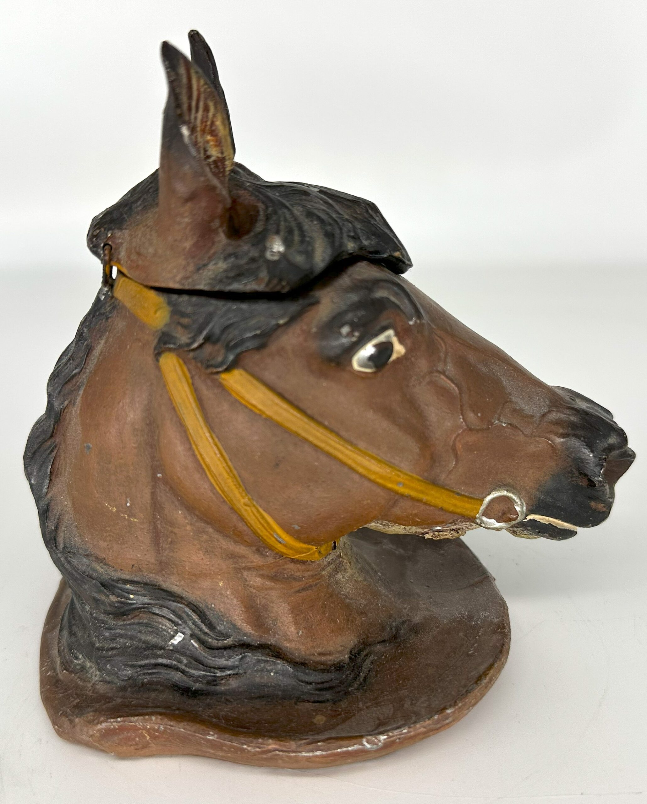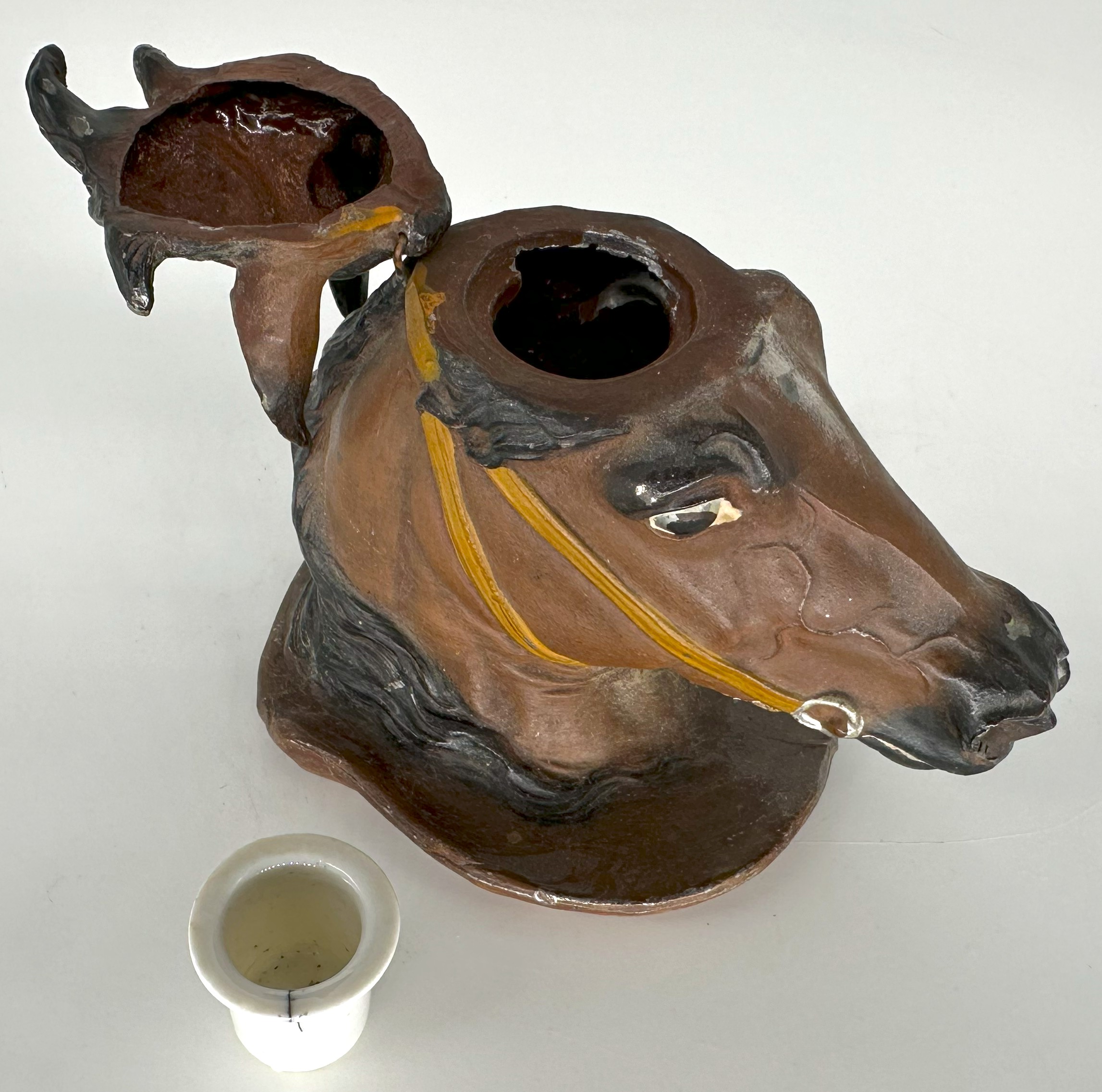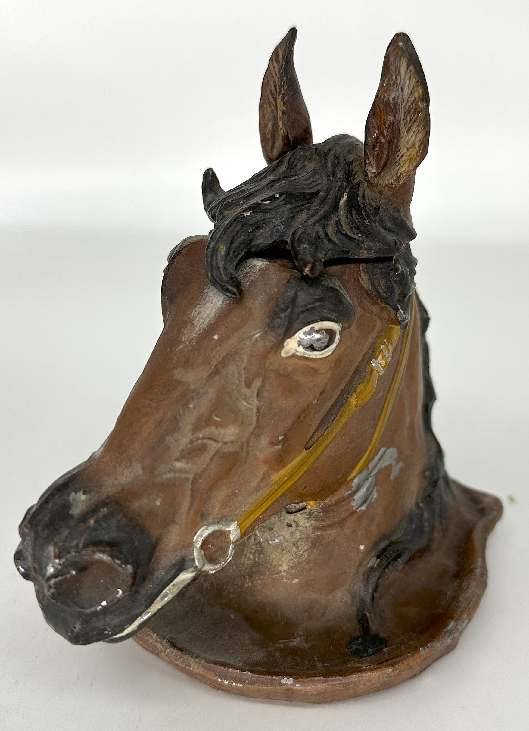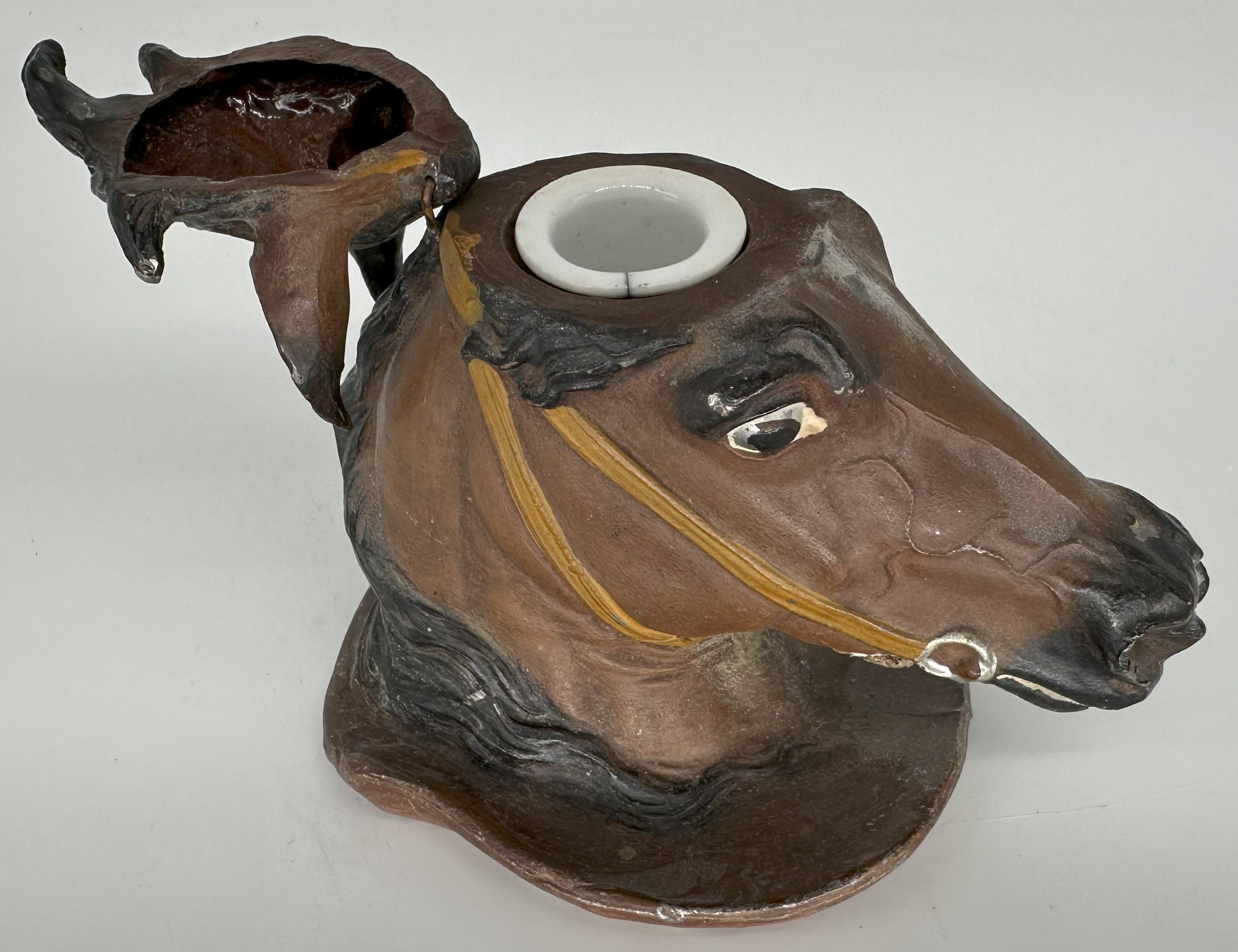 Two similar examples of a figural inkwell shaped like a horse’s head are pictured. Example #1 is pictured on the left and example #2 is on the right.