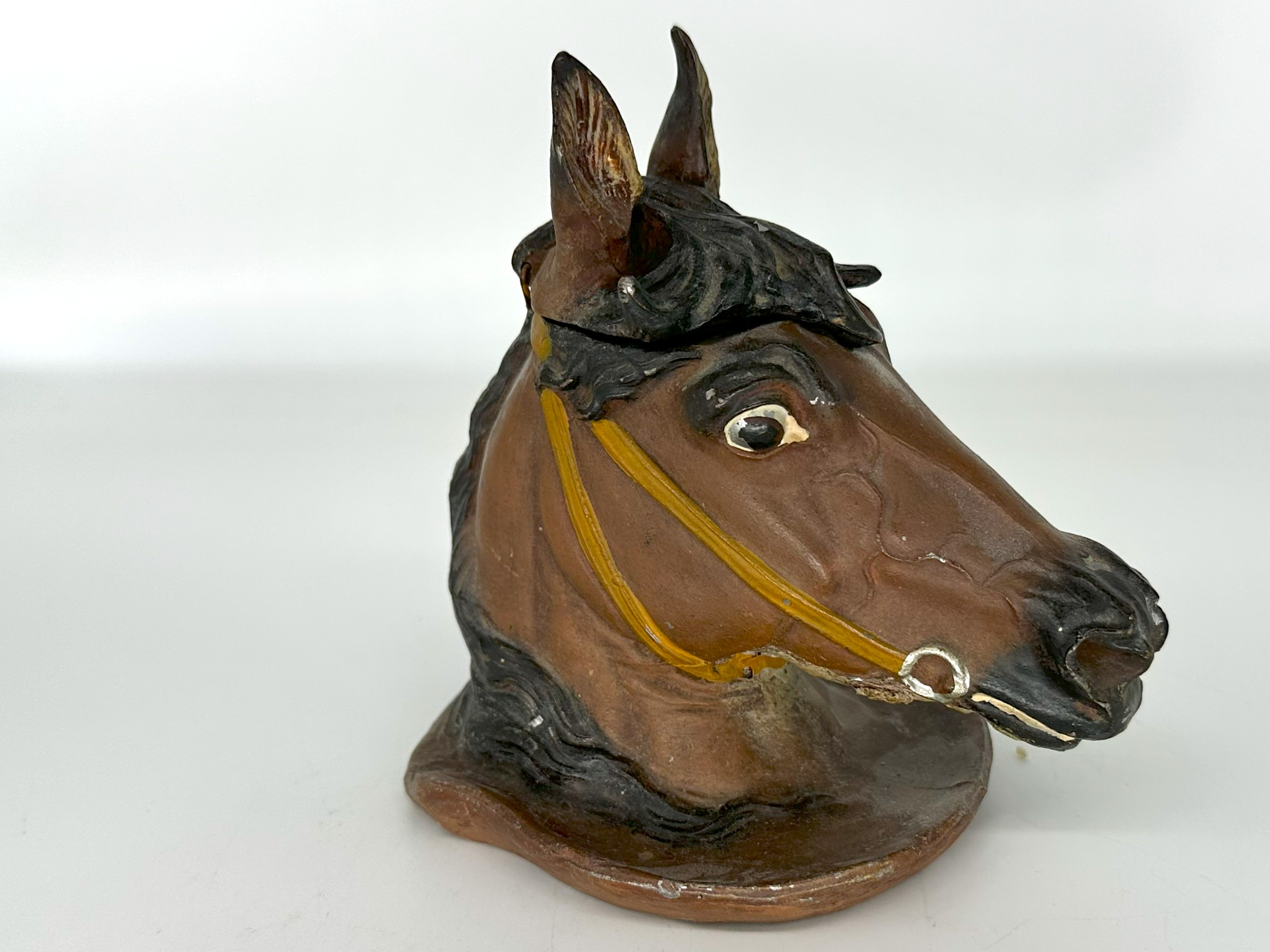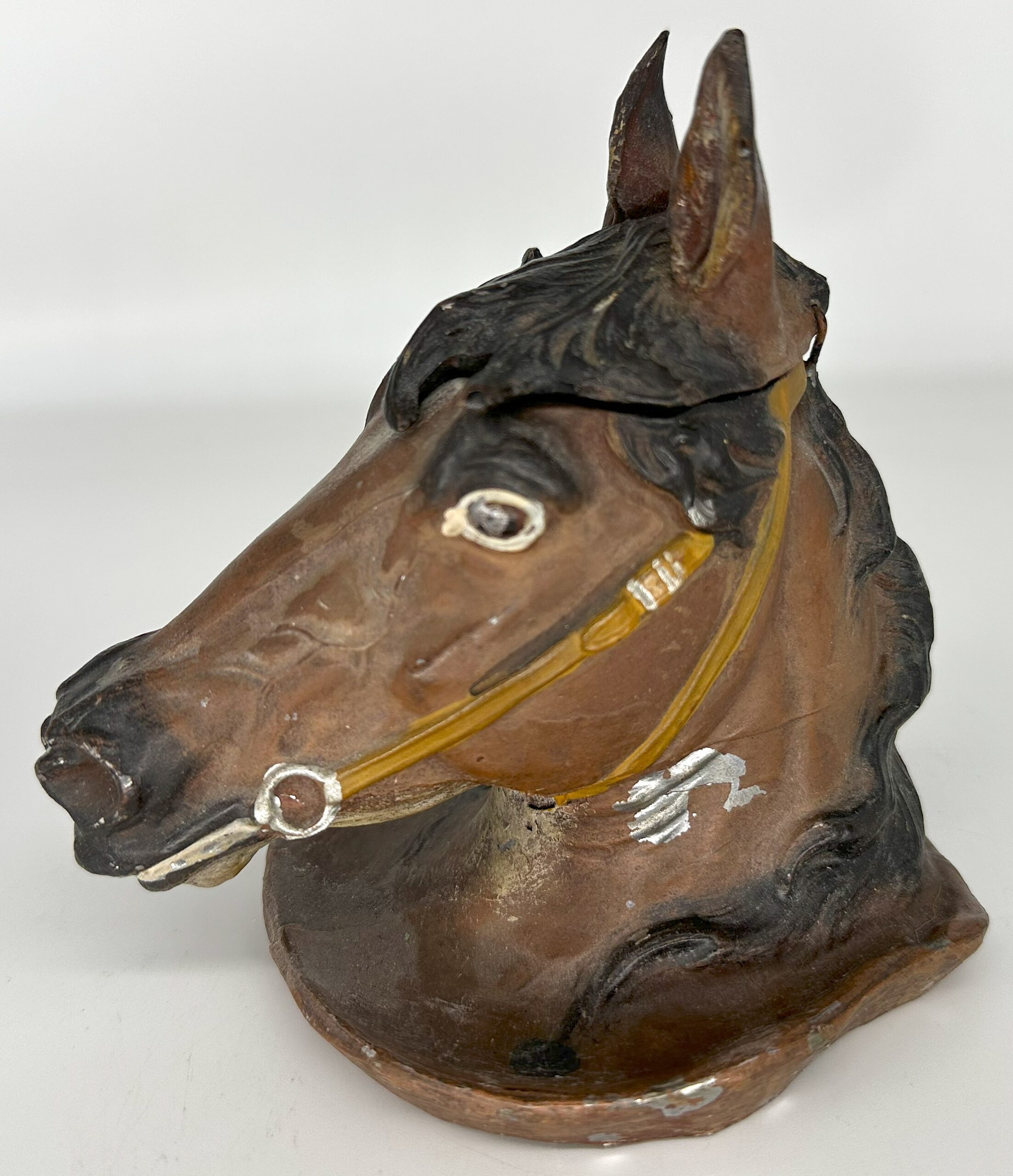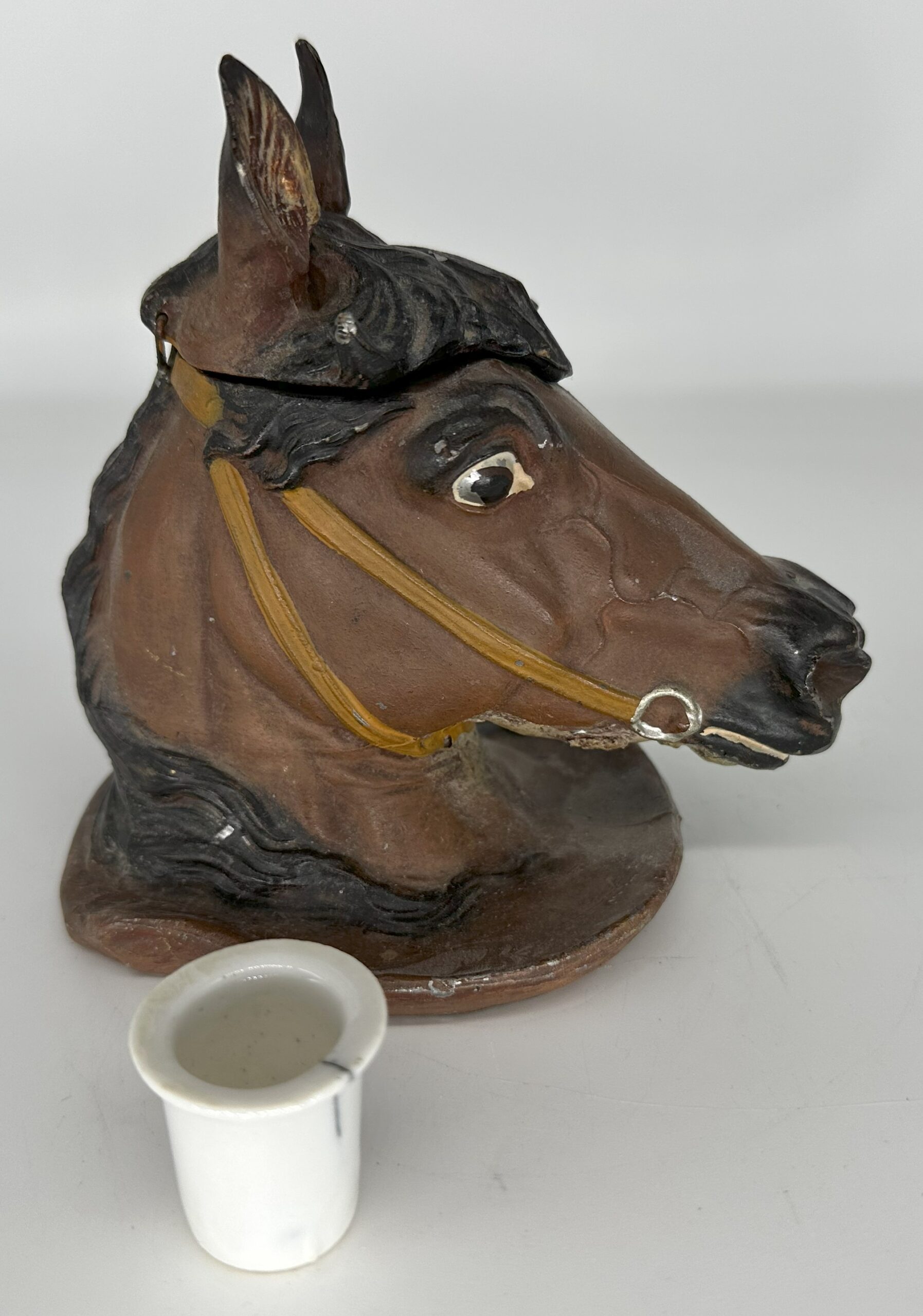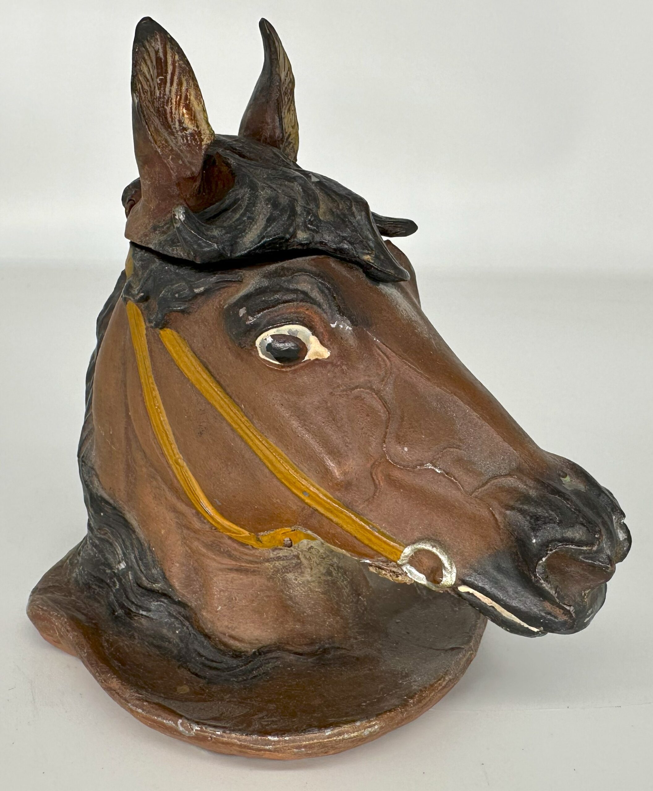 Two similar examples of a figural inkwell shaped like a horse’s head are pictured. Example #1 is pictured on the left and example #2 is on the right.
