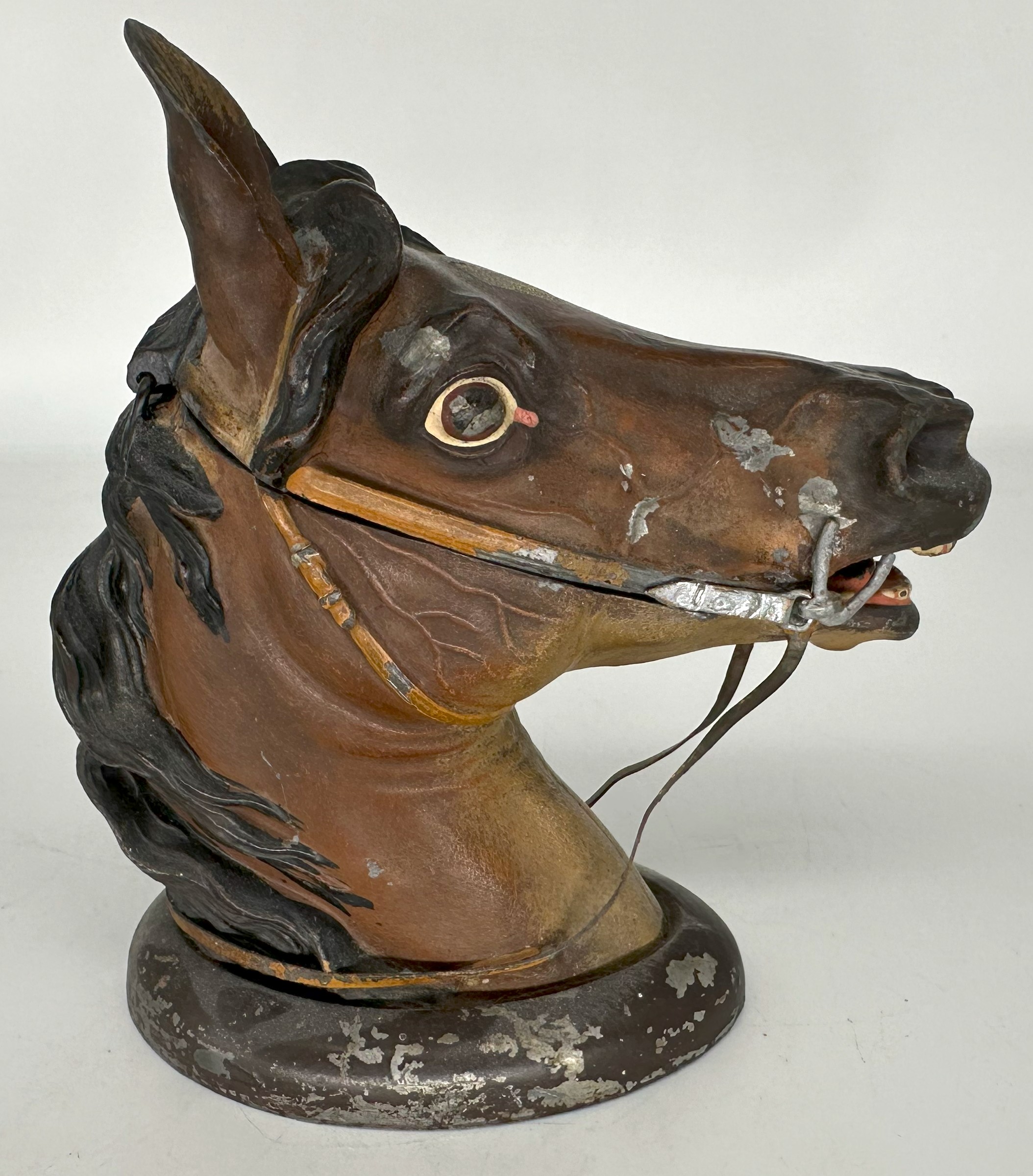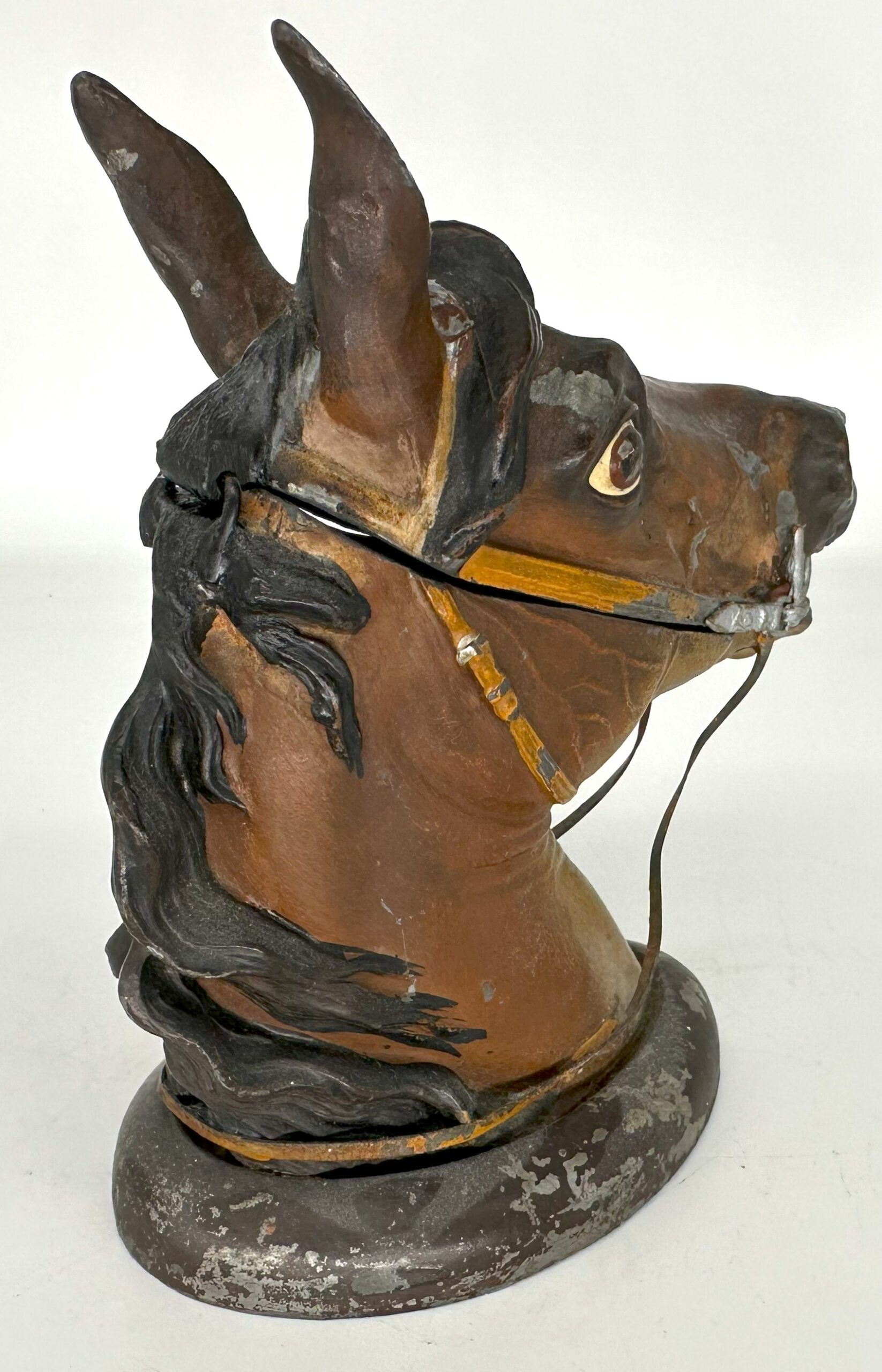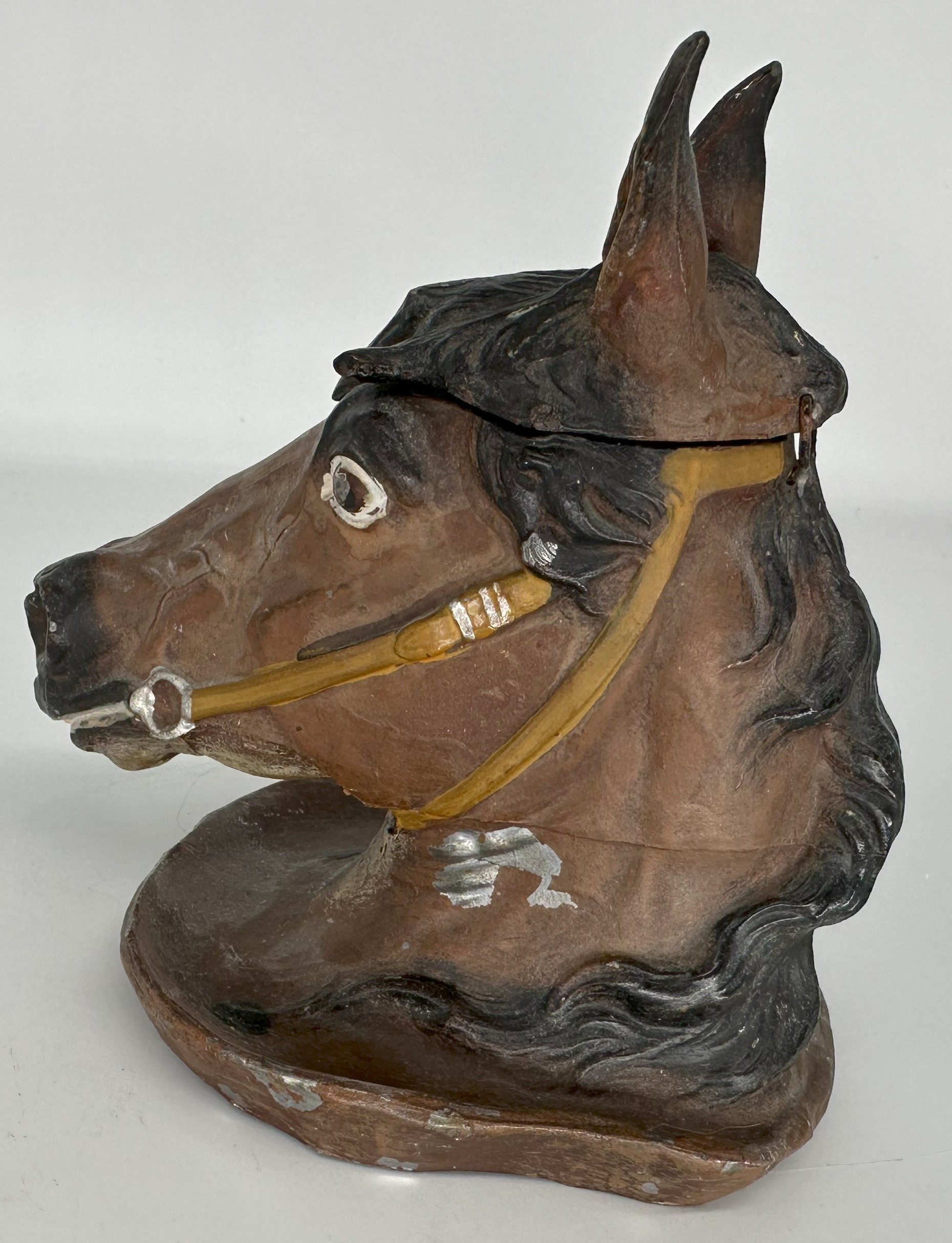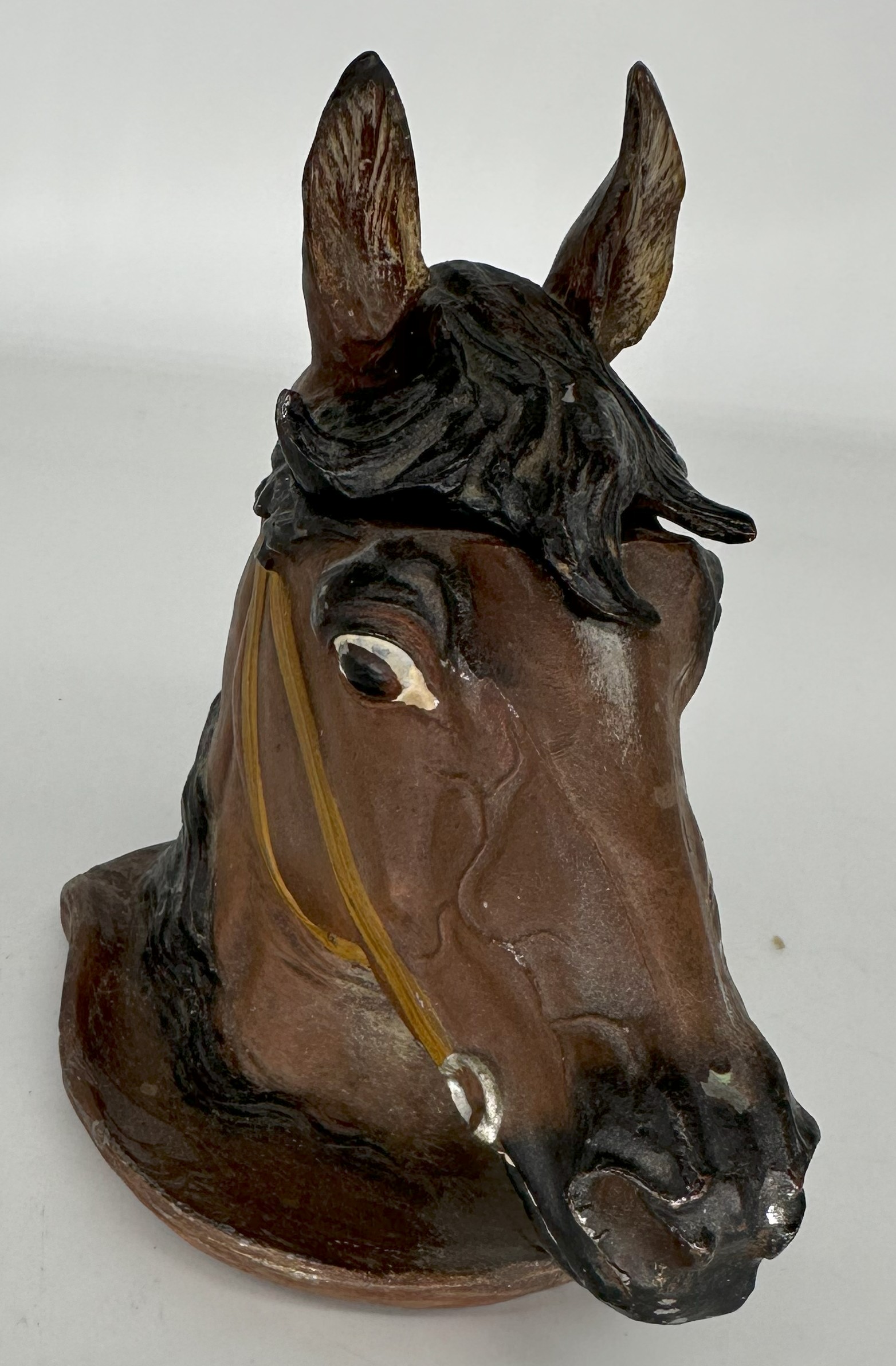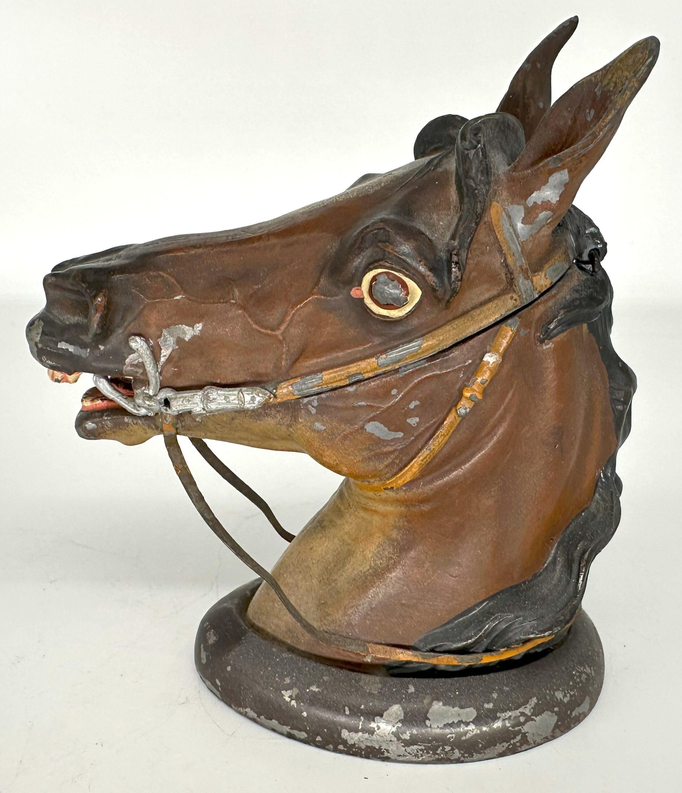 Two similar examples of a figural inkwell shaped like a horse’s head are pictured. Example #1 is pictured on the left and example #2 is on the right.