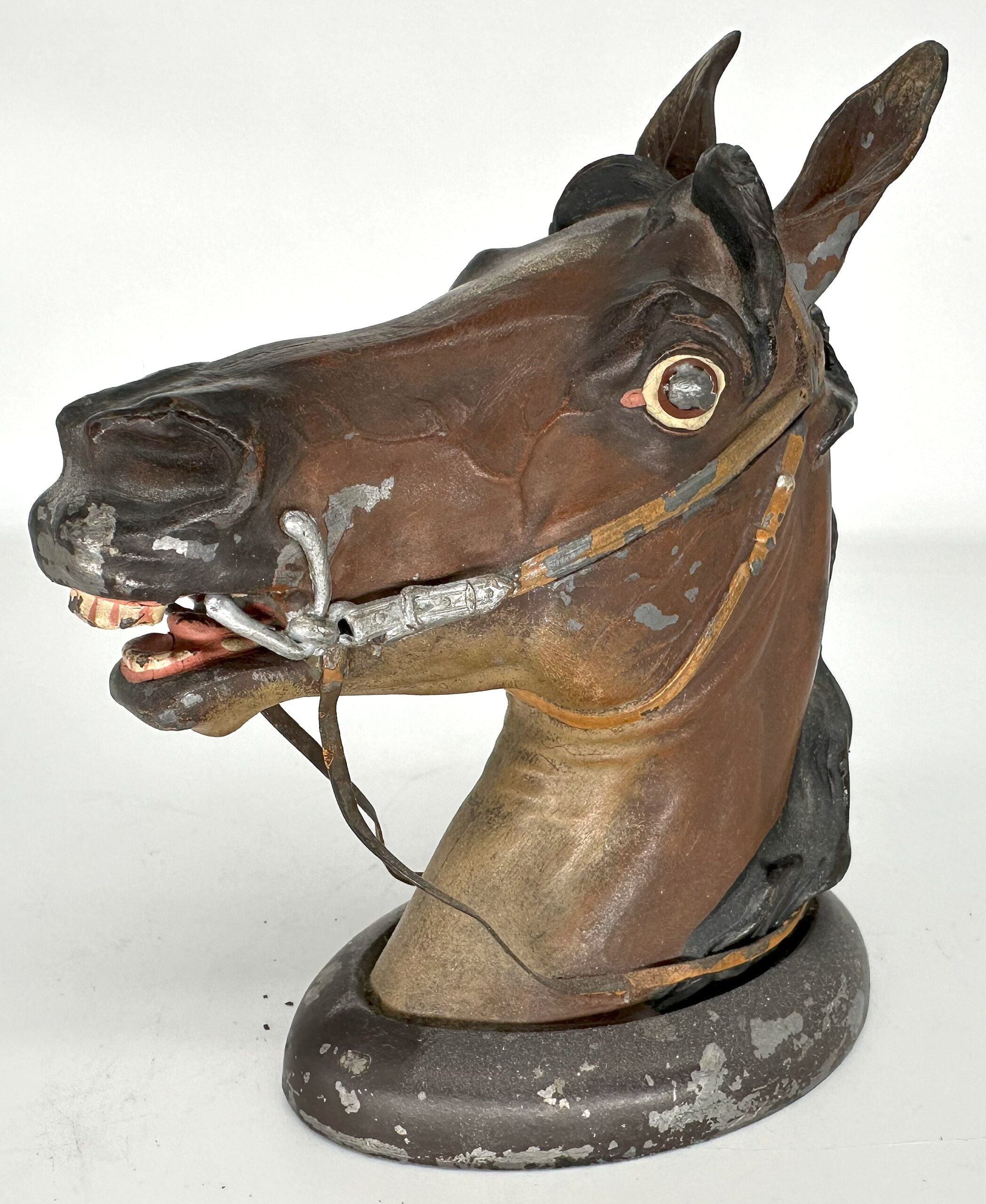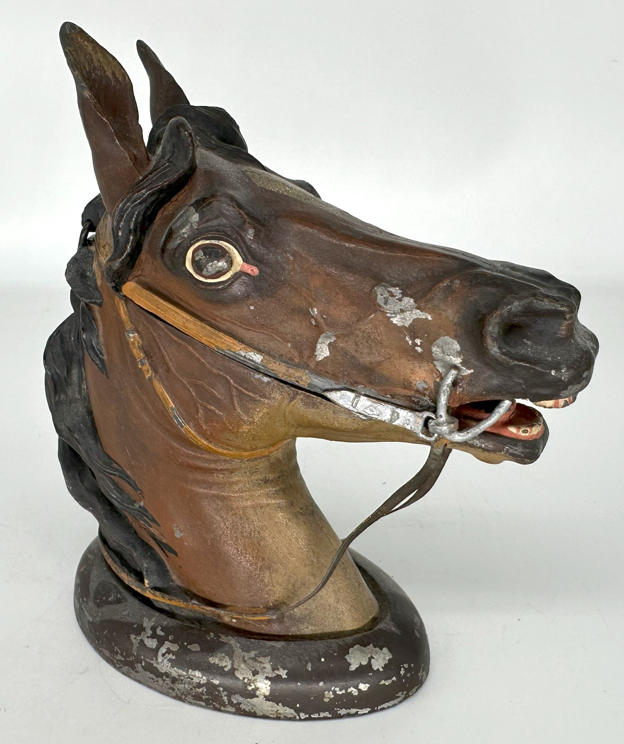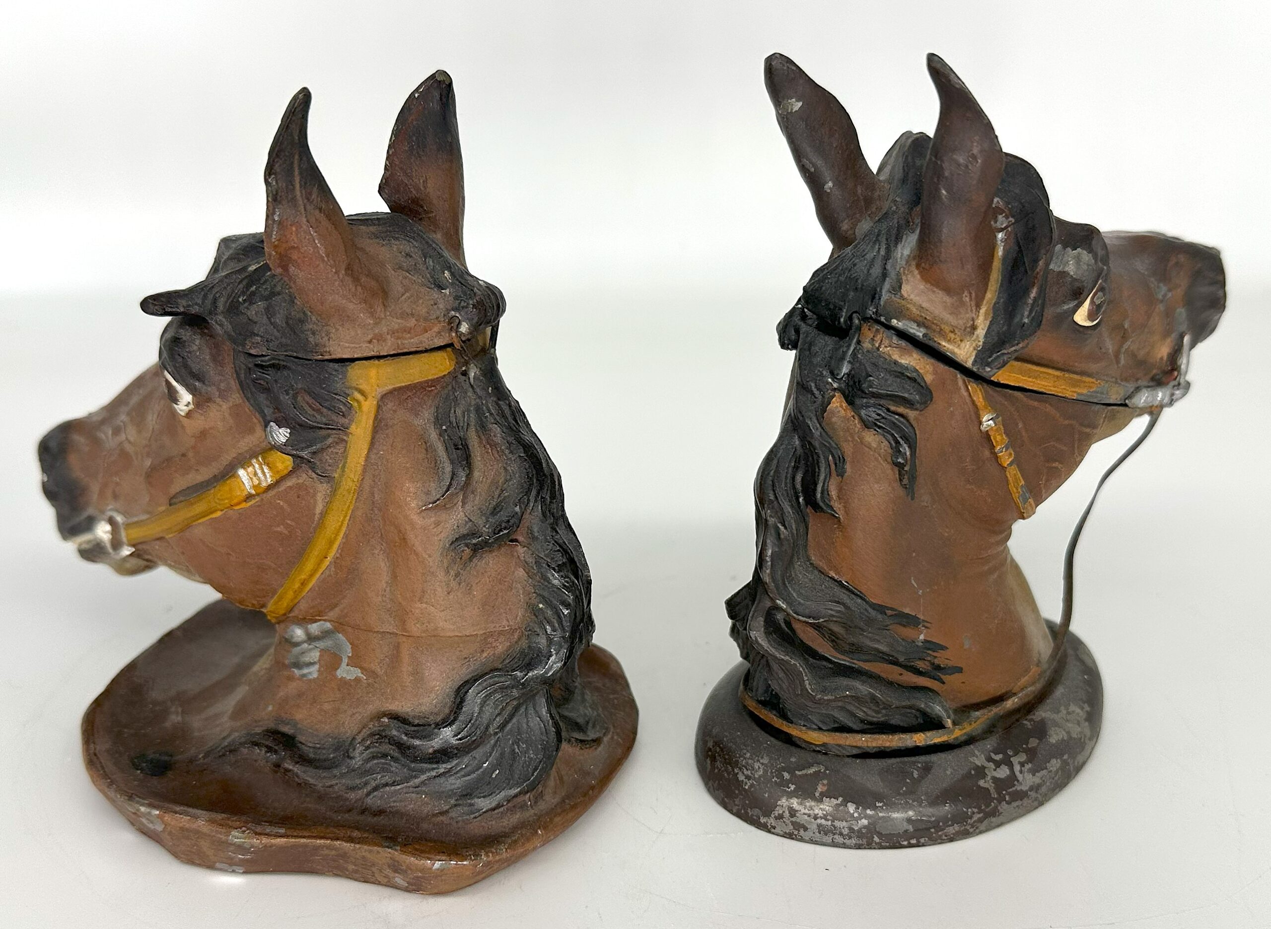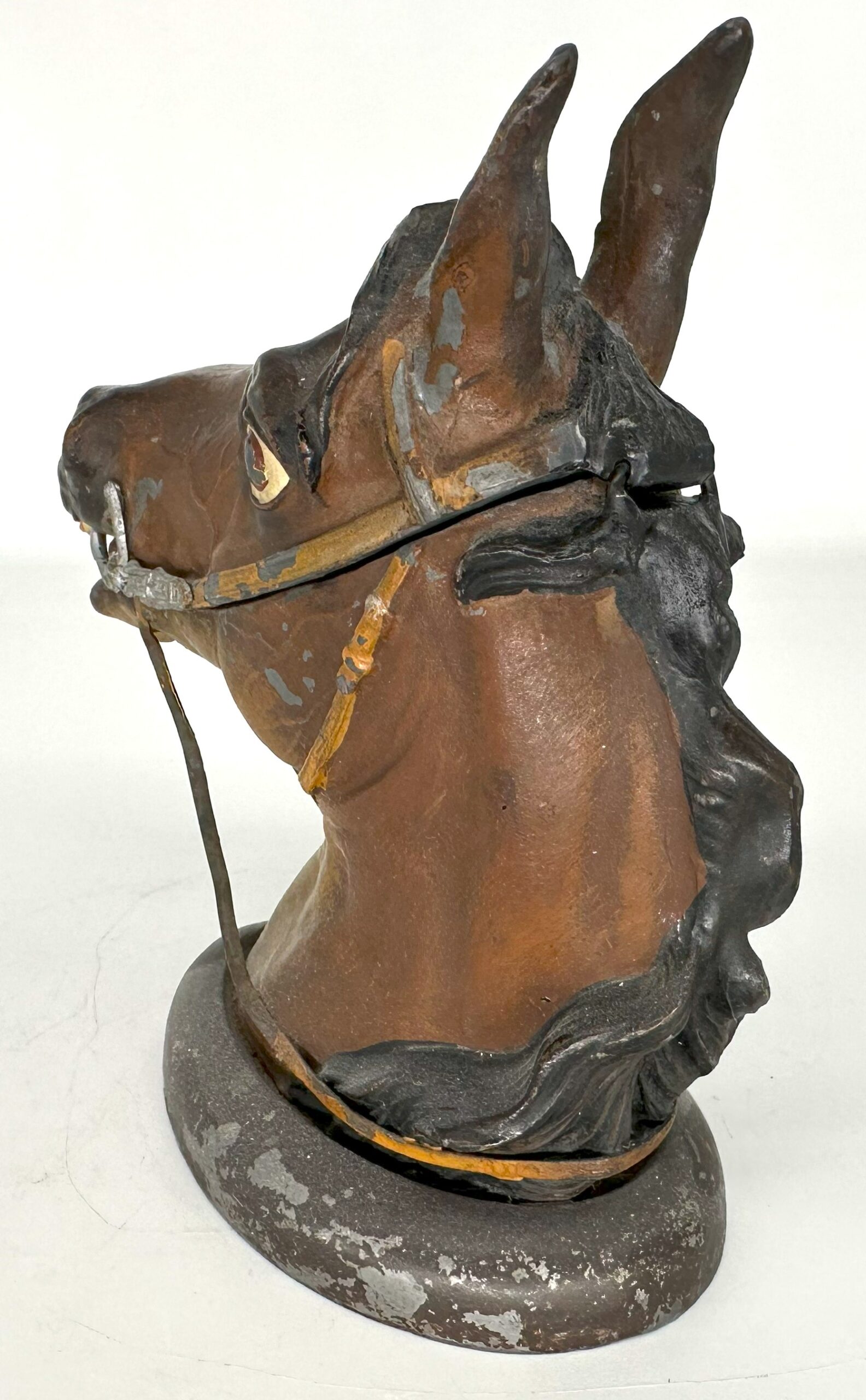 Two similar examples of a figural inkwell shaped like a horse’s head are pictured. Example #1 is pictured on the left and example #2 is on the right.