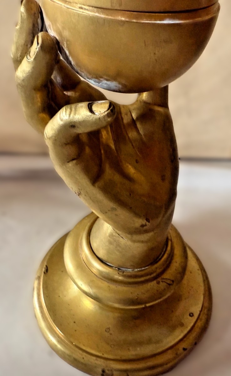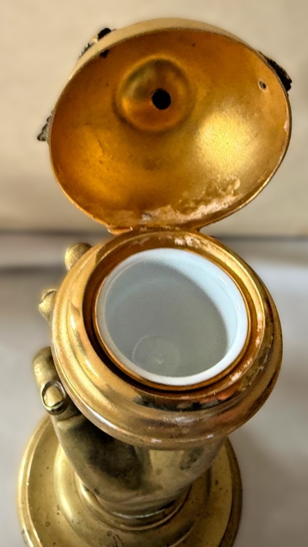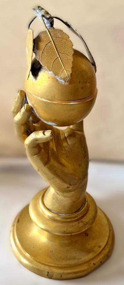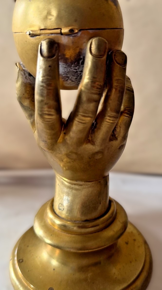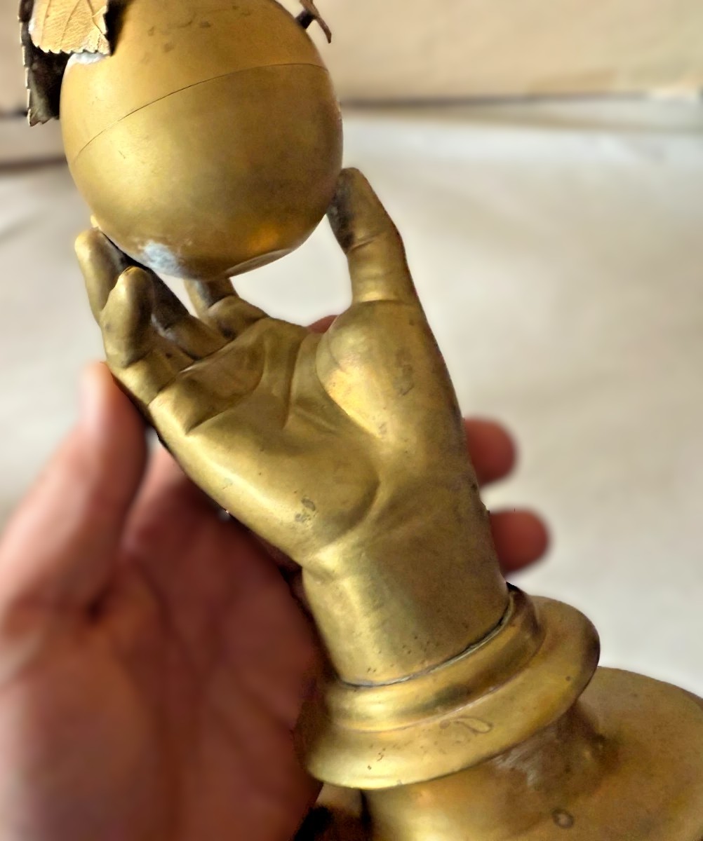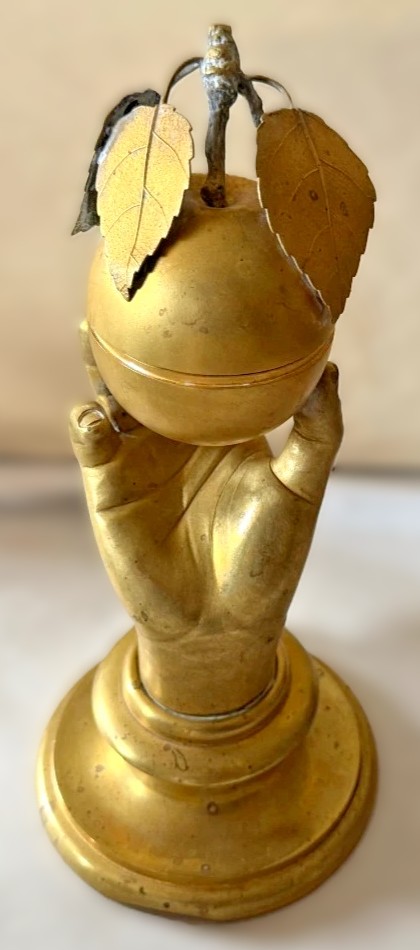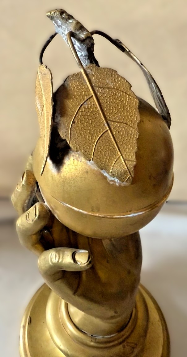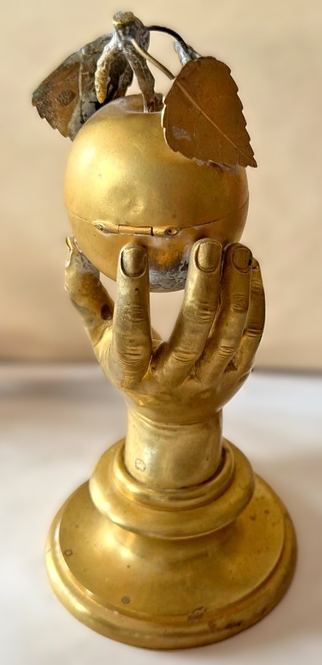 This gilded brass inkstand features a realistically modeled hand, delicately holding a spherical apple, which conceals the inkwell within.