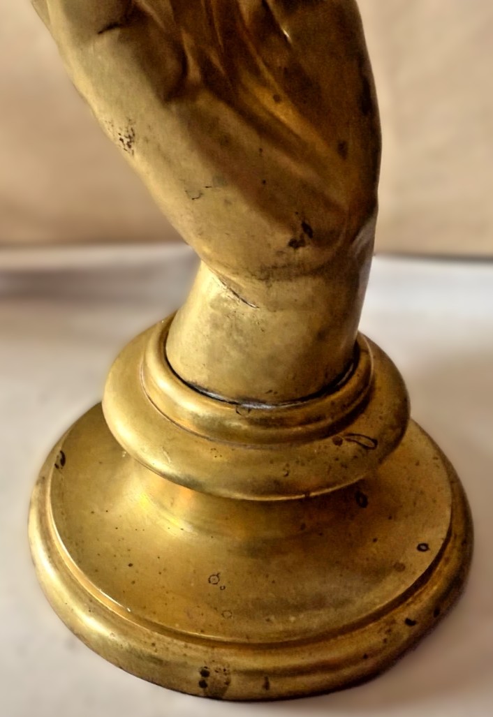 - Form: The hand is rendered with lifelike detail—visible fingernails, knuckles, and curvature—mounted on a circular base.