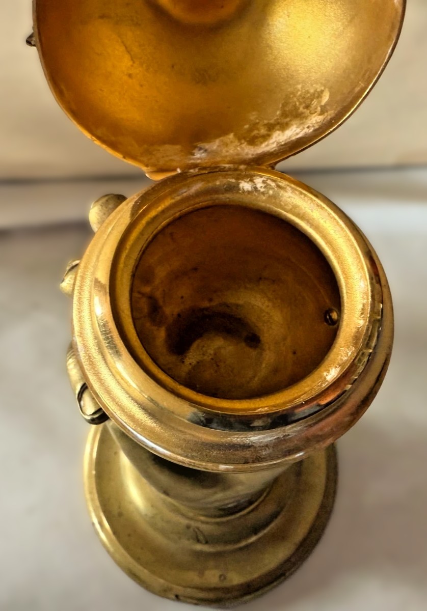 - Origin: Possibly French or Austrian. The figural style and use of gilded brass are consistent with decorative objects produced by foundries such as Kunst-Erzgiesserei Wien or Parisian ateliers.