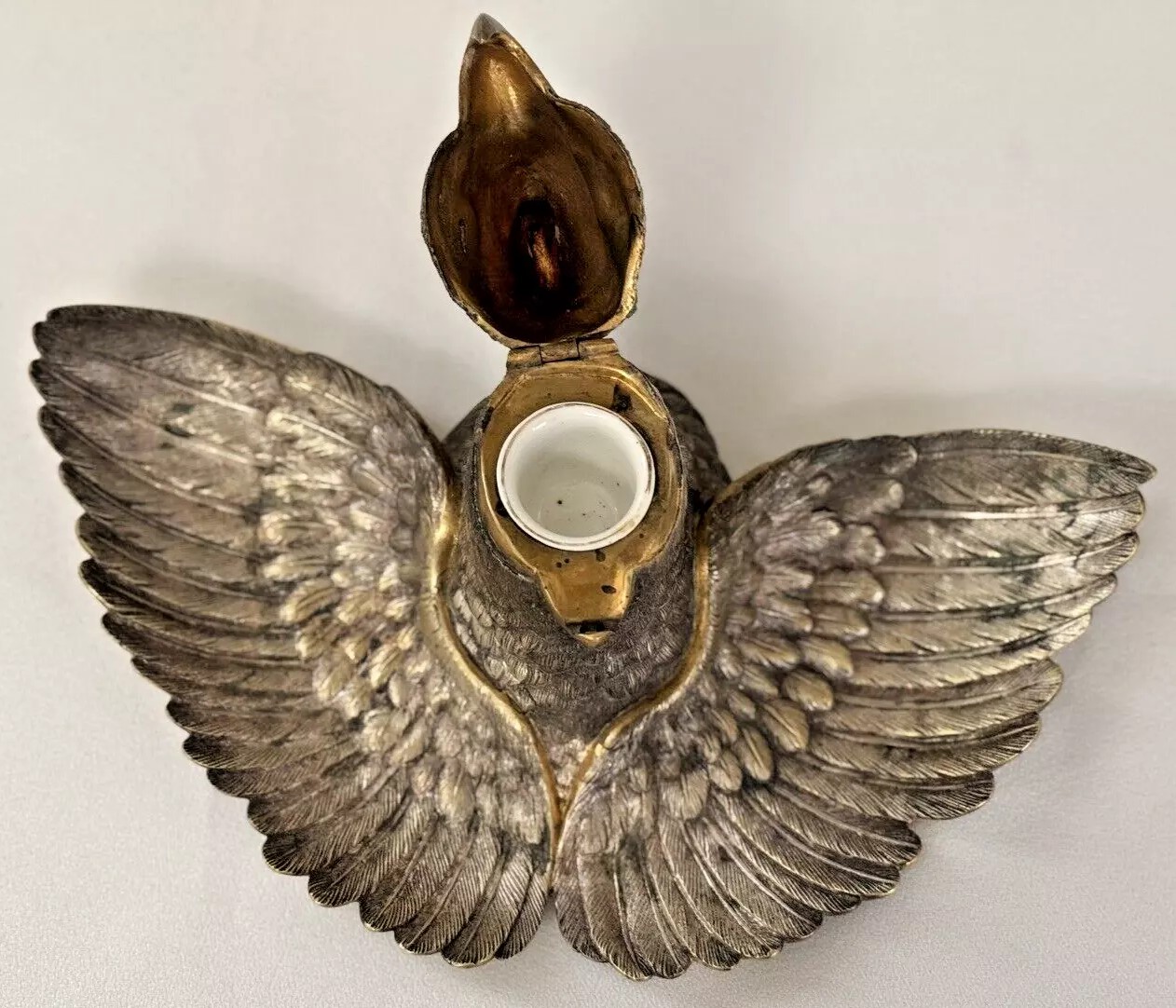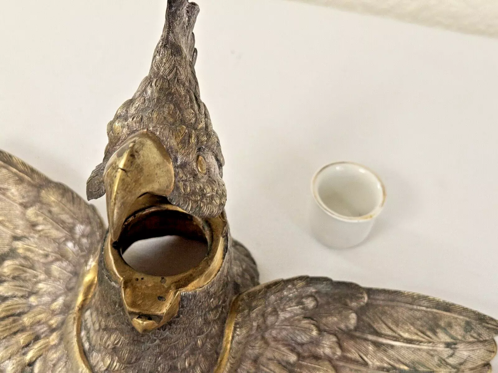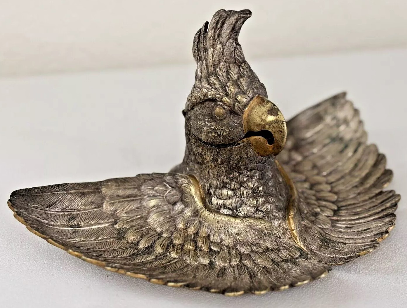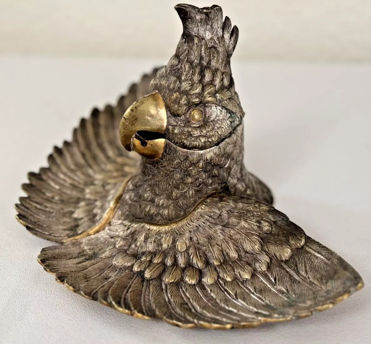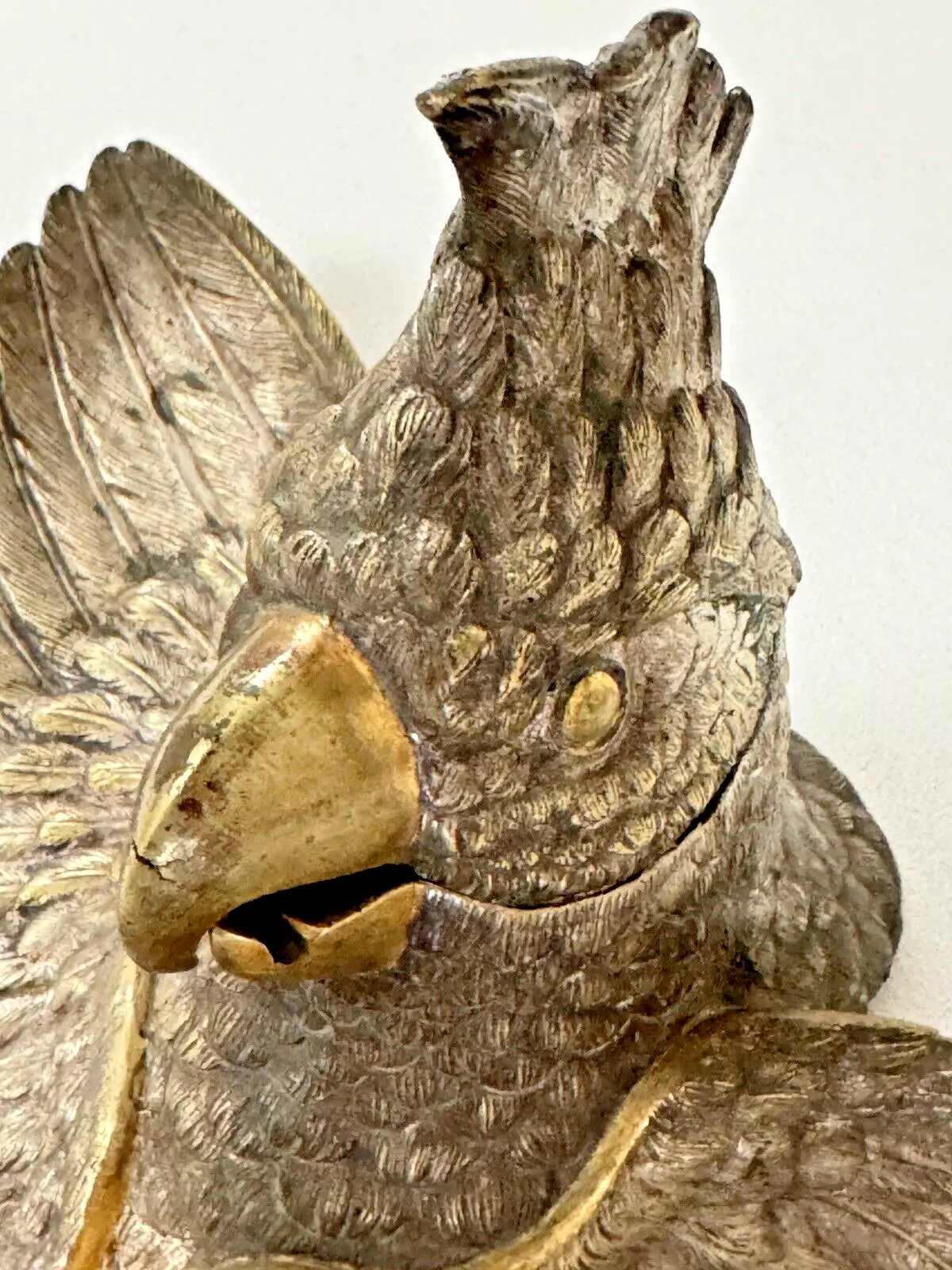 This brass, figural inkstand is designed as a parrot, with intricate feather detailing and a hinged neck that opens to reveal the inkwell inside. The parrot’s wings are spread out and serve as a pen tray.