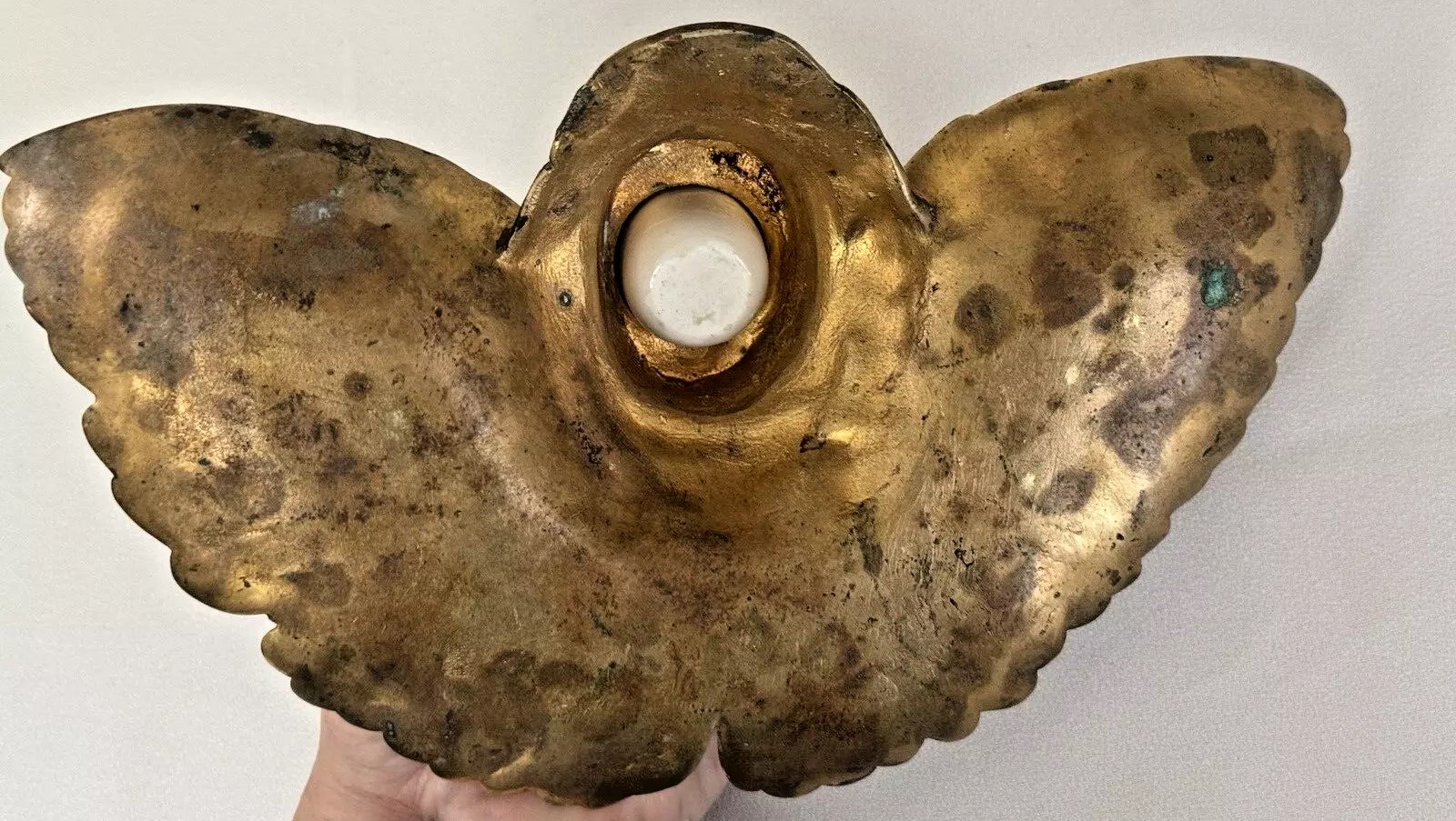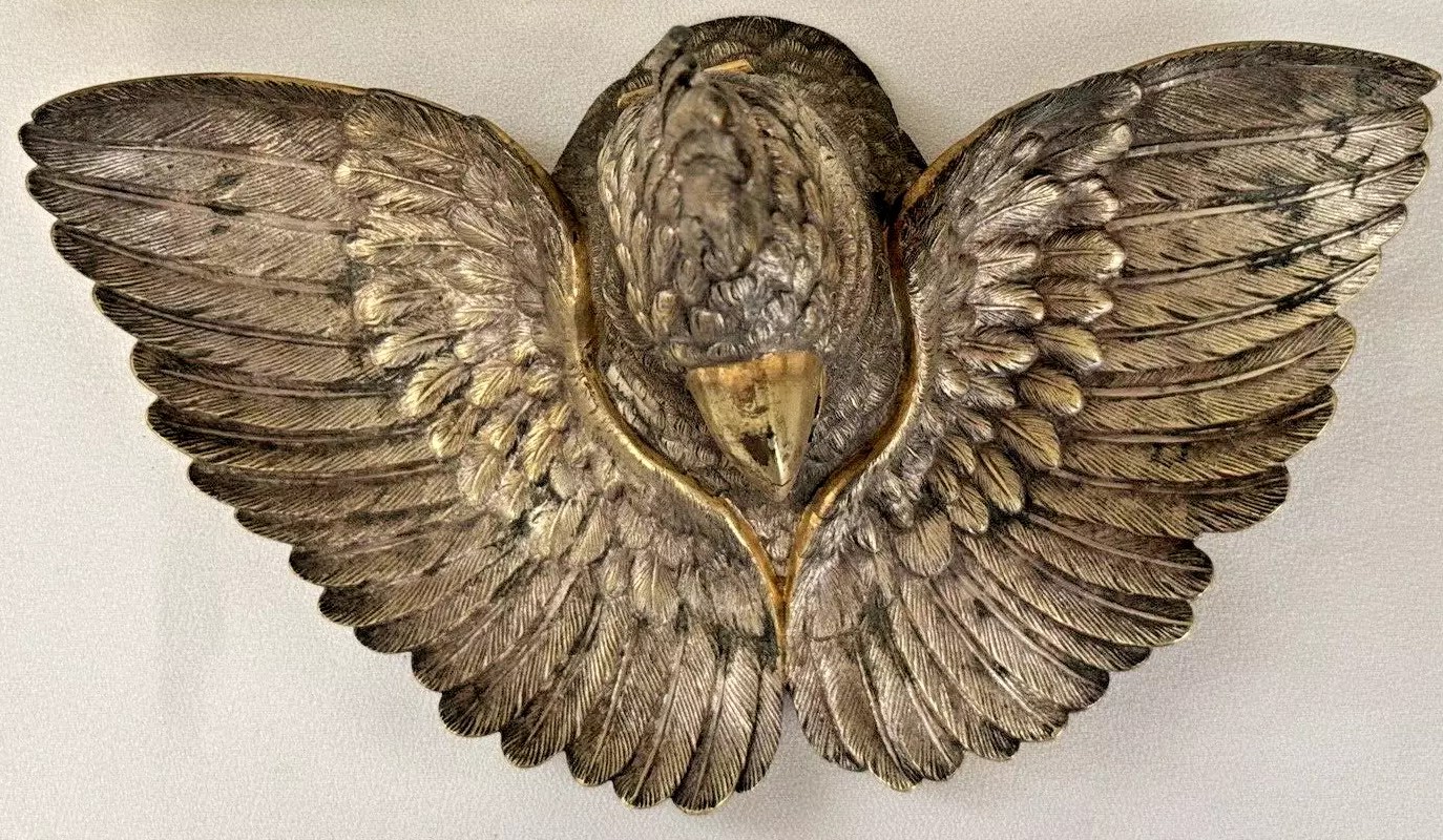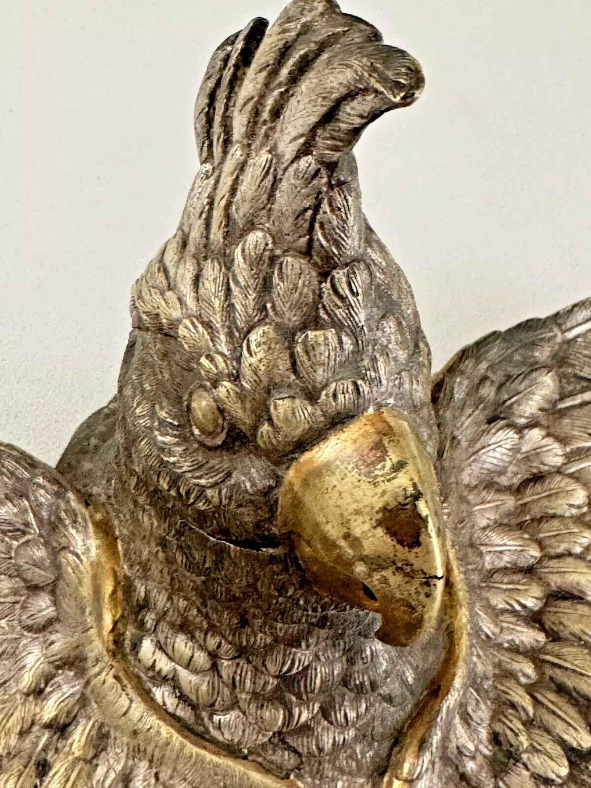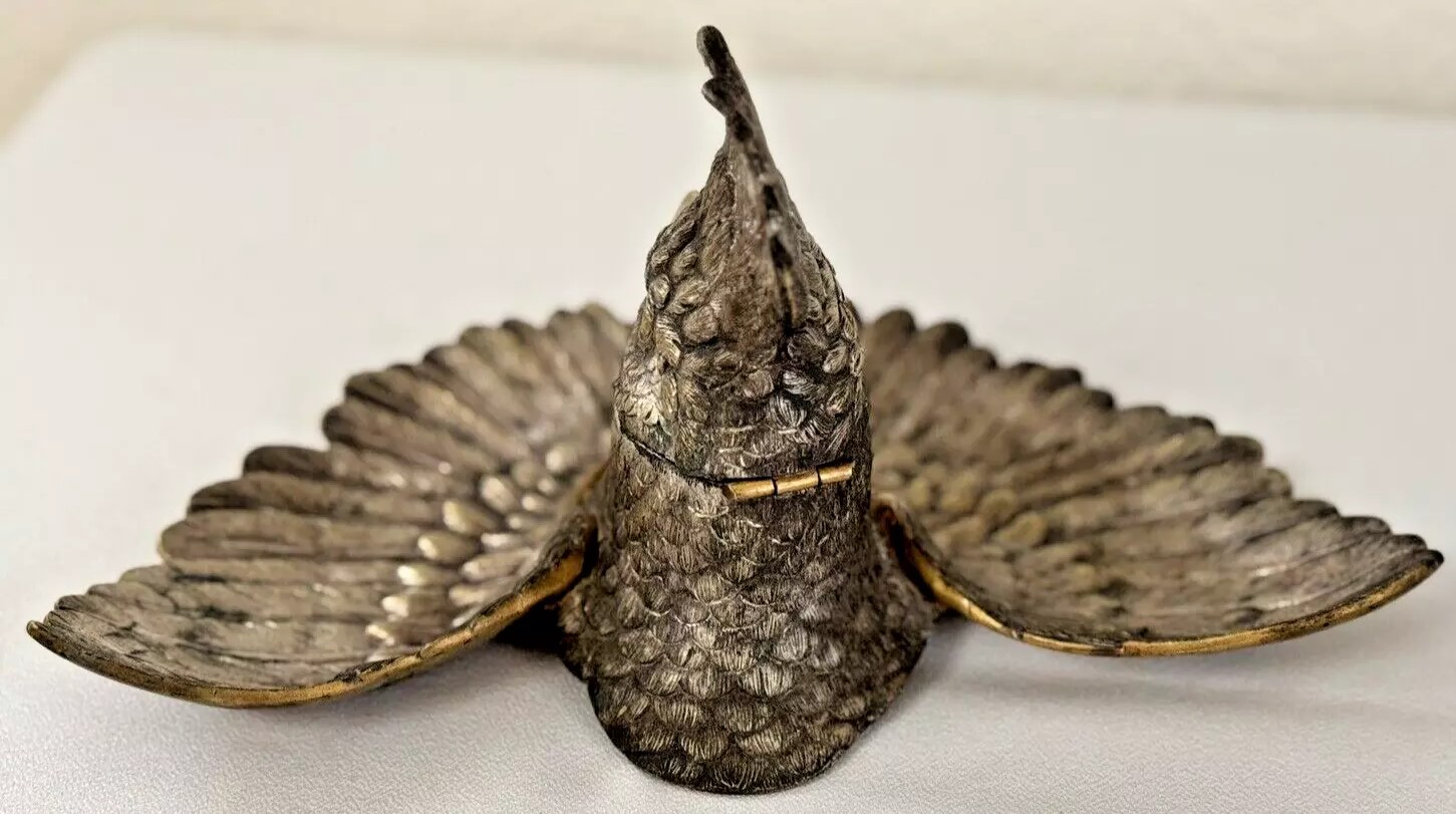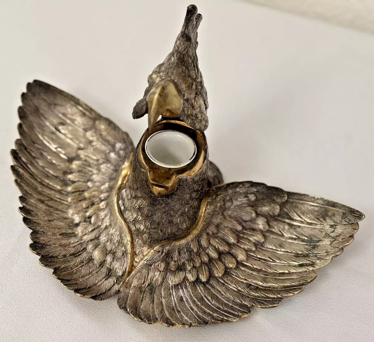 This brass, figural inkstand is designed as a parrot, with intricate feather detailing and a hinged neck that opens to reveal the inkwell inside. The parrot’s wings are spread out and serve as a pen tray.