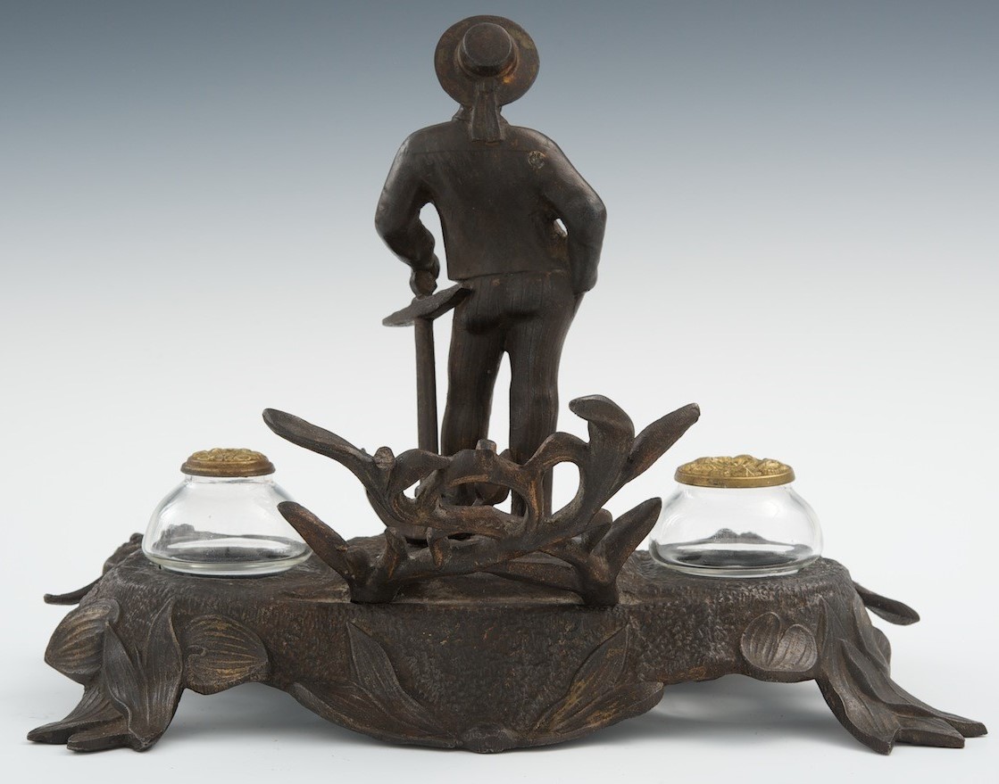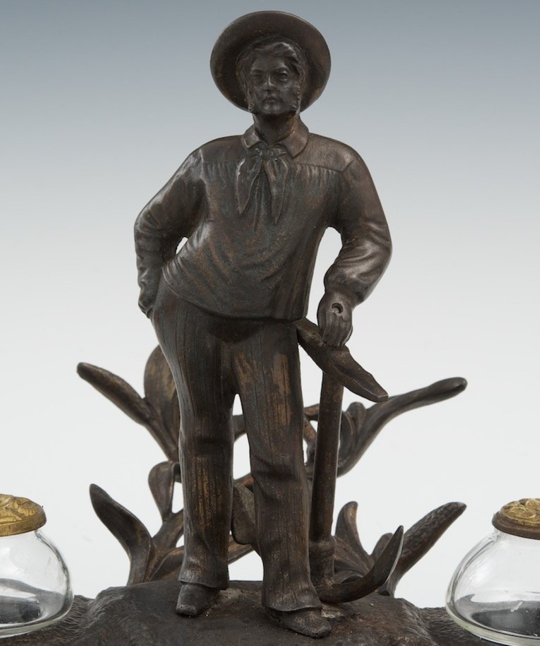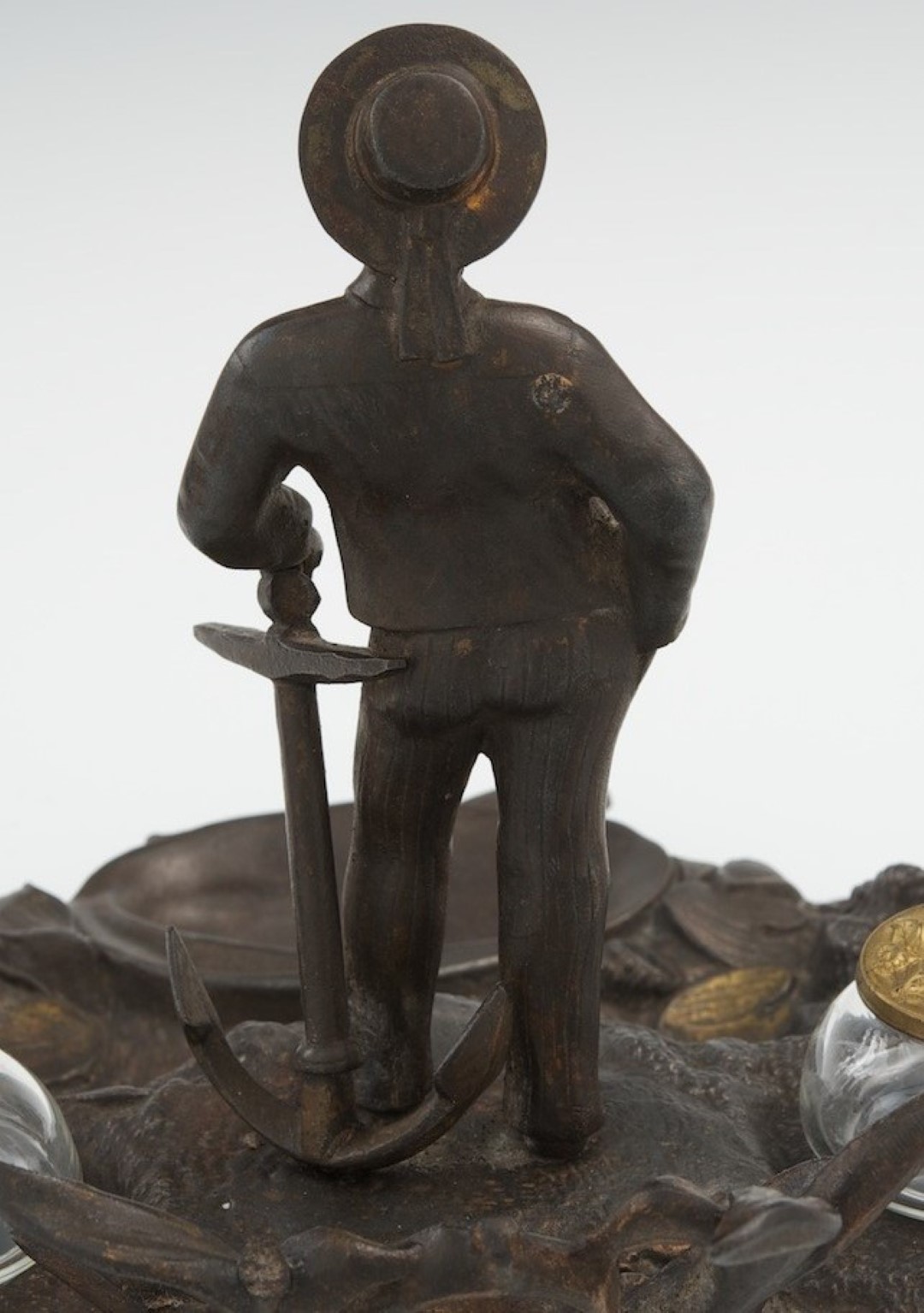 This cast iron inkstand depicts a sailor leaning against a ship’s anchor. In front of him are large seashells and water lily leaves which serve as implement holders. There are two stemmed glass inkwells with brass repoussé lids.