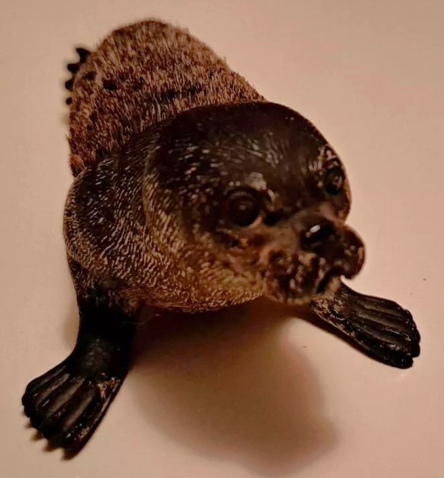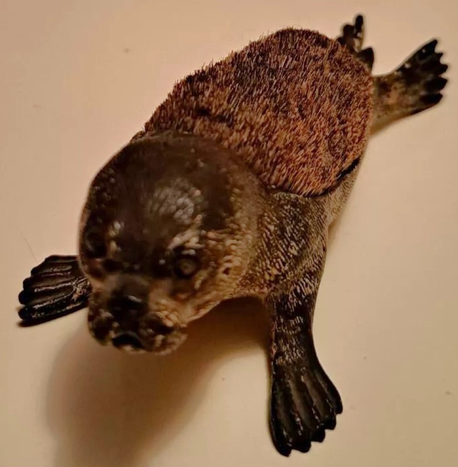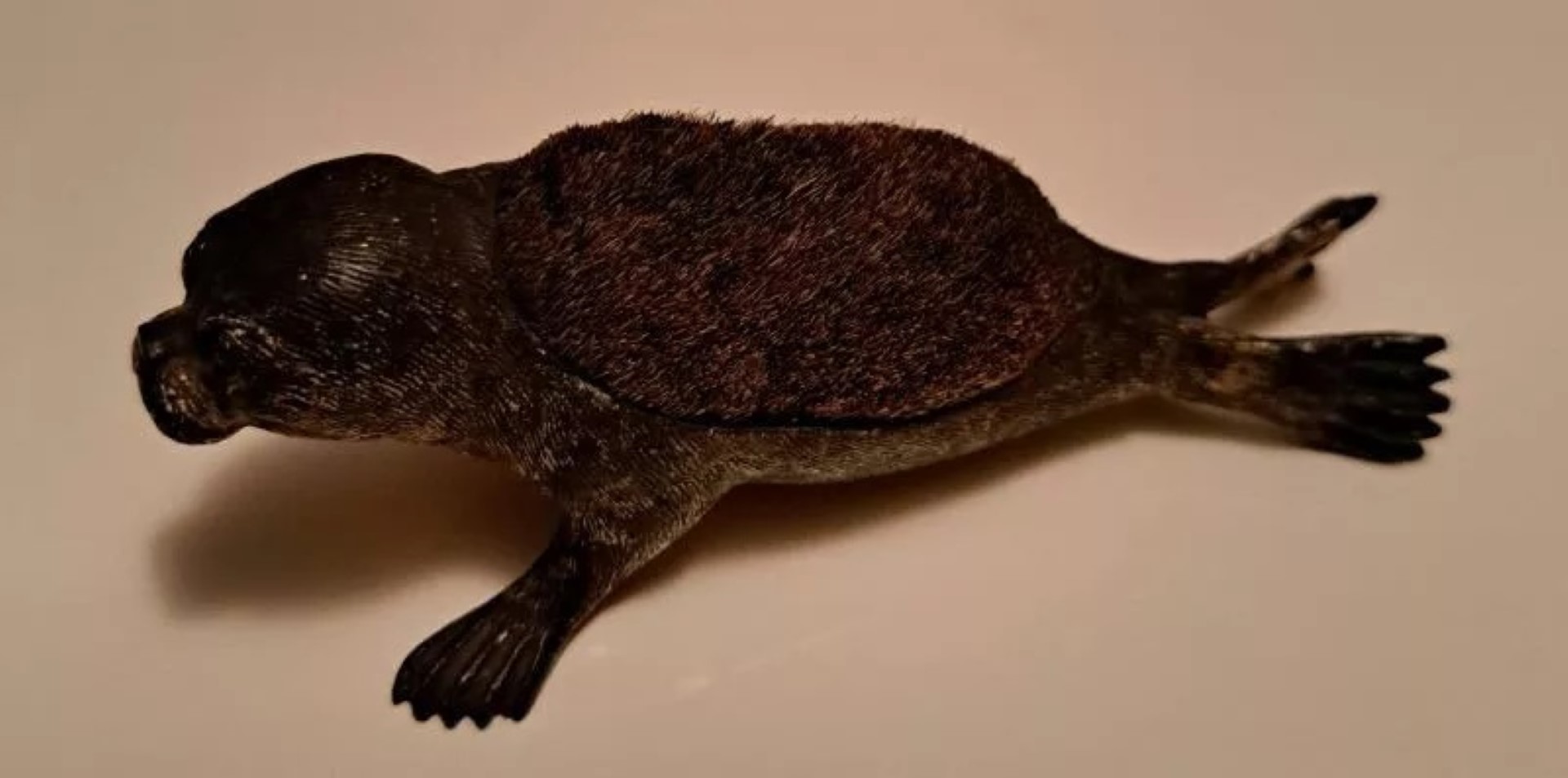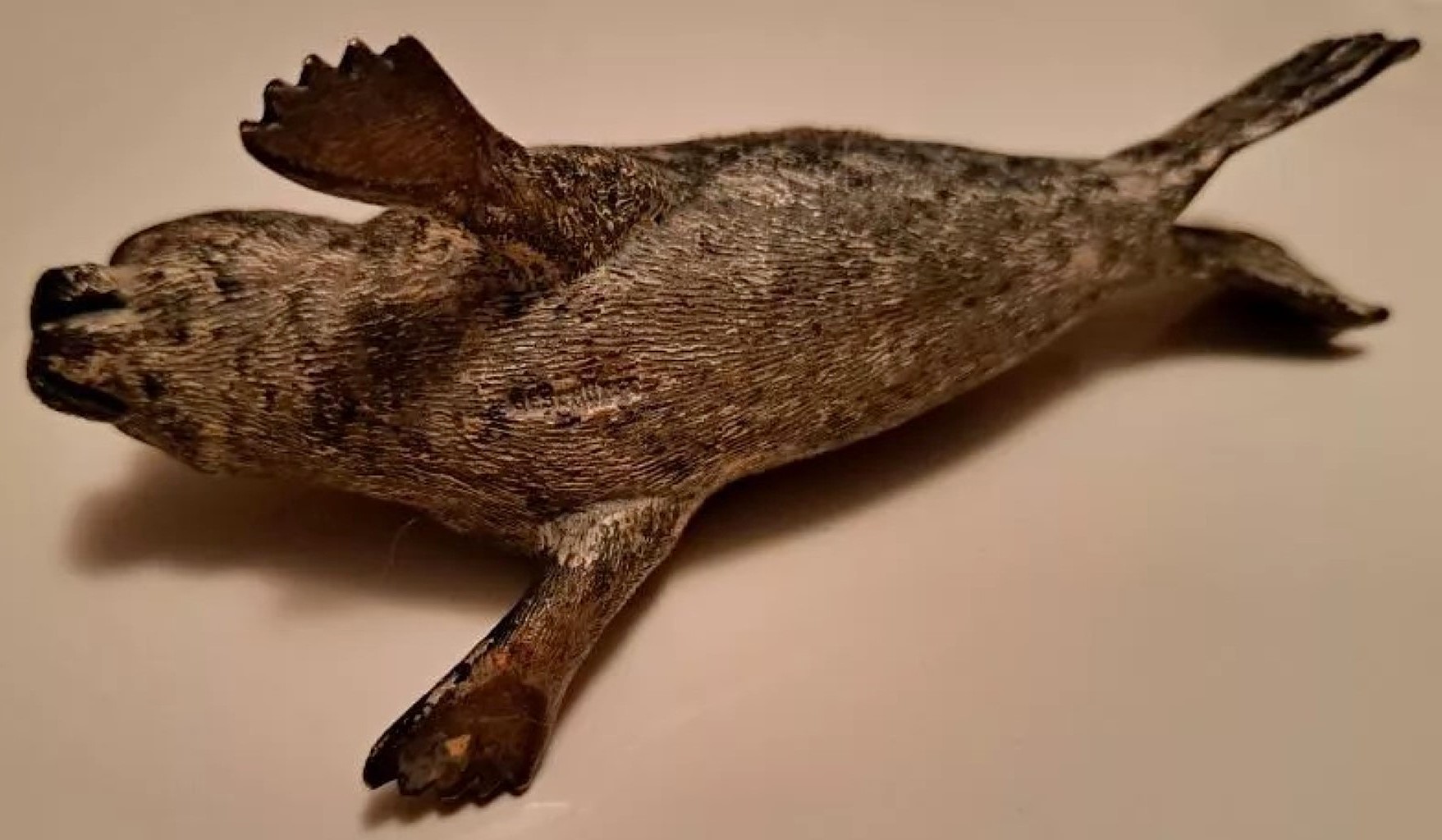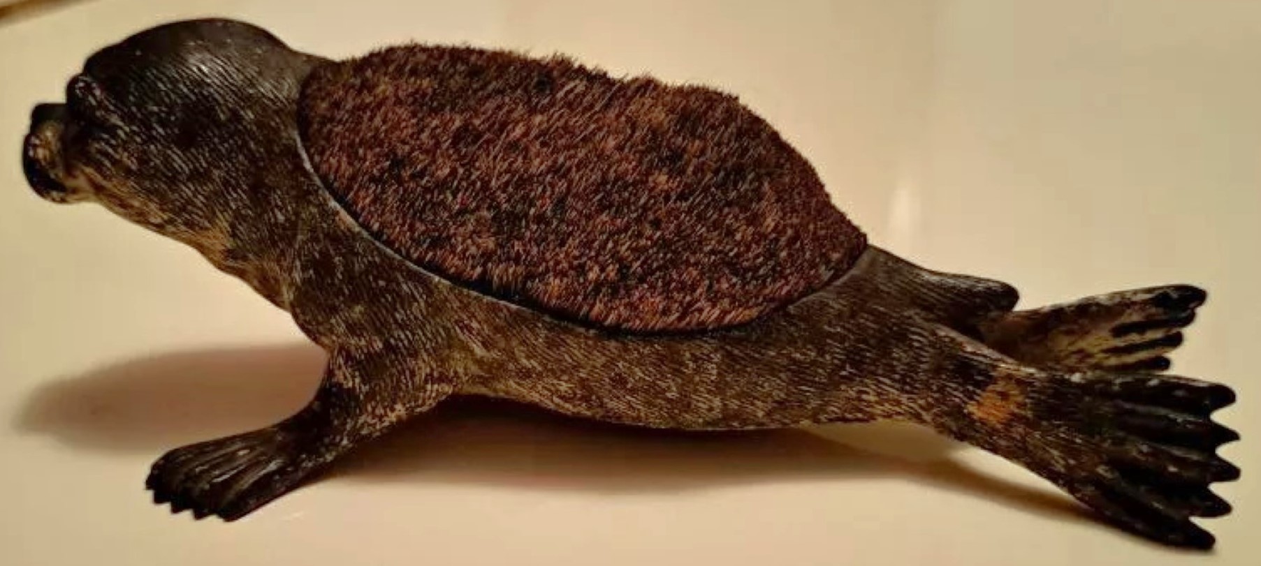 A cold painted bronze pen wipe in the form of a seal. A pen wipe is used to clean the nib of a fountain pen, removing excess ink to prevent blotting and ensure smooth writing. The embedded bristles on the back are made of coarse hair, likely natural boar’s hair. The underside is marked “Geschutzt”, German for “protected,” indicating that the design or concept of this item was registered or patented in German-speaking countries.