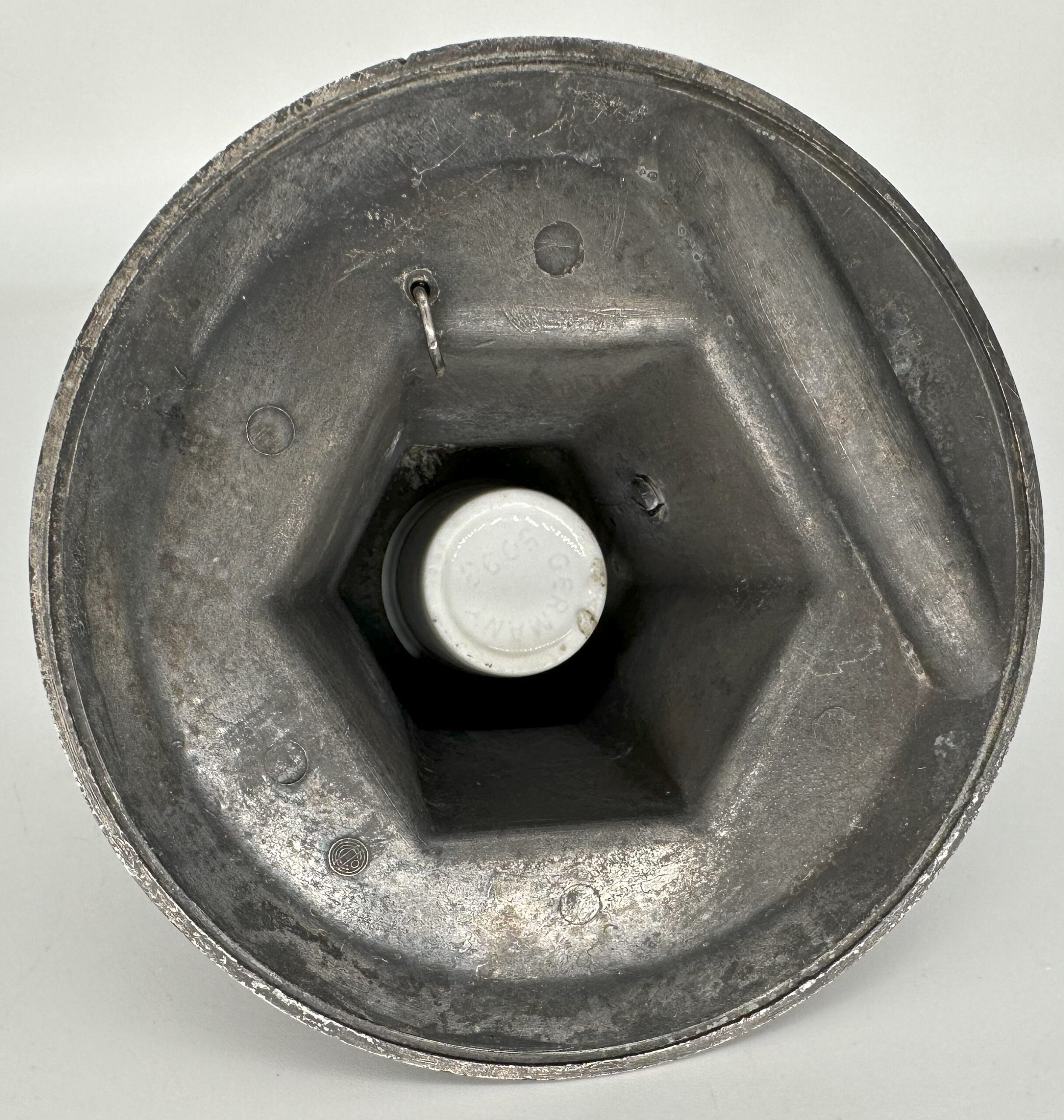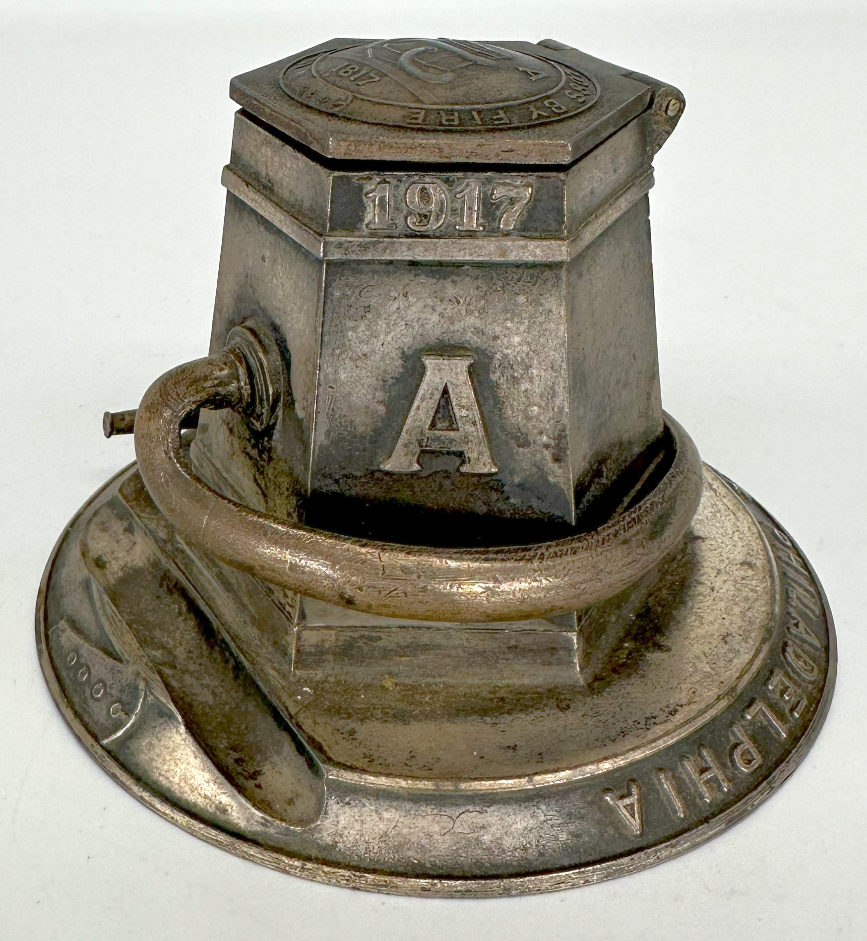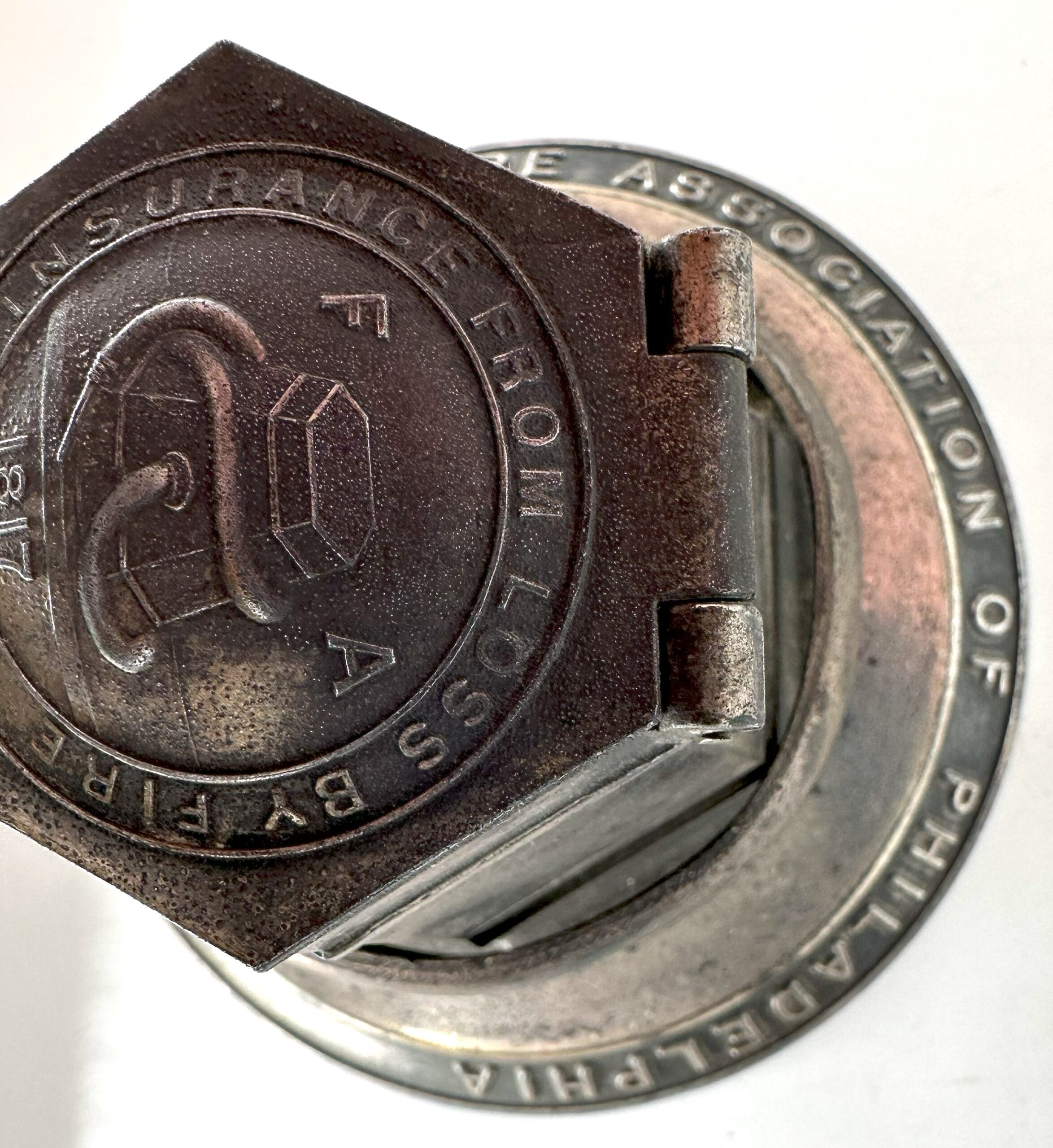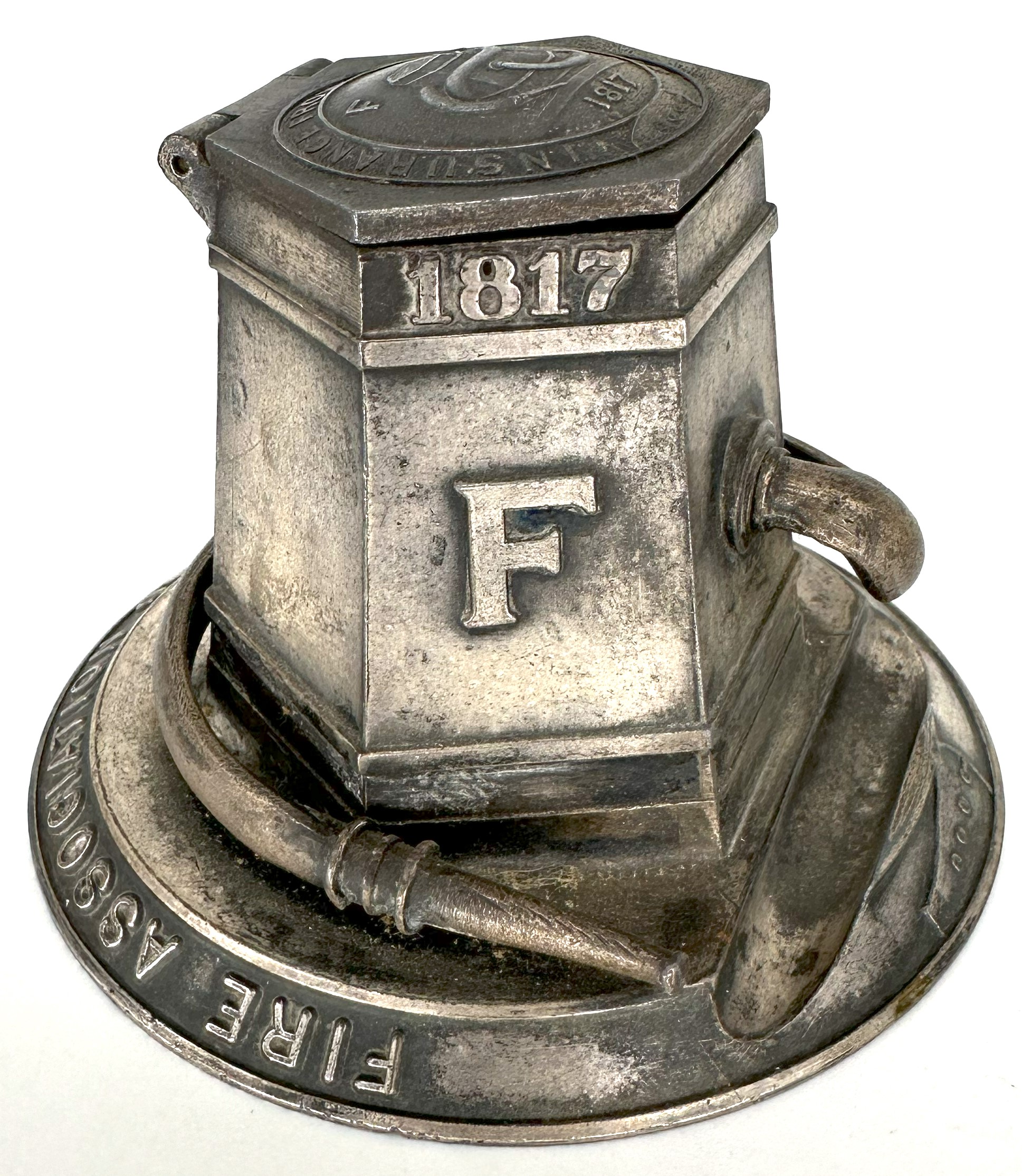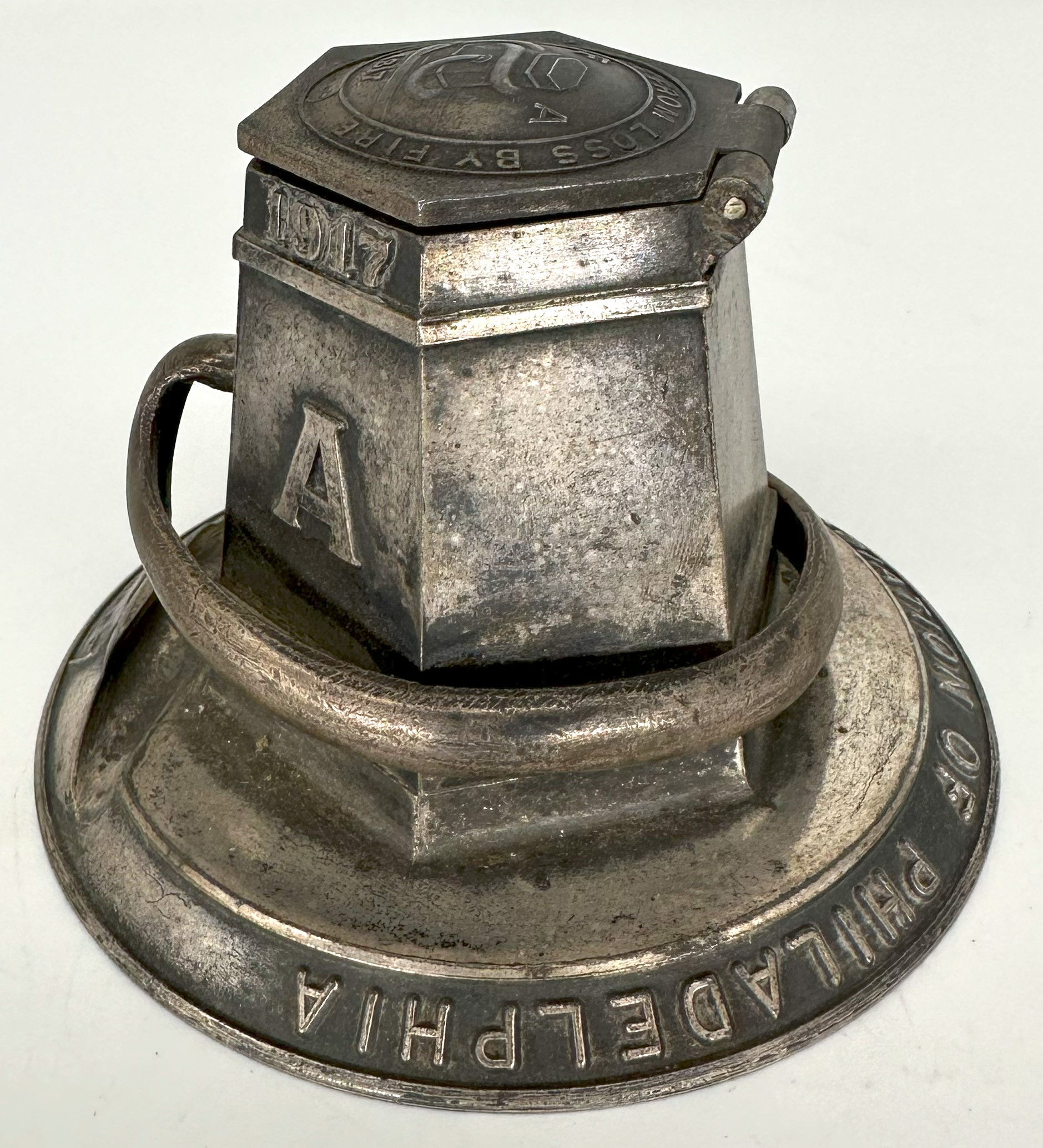 This white metal replica of a fire hydrant and hose holds an inkwell and celebrates the Association’s 100-year anniversary. The inkwell’s hinged lid bears the Fire Association’s logo and is inscribed “INSURANCE FROM LOSS BY FIRE 1817”. Around the base it reads “Fire Association of Philadelphia”. On the hydrant itself appear the dates 1817 and 1917. In the front, there is a ledge to rest a pen.