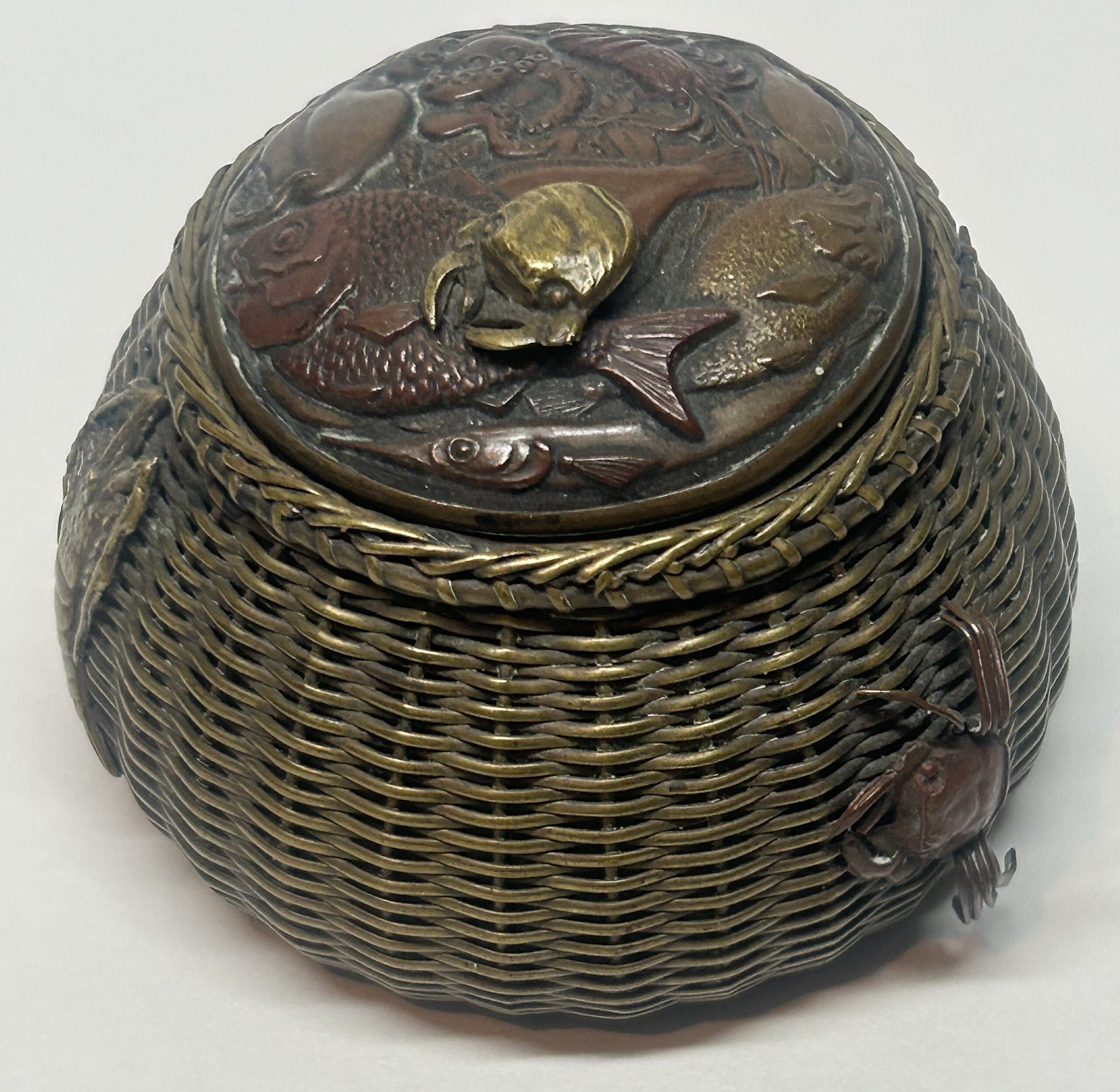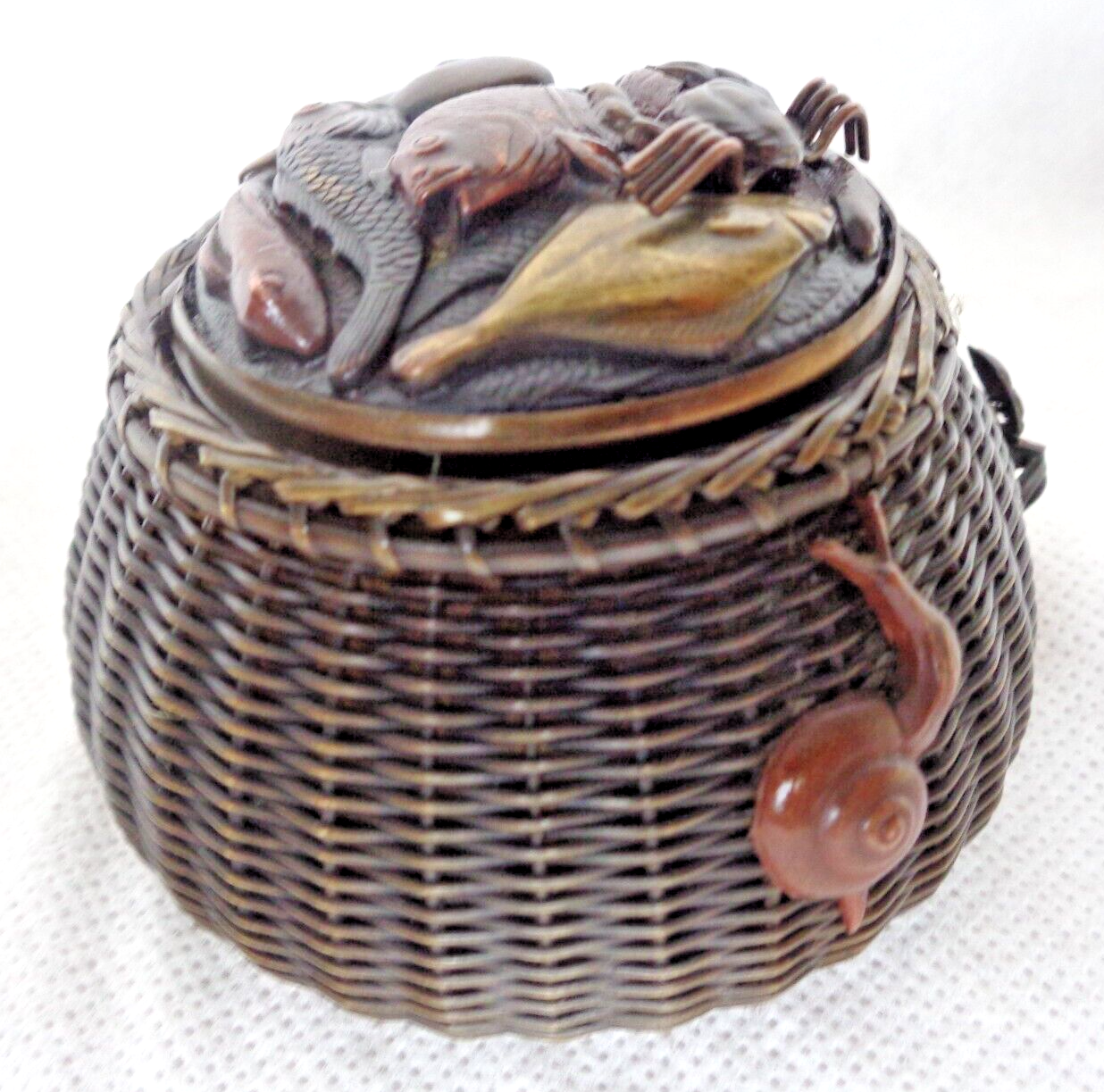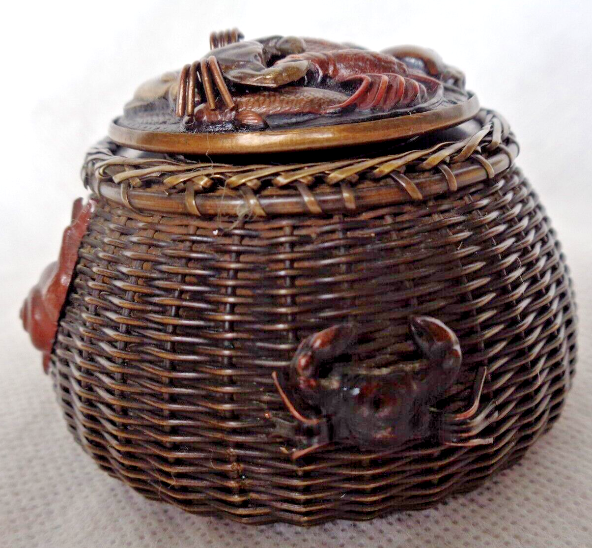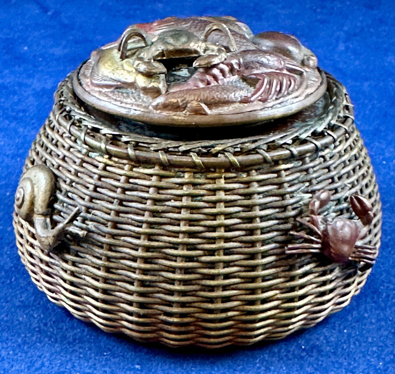 These creels (fishing baskets) are formed with intricately woven wire (brass or bronze). The hinged lids display the day’s catch from the sea: fish, lobster, crab, mollusks, shrimp, crustacea, even an octopus (made from copper or bronze) spilling over the sides.  Some baskets have a snail, crab, lobster or a frog clinging to its side. One of the creels has a handle.