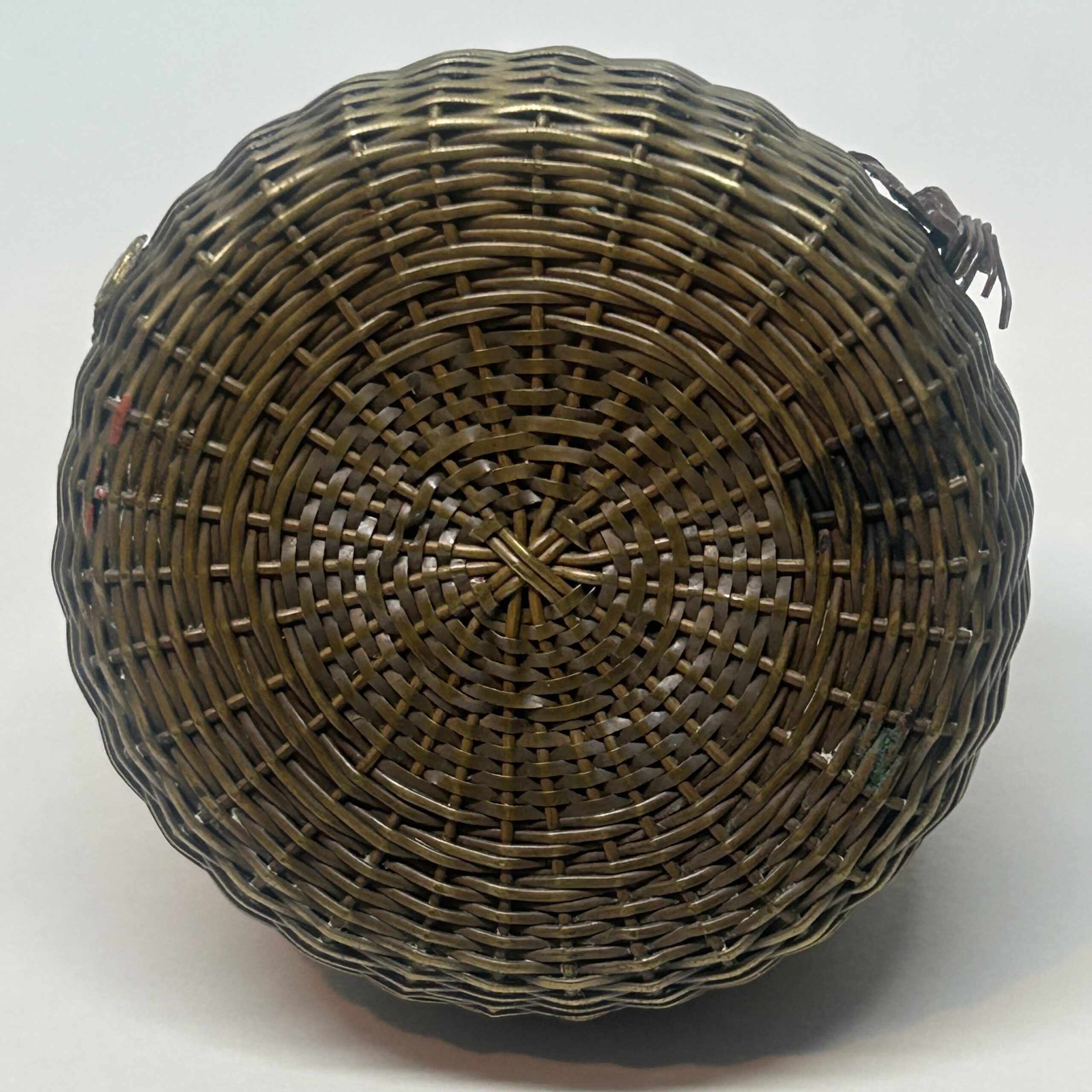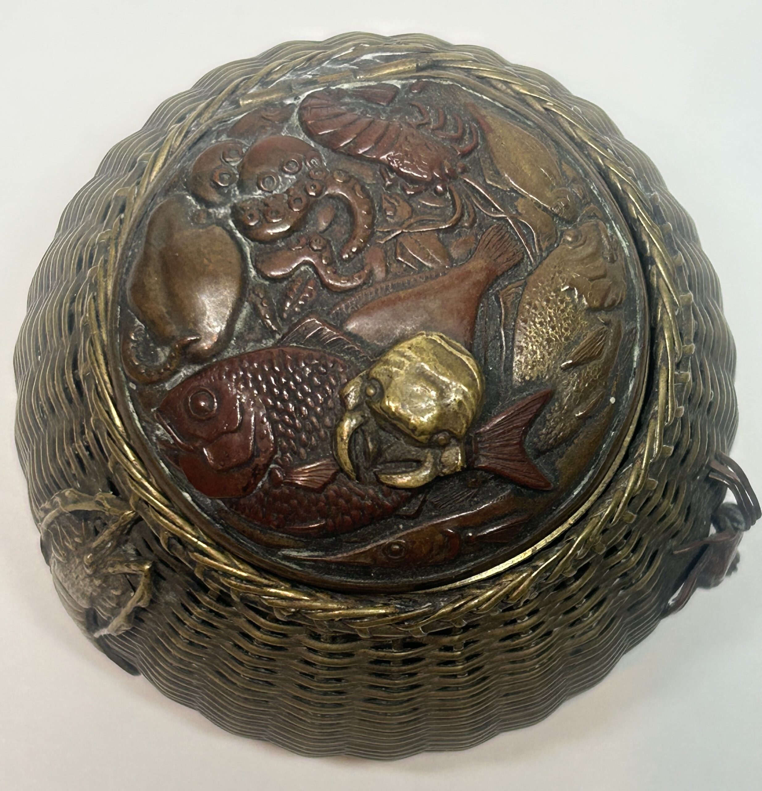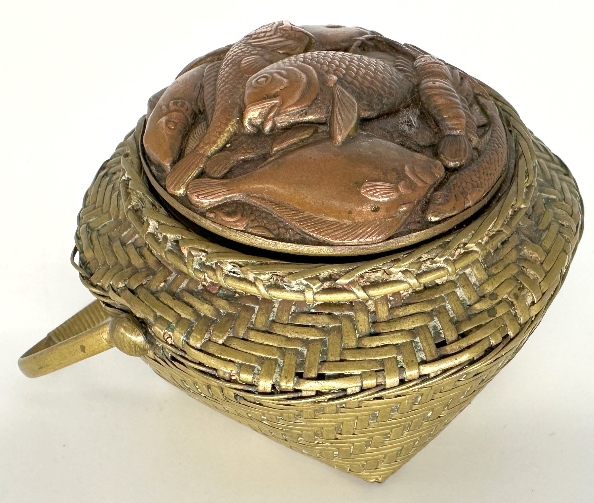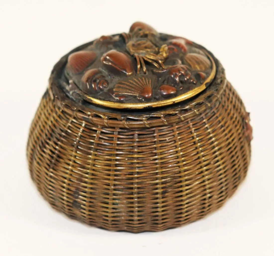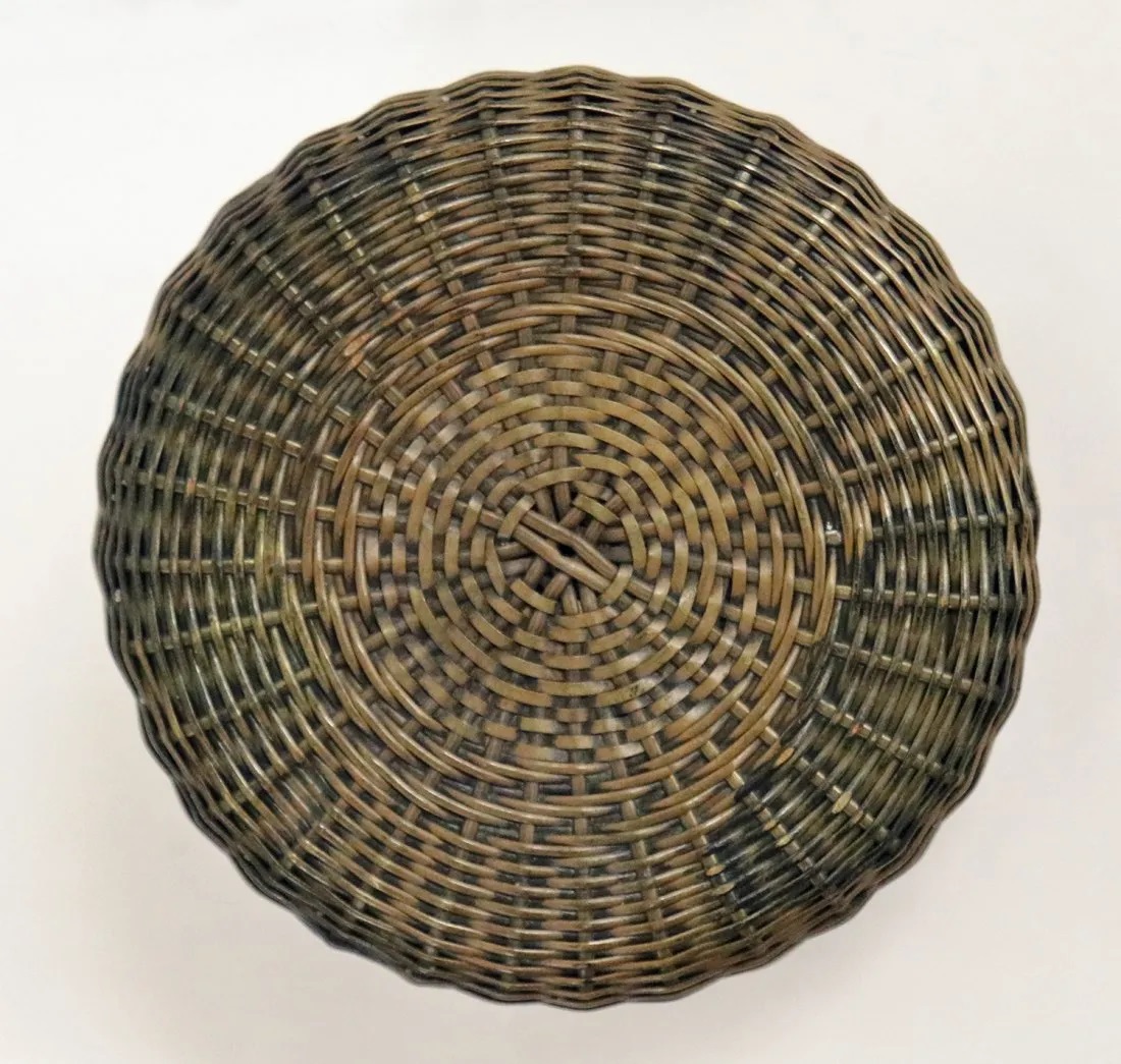 These creels (fishing baskets) are formed with intricately woven wire (brass or bronze). The hinged lids display the day’s catch from the sea: fish, lobster, crab, mollusks, shrimp, crustacea, even an octopus (made from copper or bronze) spilling over the sides.  Some baskets have a snail, crab, lobster or a frog clinging to its side. One of the creels has a handle.