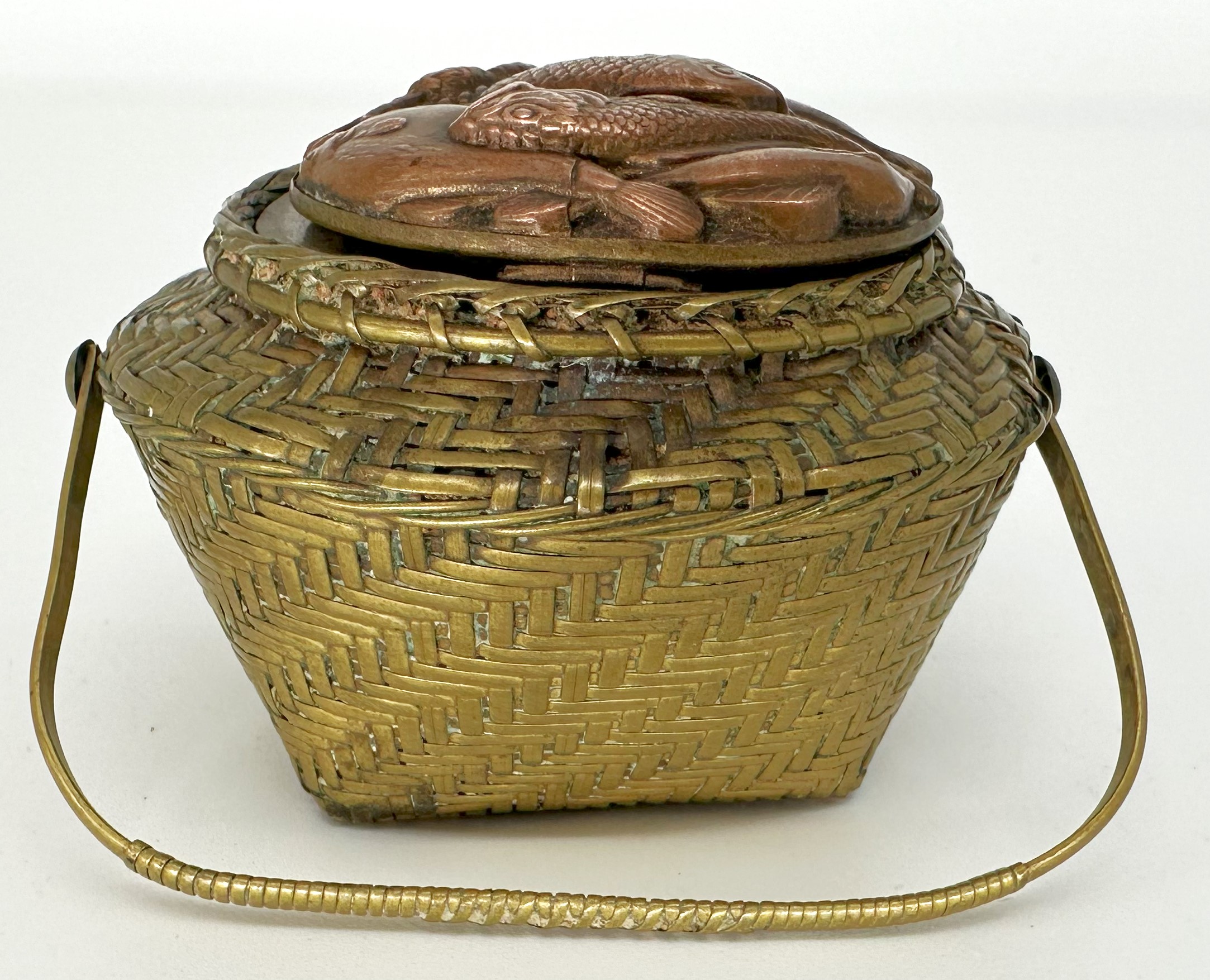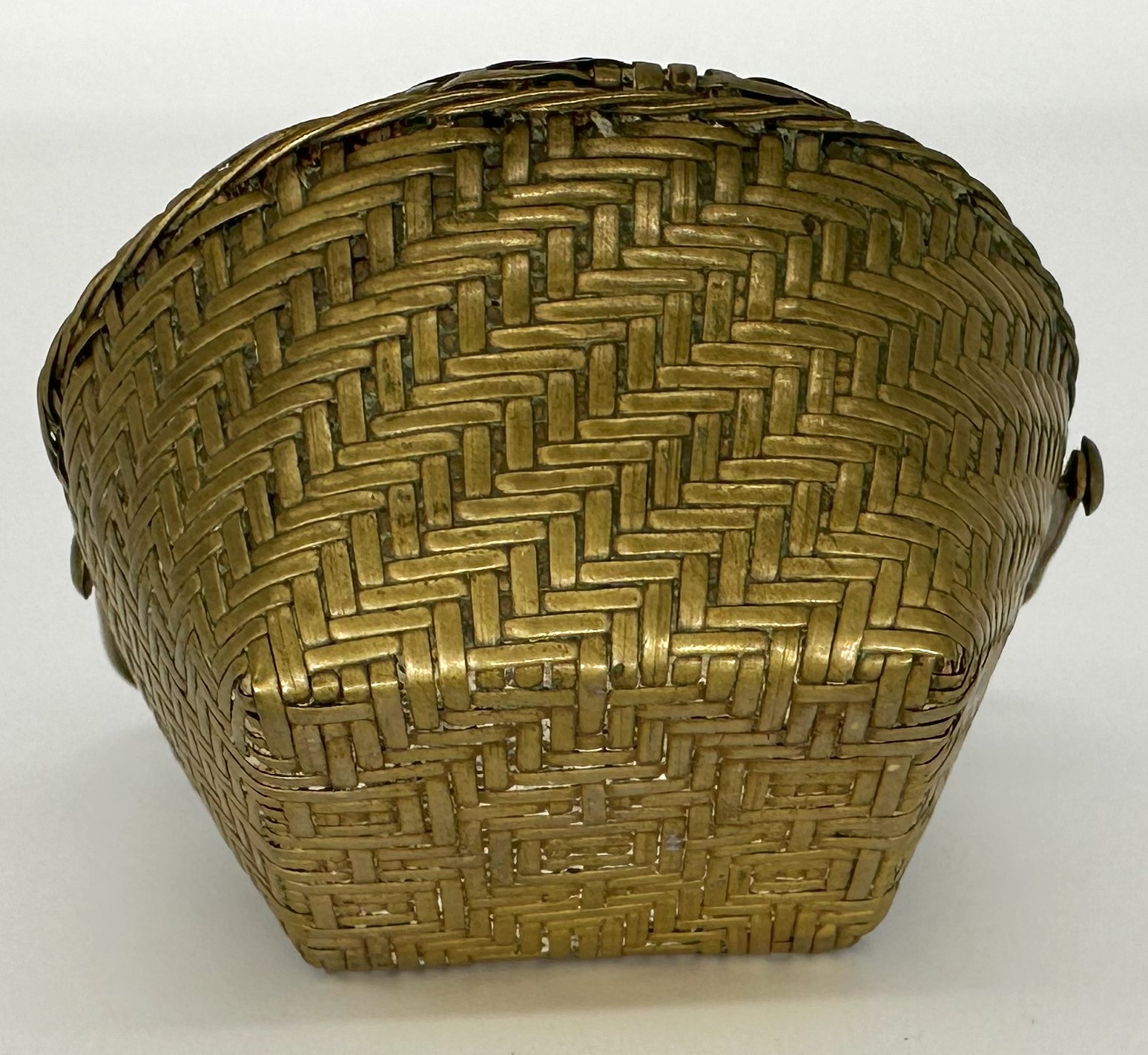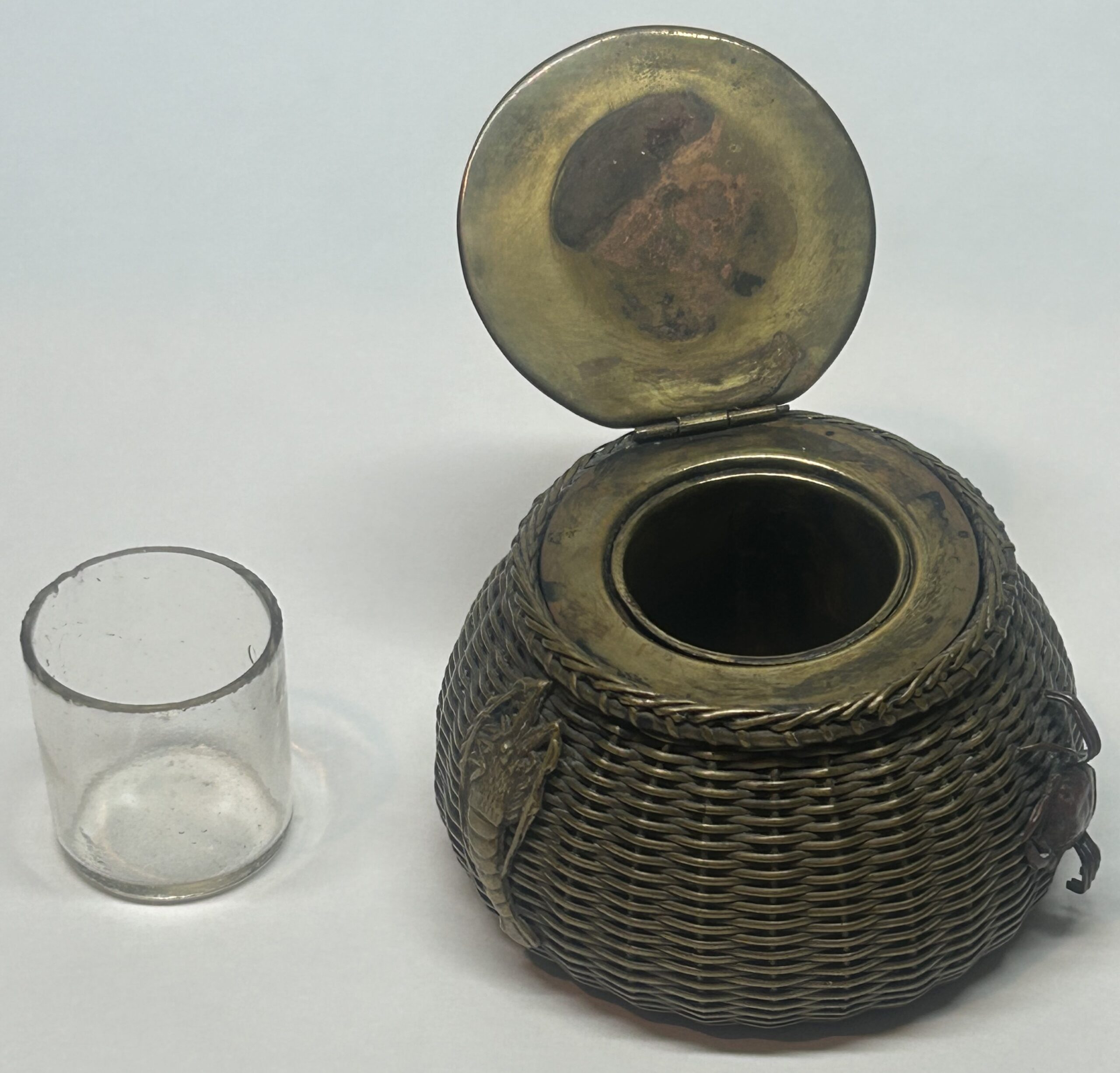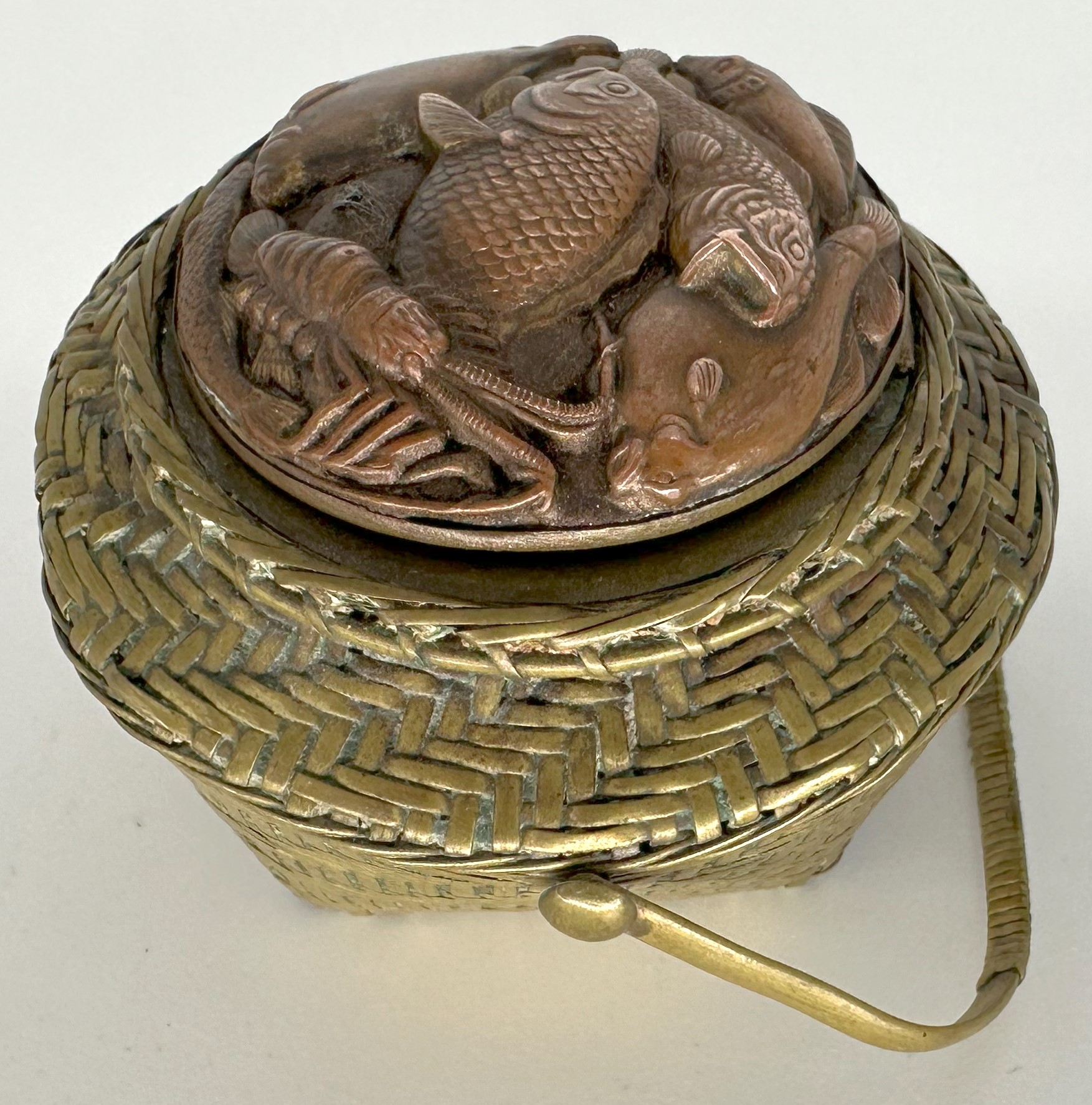 These creels (fishing baskets) are formed with intricately woven wire (brass or bronze). The hinged lids display the day’s catch from the sea: fish, lobster, crab, mollusks, shrimp, crustacea, even an octopus (made from copper or bronze) spilling over the sides.  Some baskets have a snail, crab, lobster or a frog clinging to its side. One of the creels has a handle.