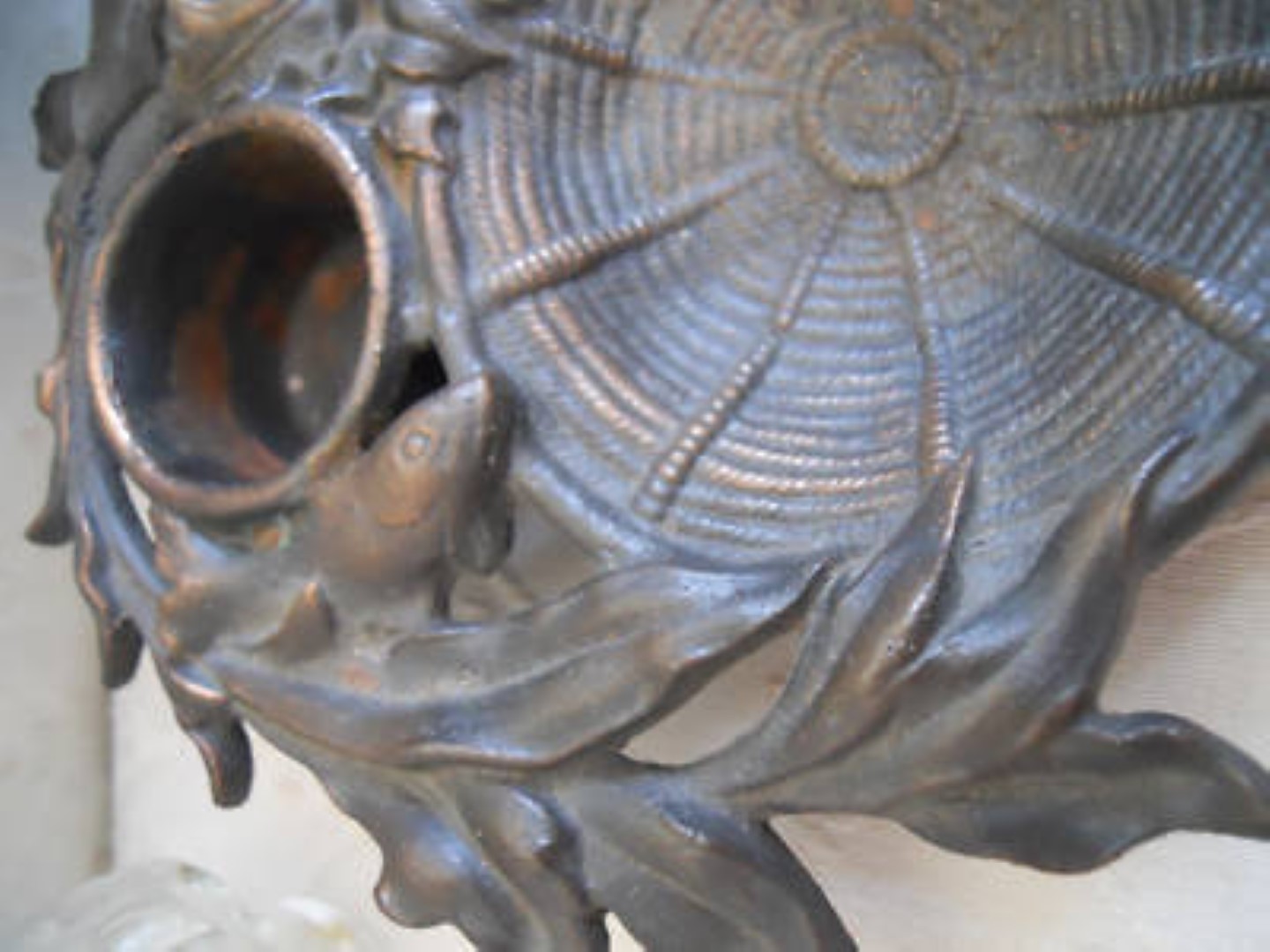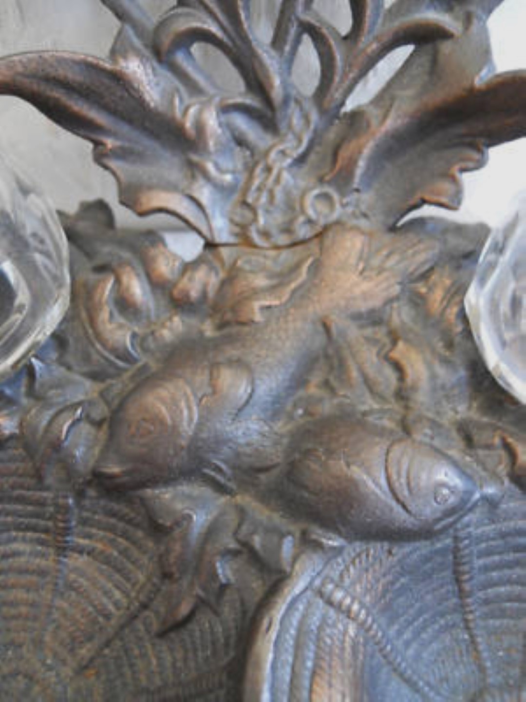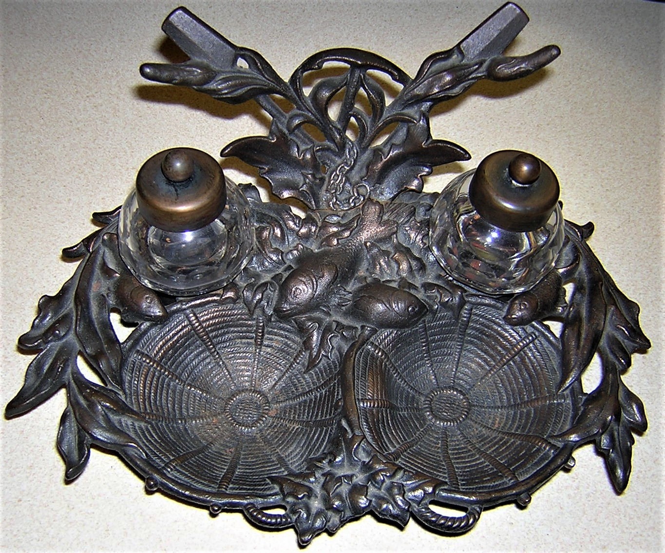 Fishing themed inkstand decorated with fish, seaweed, and fishing baskets (for implements). The pen rack is formed by oars and bullrushes. Stemmed glass inkwells fit into round holders and are fitted with loose lids. Made of cast iron, then bronzed.