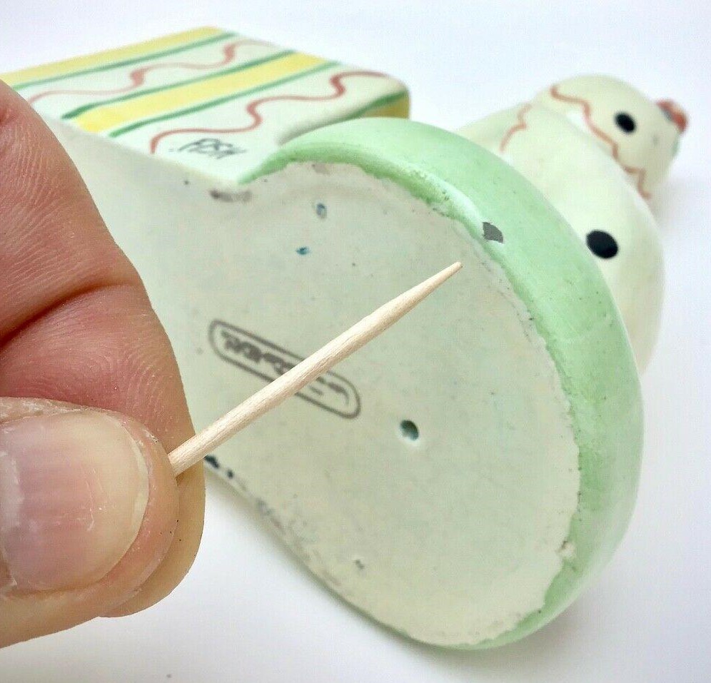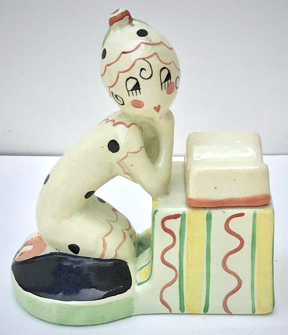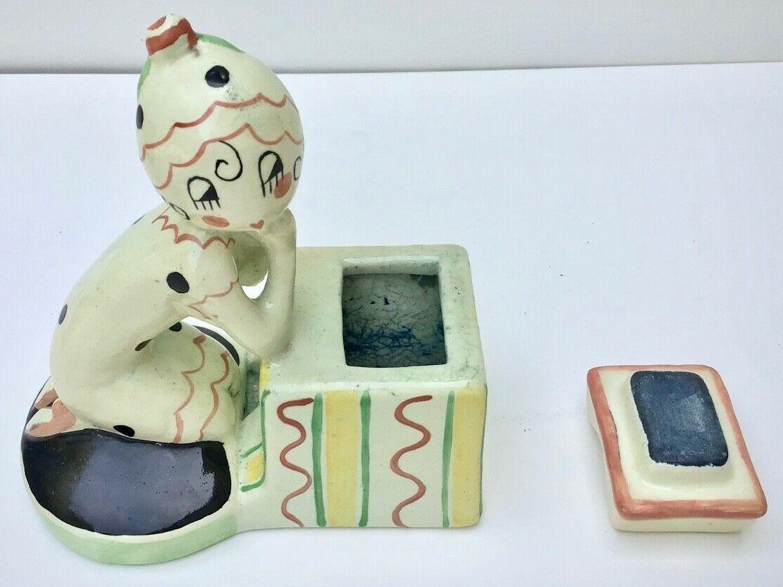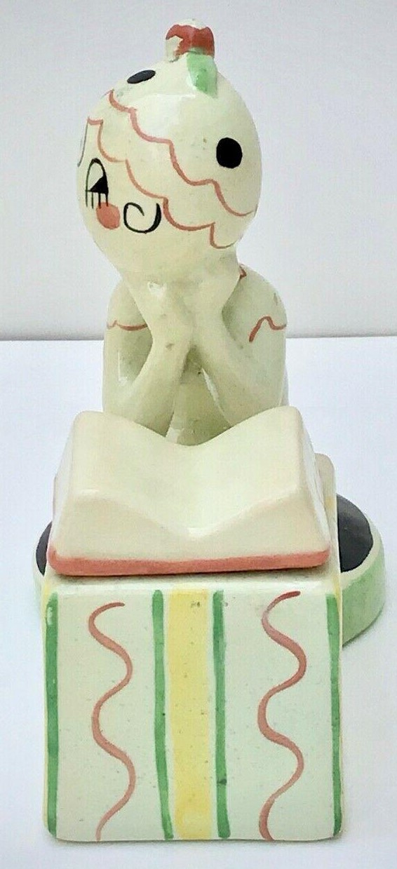 Also pictured is a bellhop holding a package – lift the lid to access the inkwell. This piece was also made by Fulper Pottery and designed by Anne Harriet Fish.