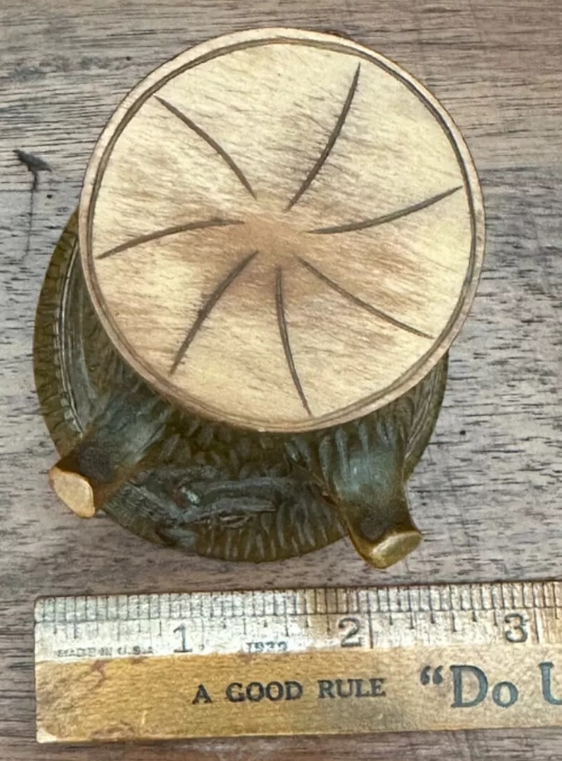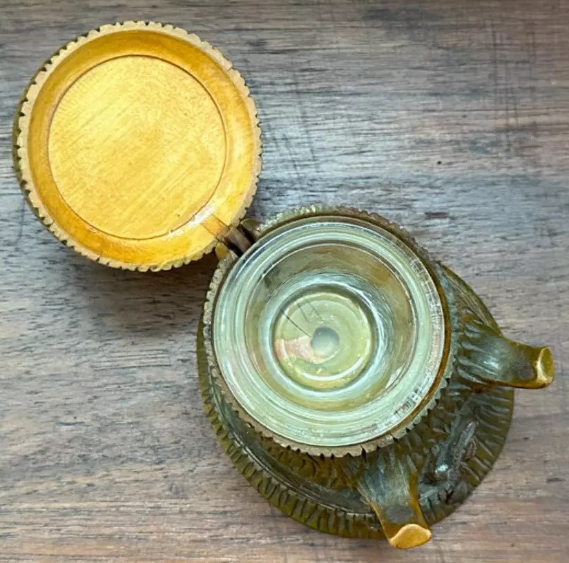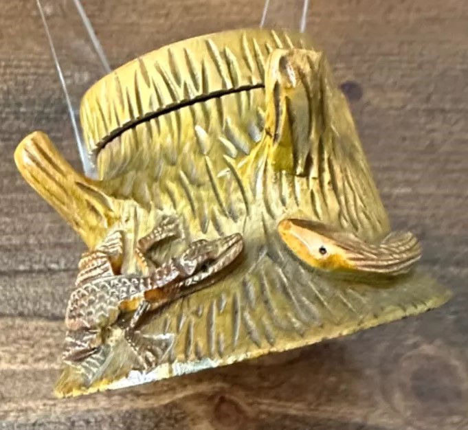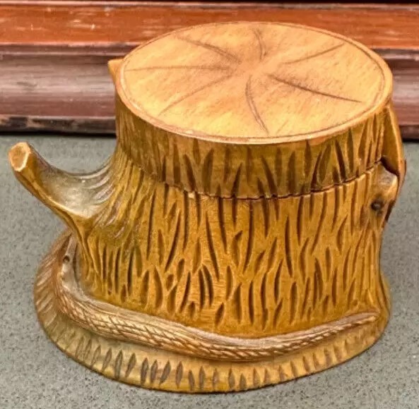 Two aggressive inhabitants of Florida waterways – an alligator and a python – are at a standoff on this hand carved inkwell in the form of a stump. Nubs of branches form a pen holder.