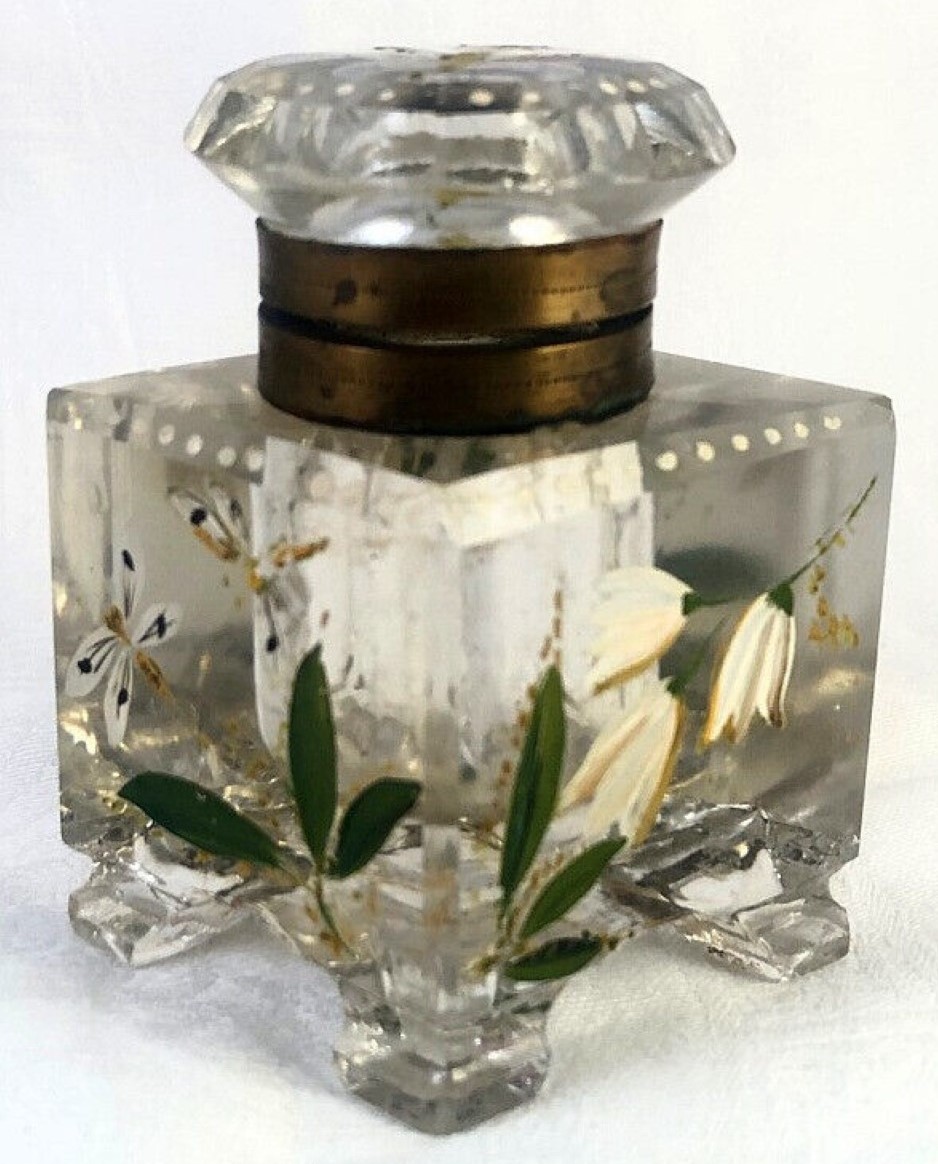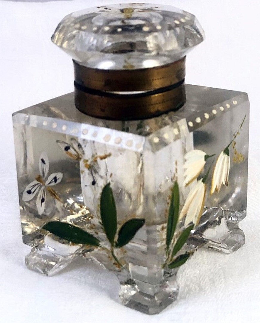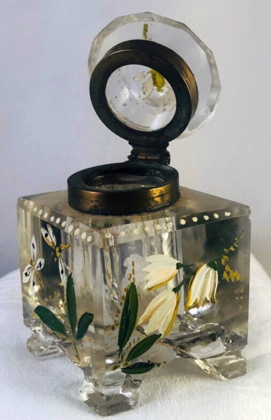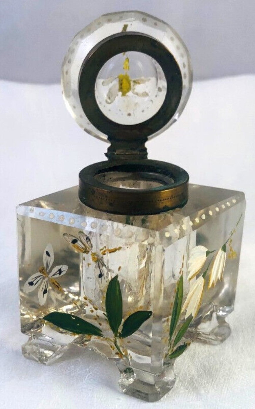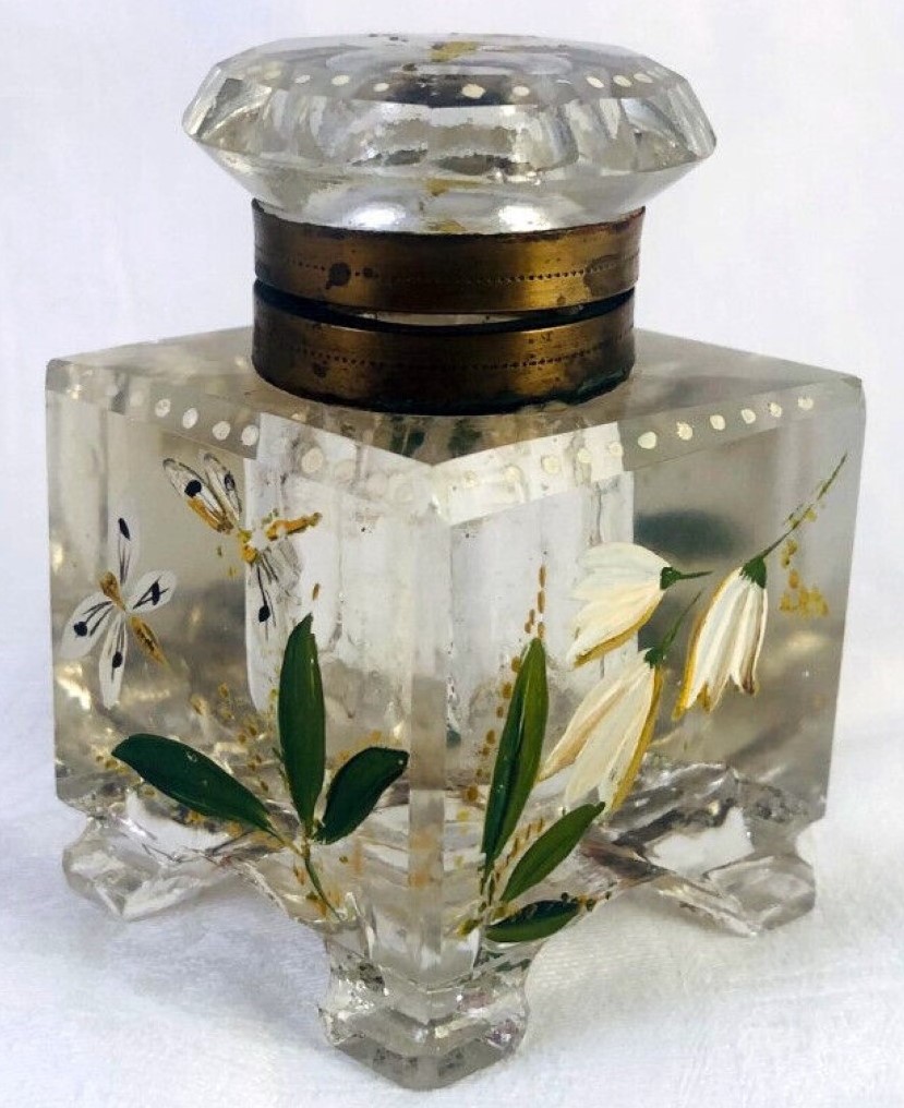 A footed cut glass inkwell with hand-enameled flowers and dragonflies. Cushion-shaped lid with brass mounts.
