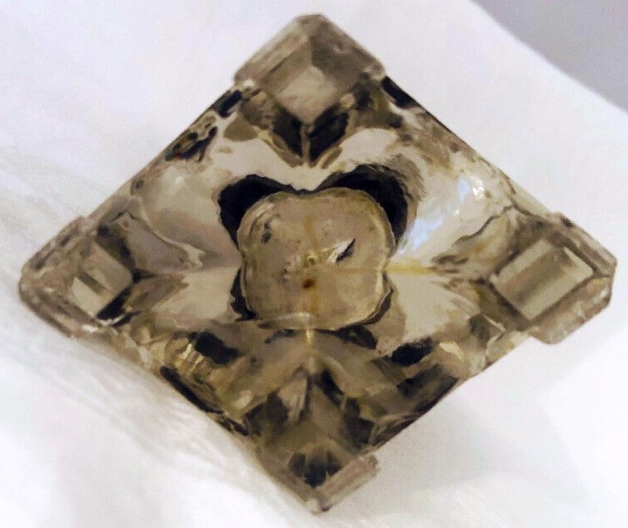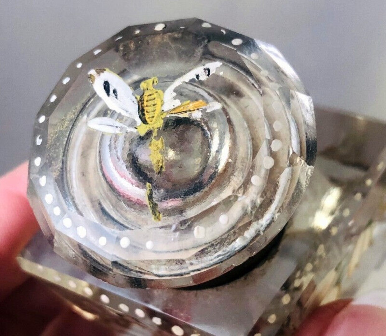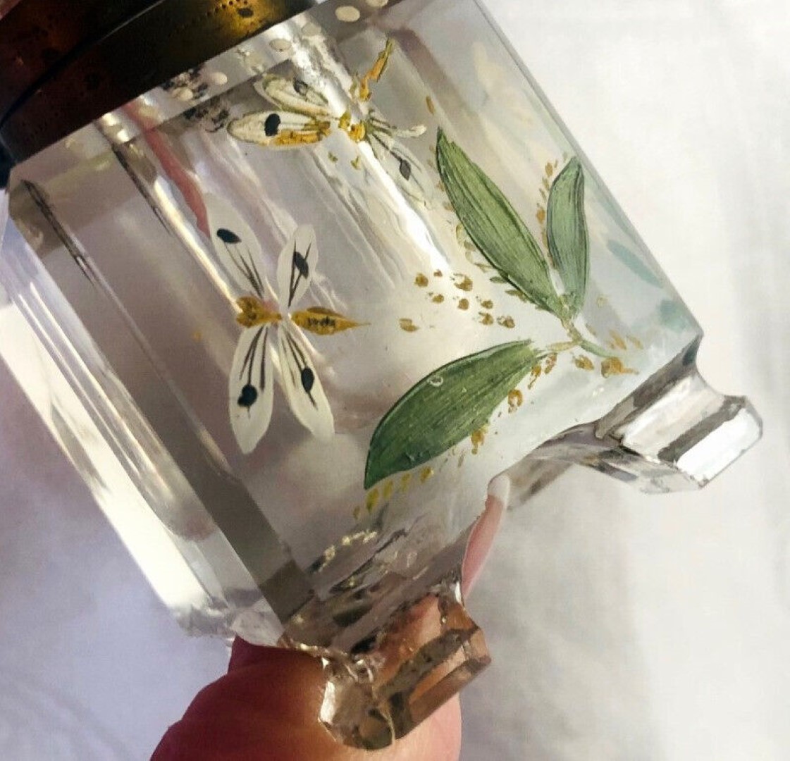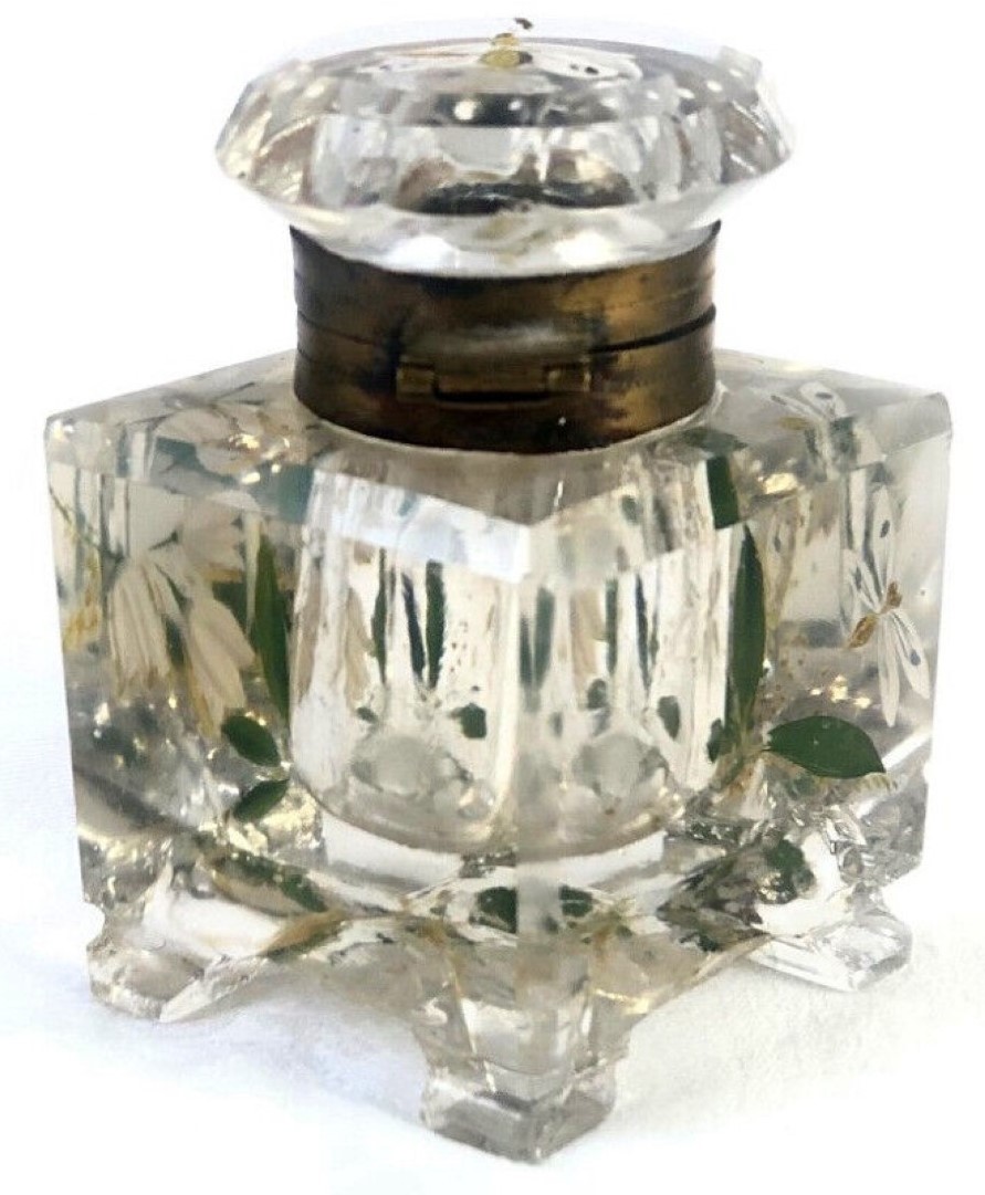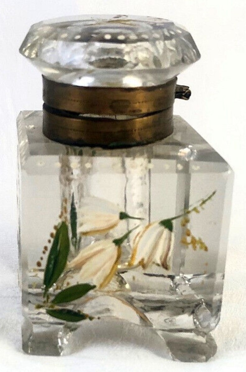 A footed cut glass inkwell with hand-enameled flowers and dragonflies. Cushion-shaped lid with brass mounts.