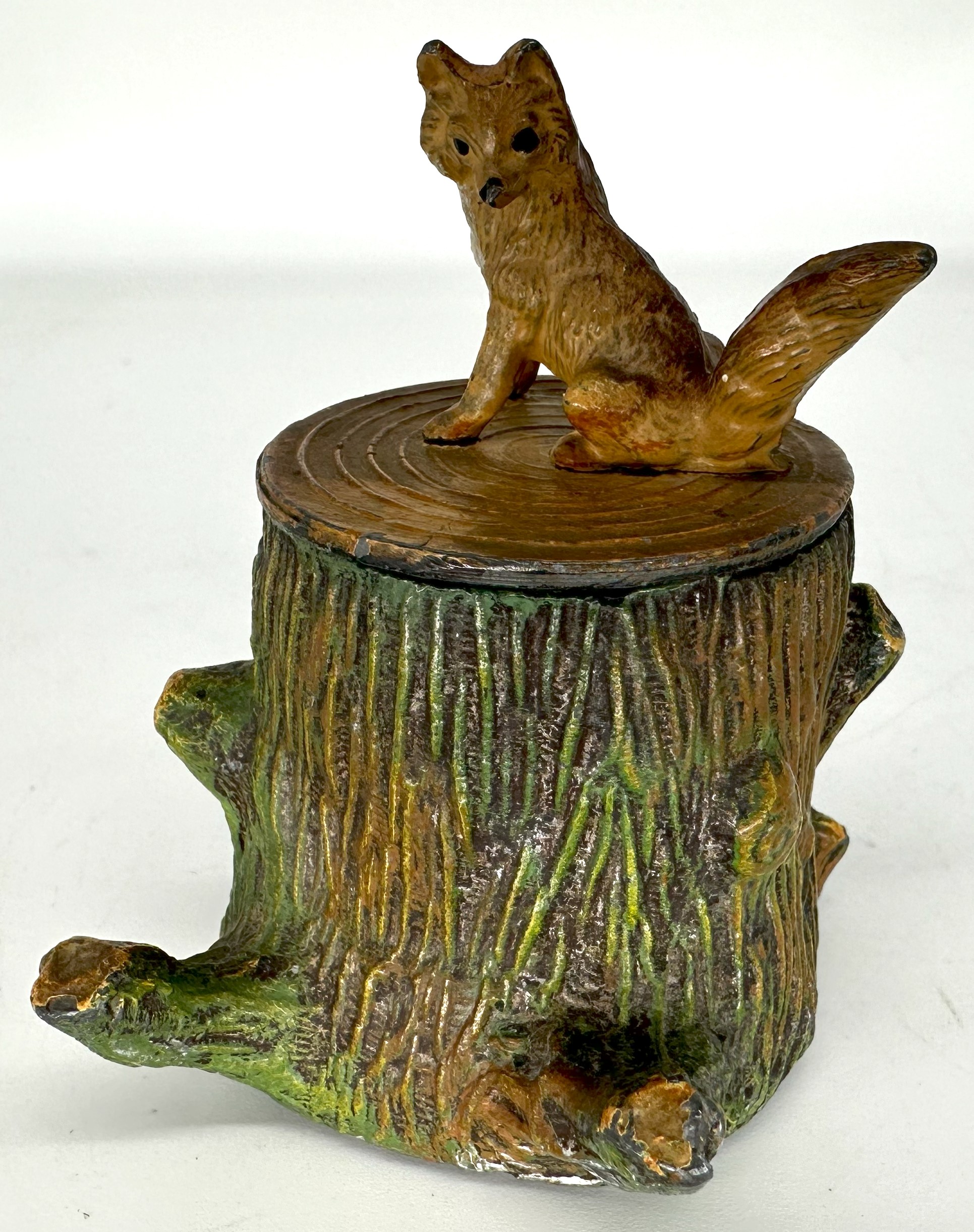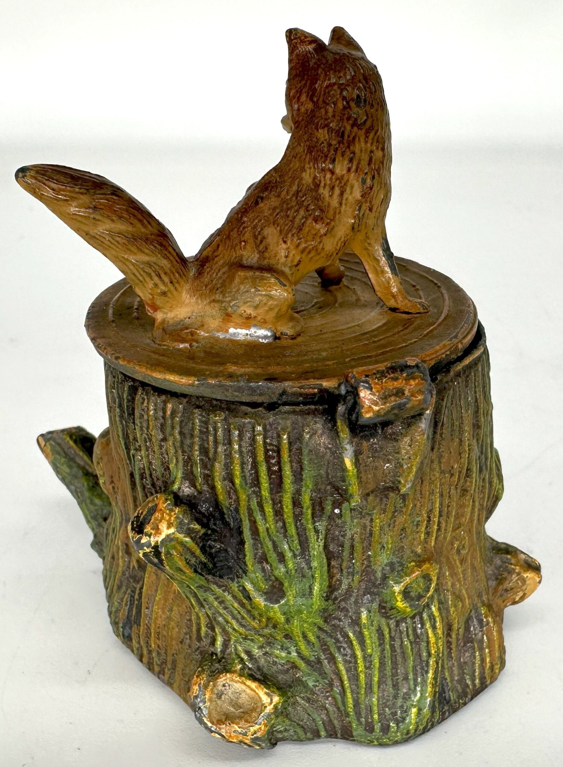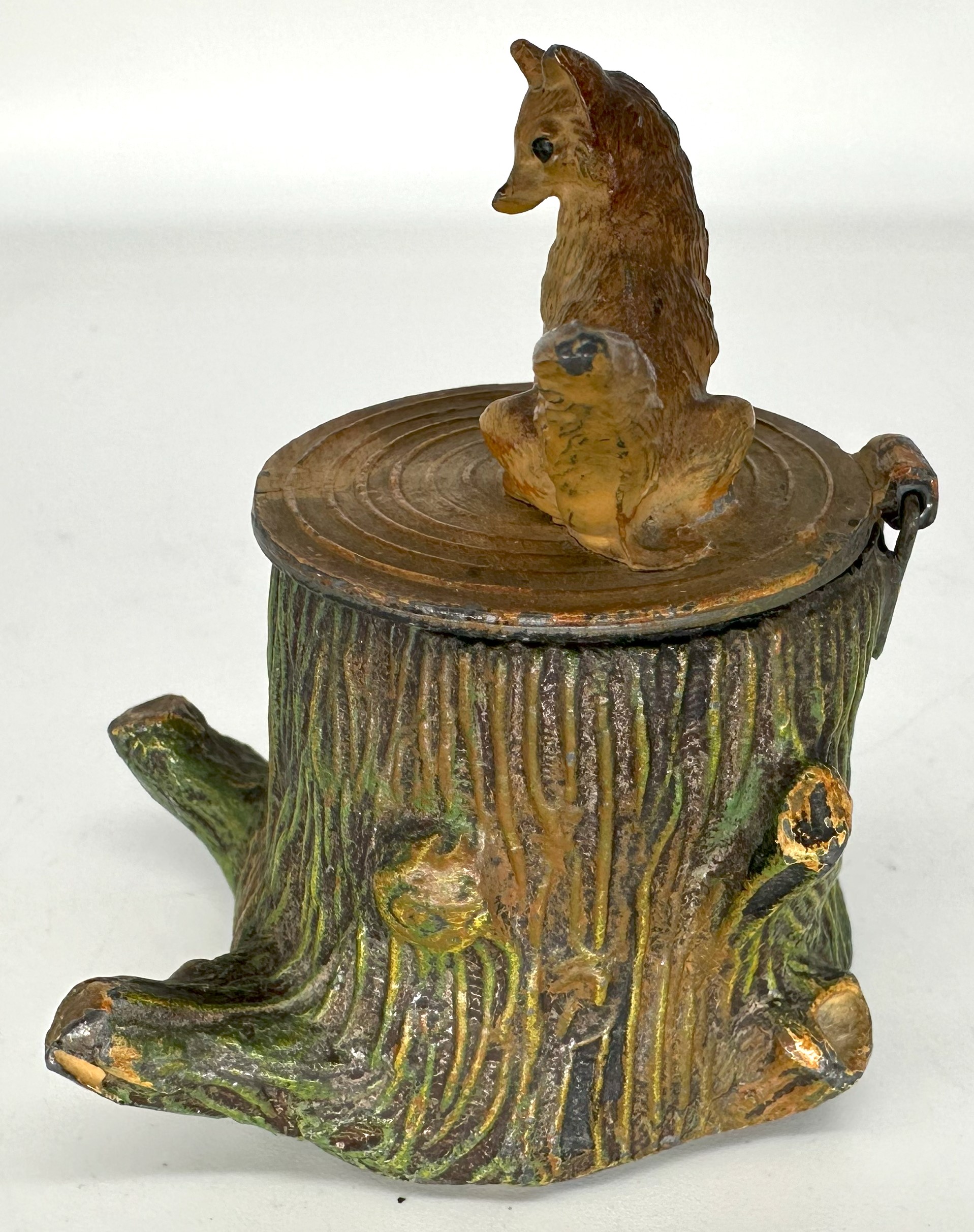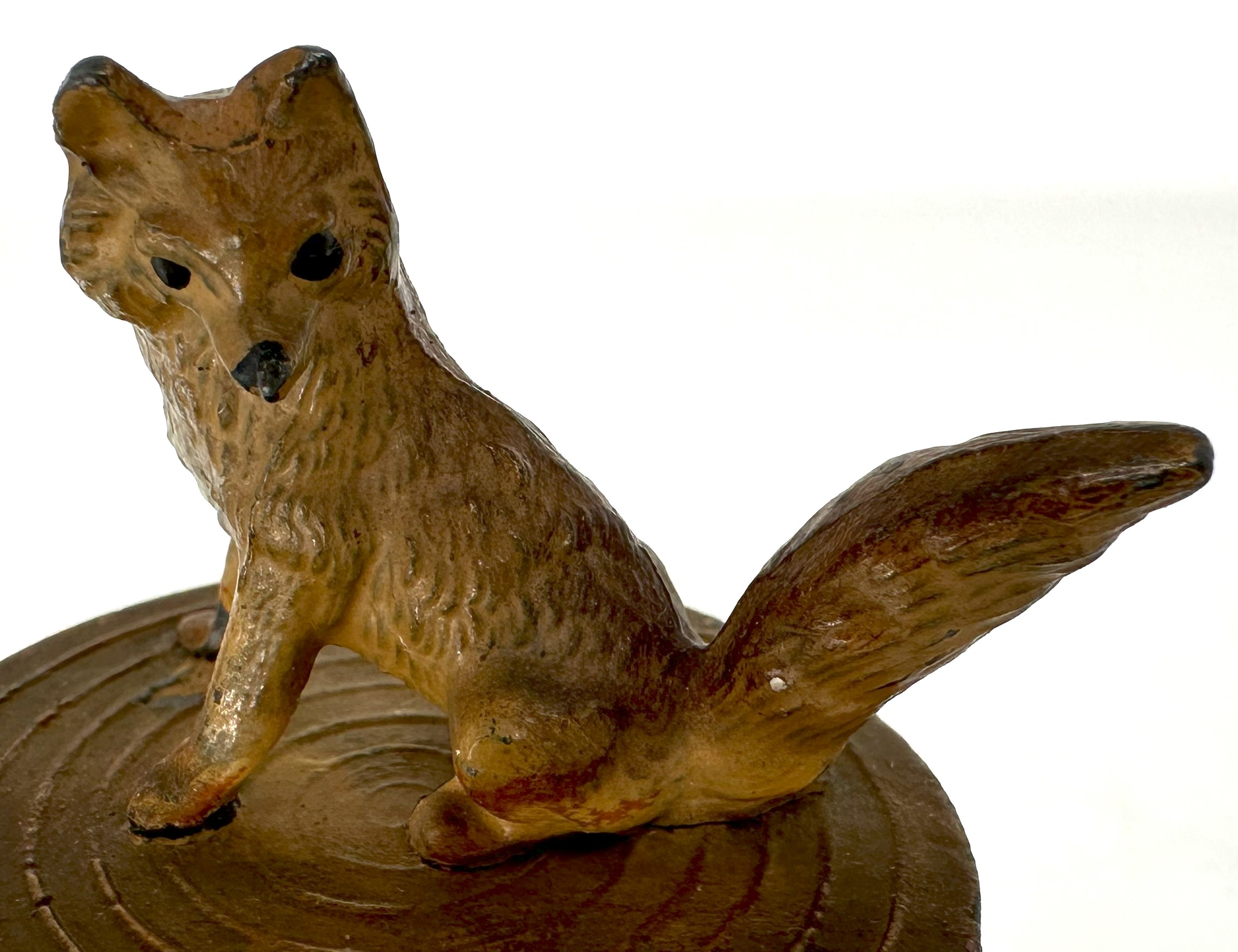 A hand painted cast metal red fox is perched atop a tree stump (inkwell). The top of the stump is hinged, opening to access the ink. The knots on the stump act as a pen holder.