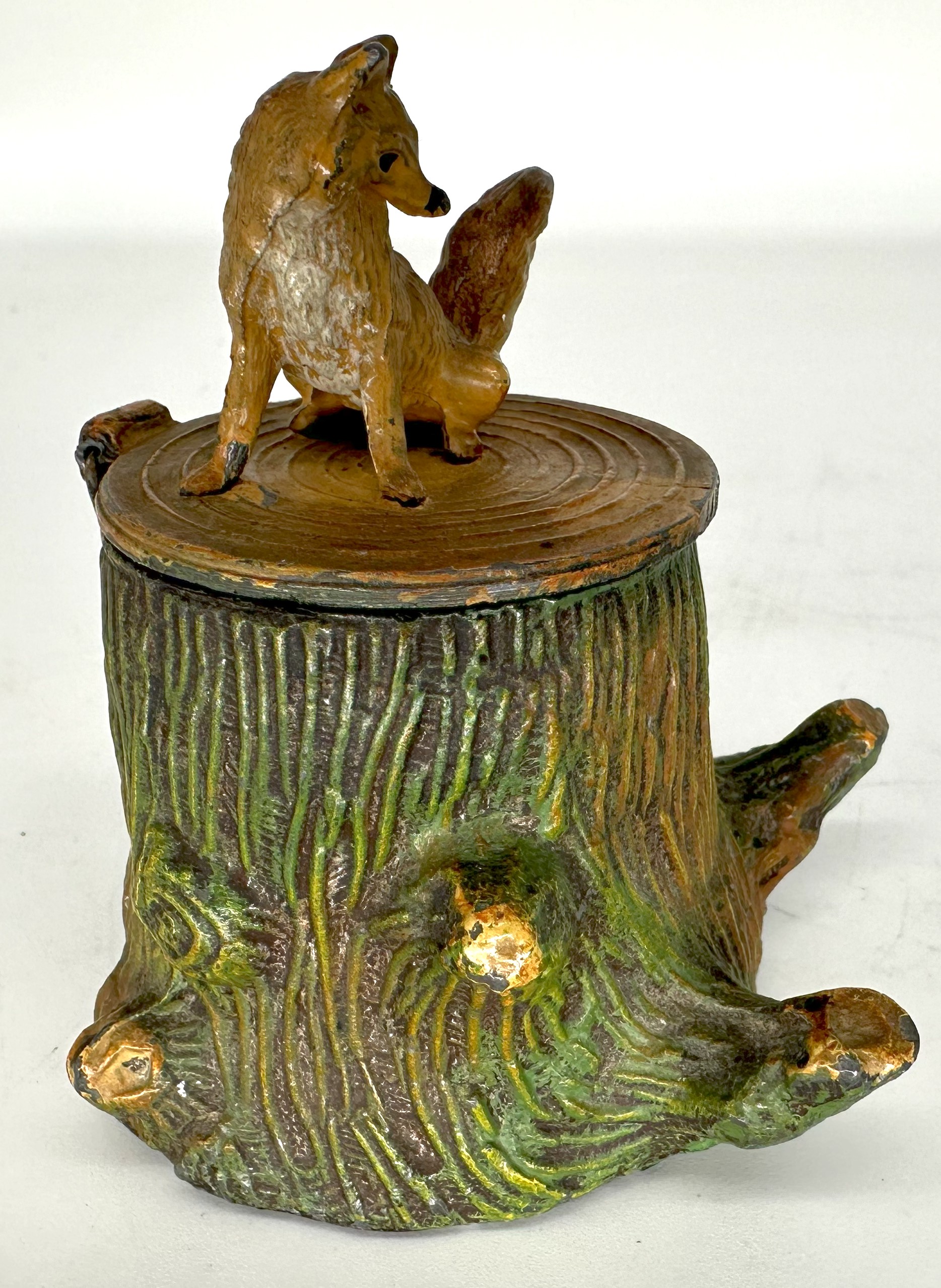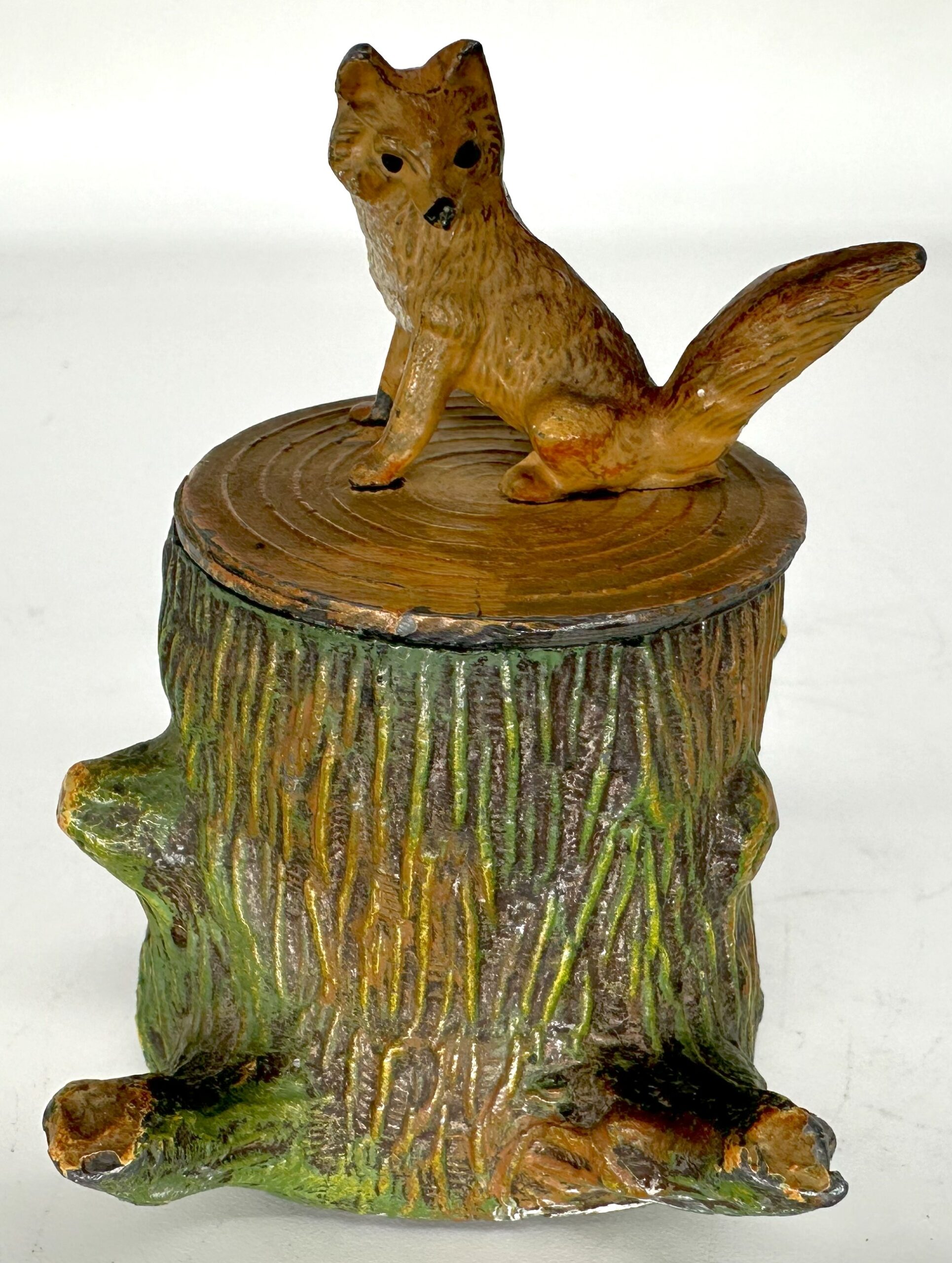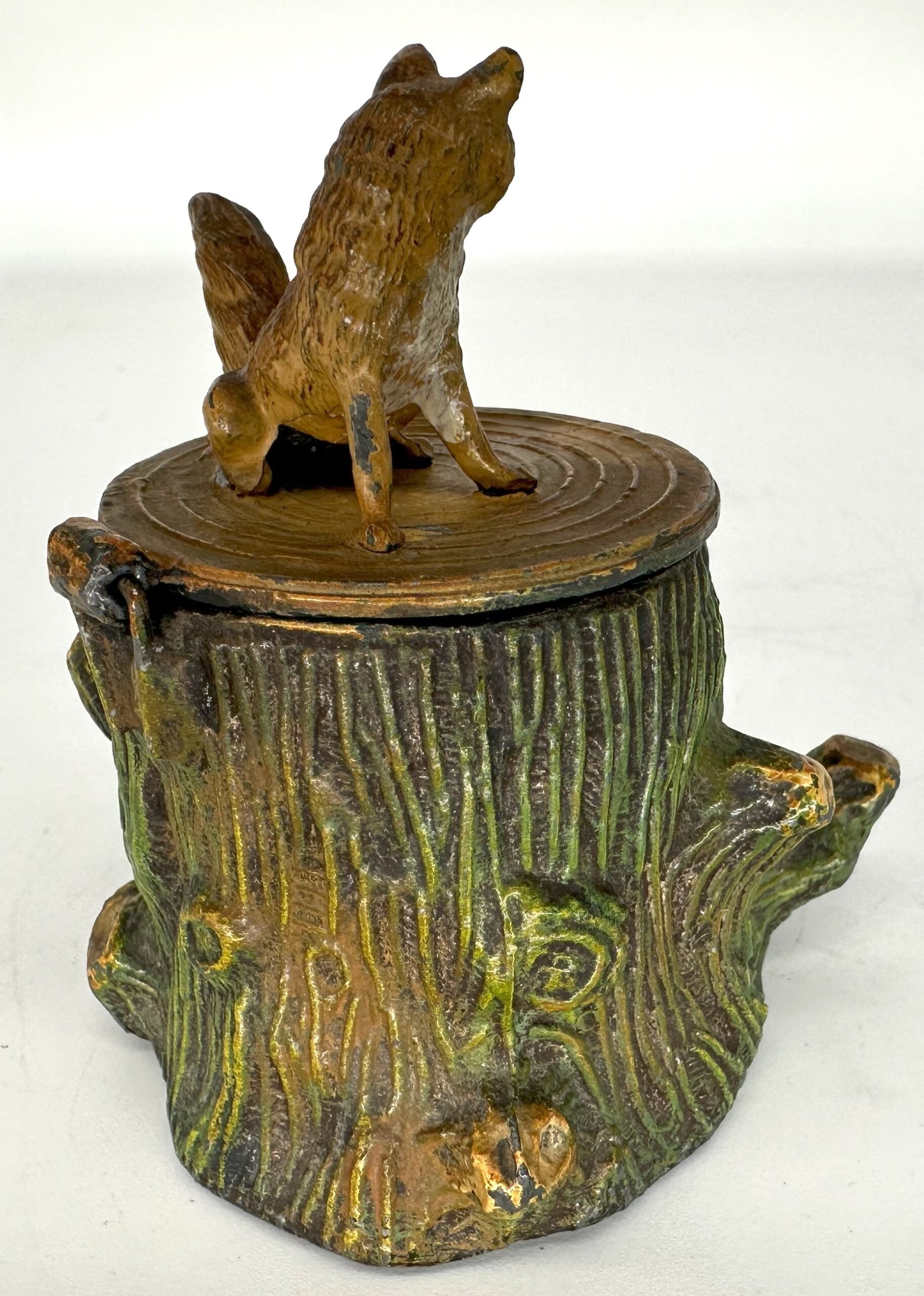 A hand painted cast metal red fox is perched atop a tree stump (inkwell). The top of the stump is hinged, opening to access the ink. The knots on the stump act as a pen holder.