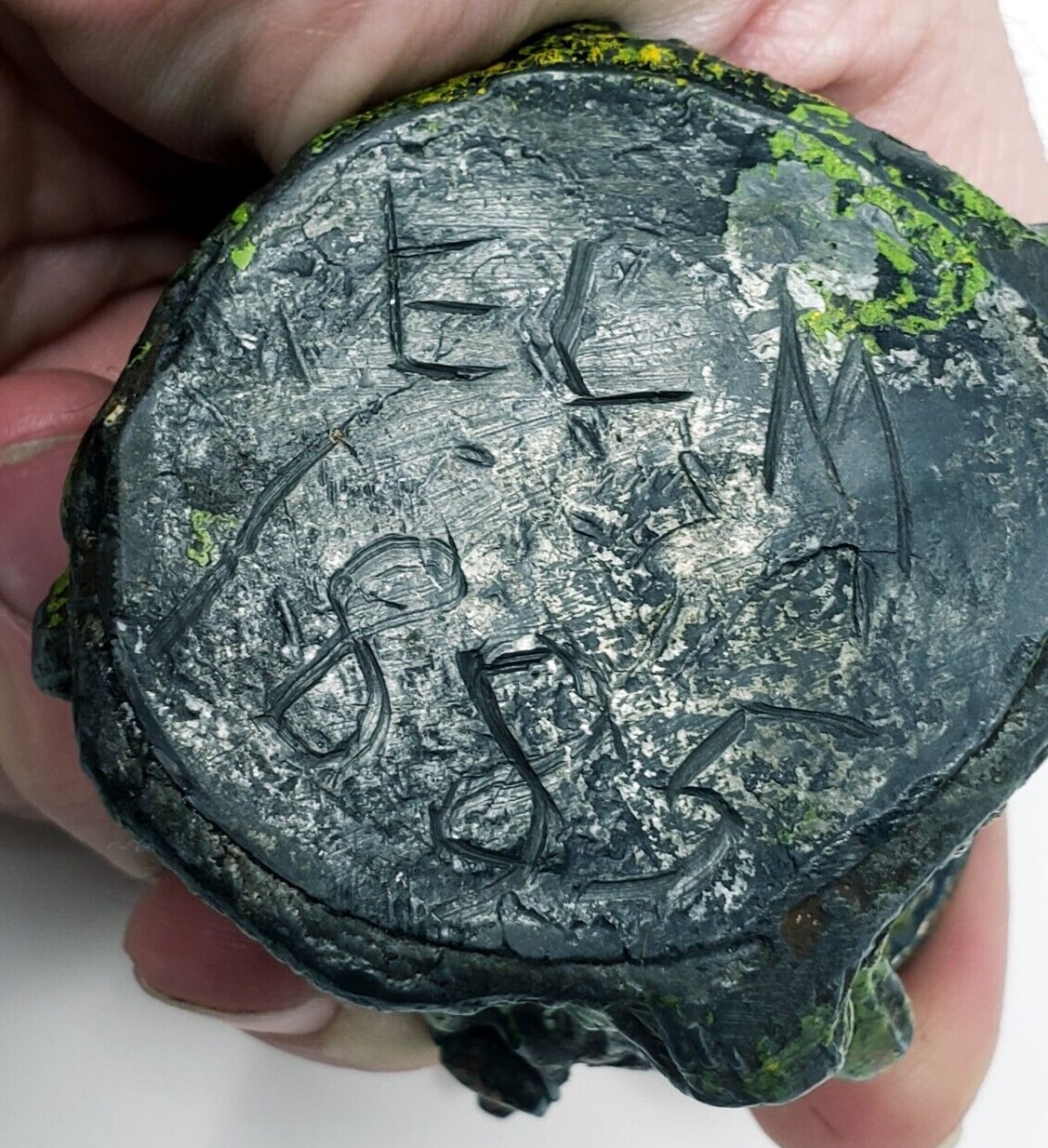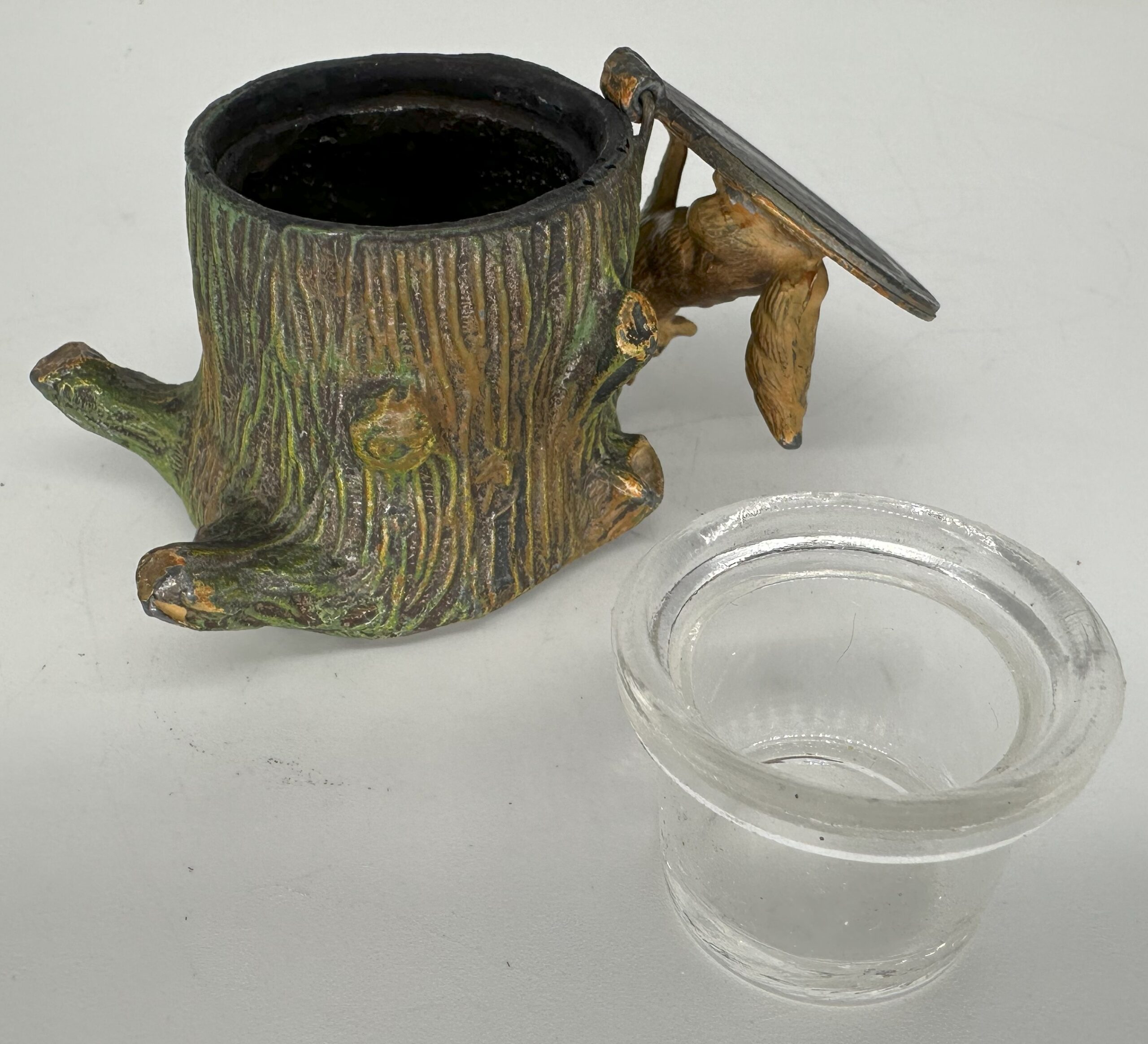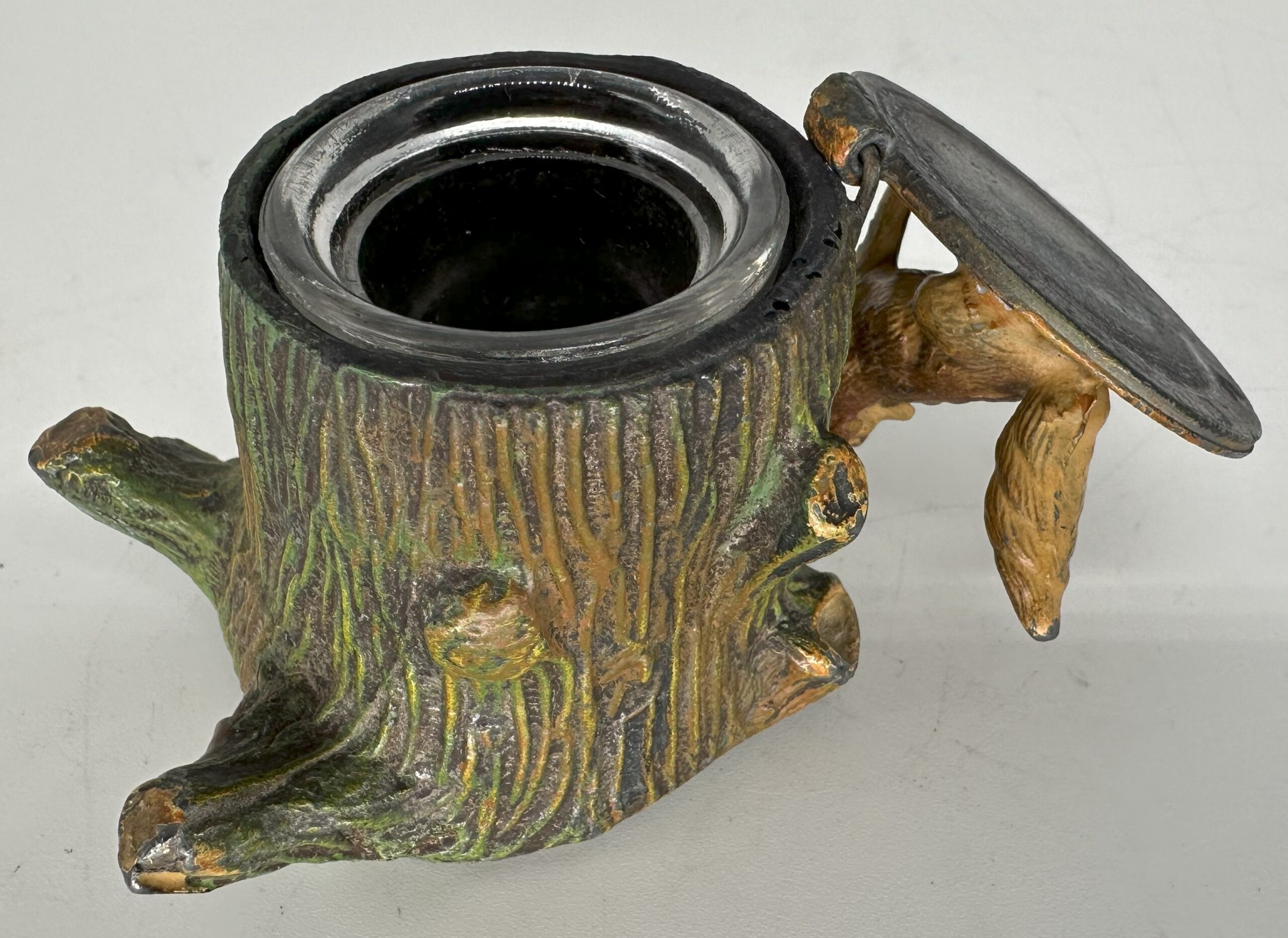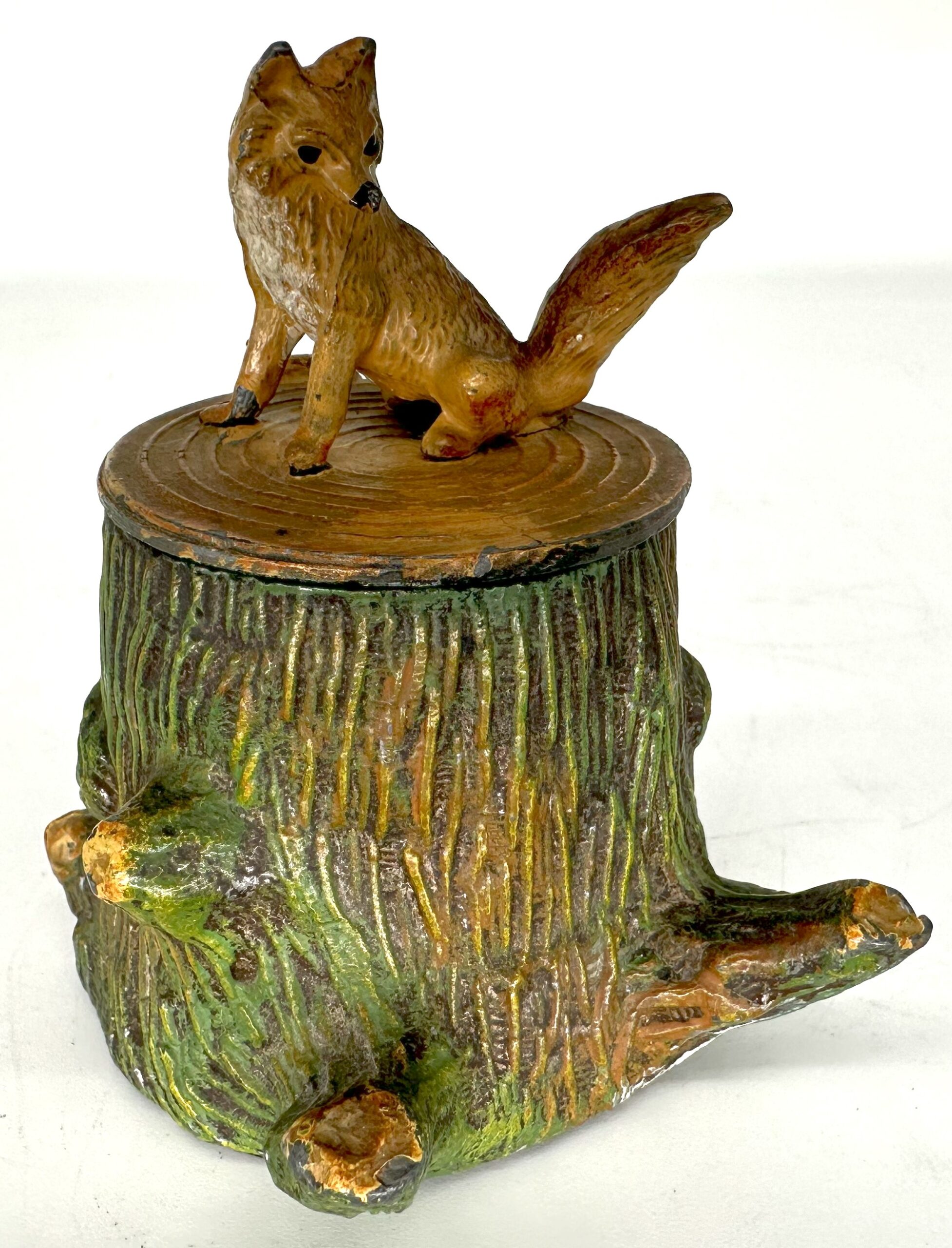 A hand painted cast metal red fox is perched atop a tree stump (inkwell). The top of the stump is hinged, opening to access the ink. The knots on the stump act as a pen holder.