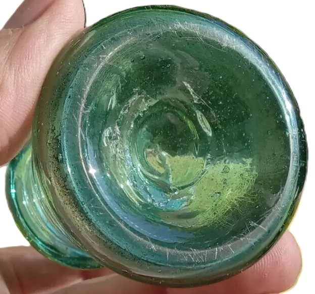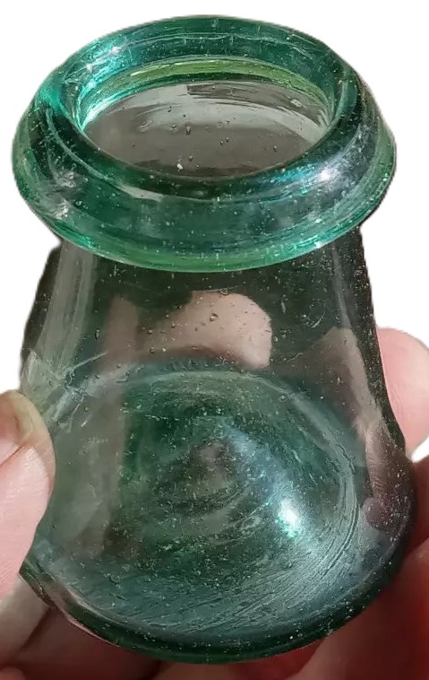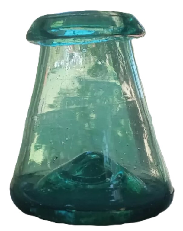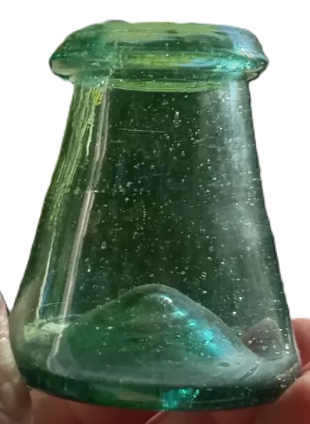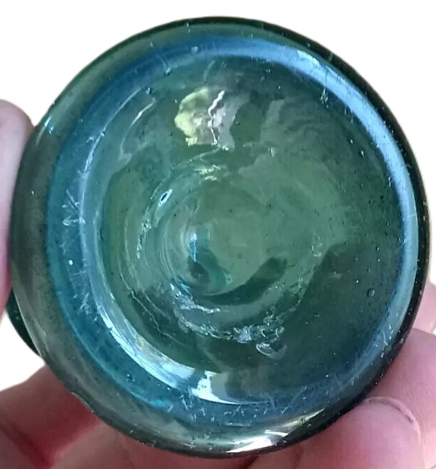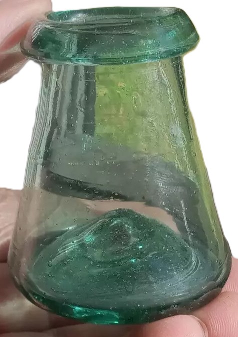 This early, open pontil, free blown conical ink bottle comes from an American glasshouse. It is free blown, so it has no mold seams. Light green (or dark greenish aqua) in color, it has a sunken bottom and a rolled over ring lip. It dates from the 1840s to 1850s.