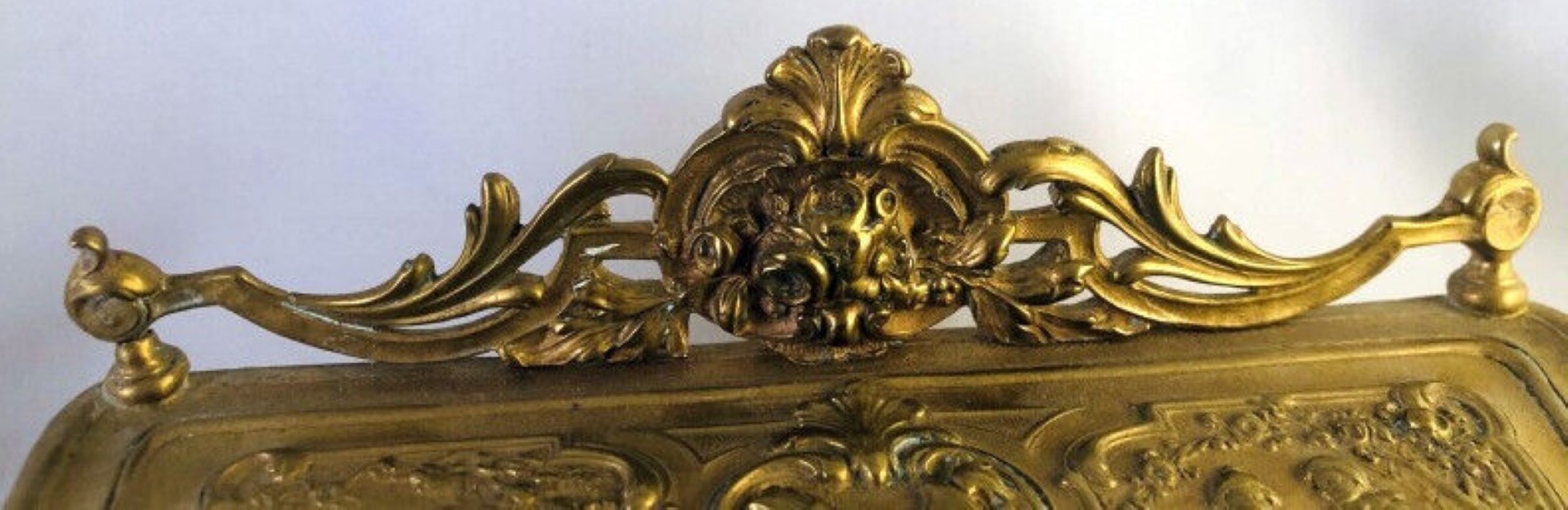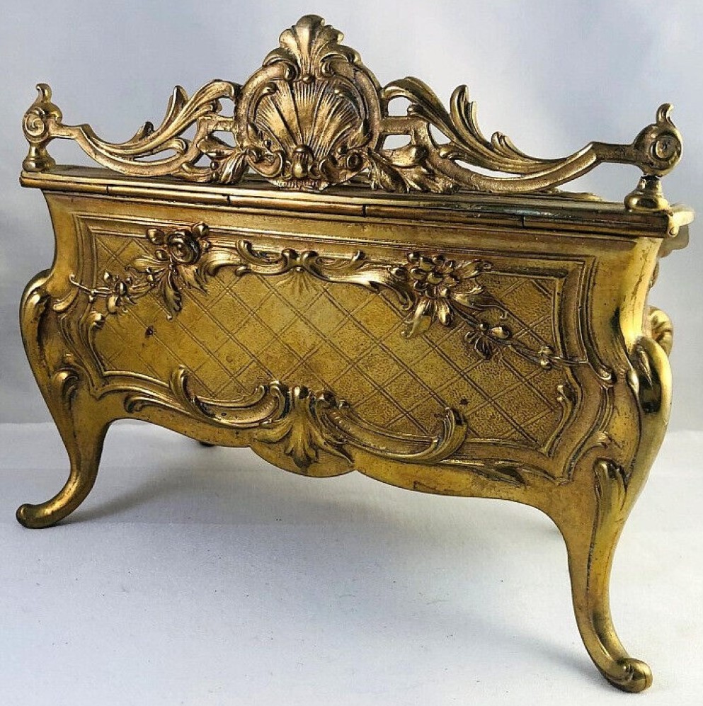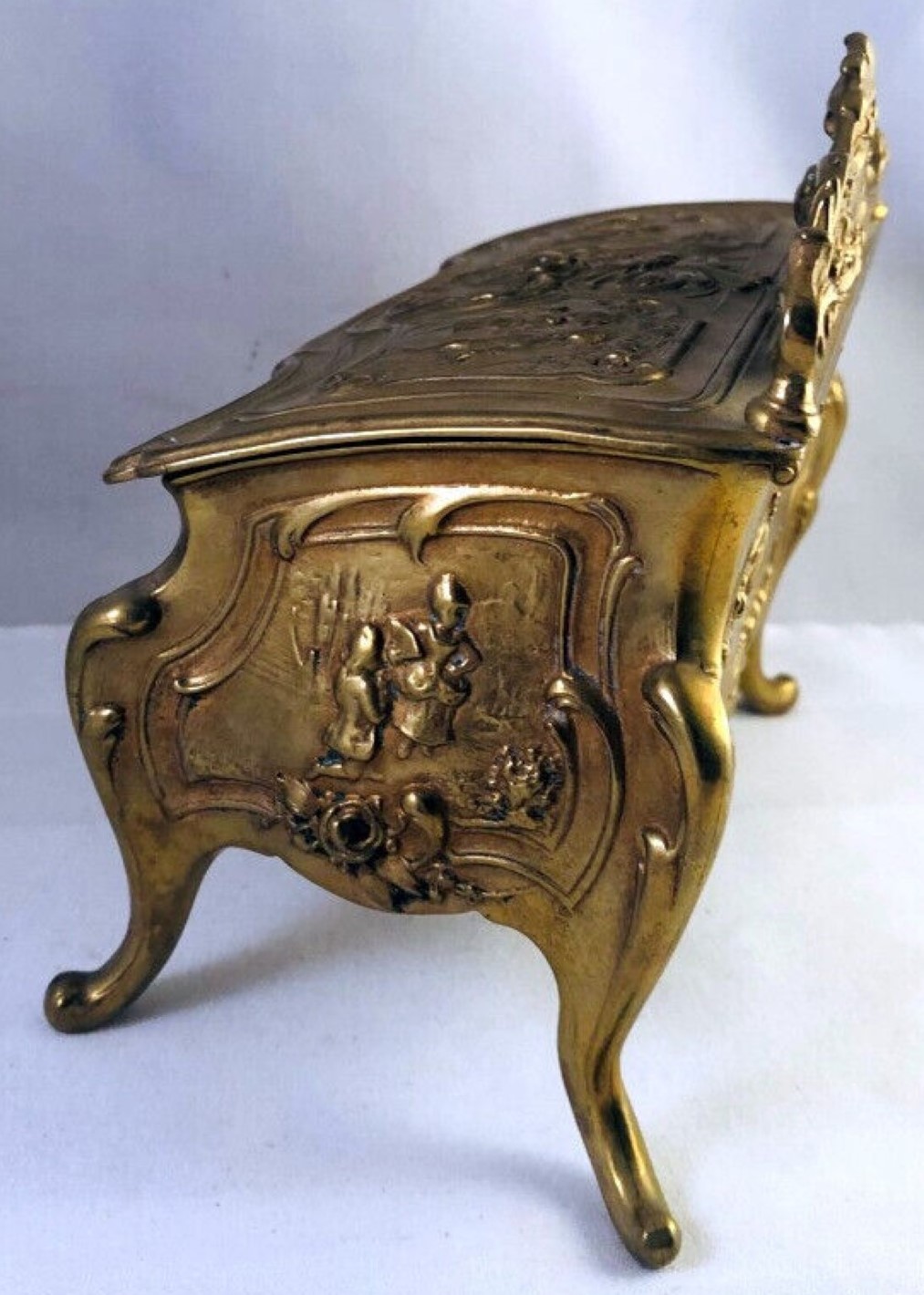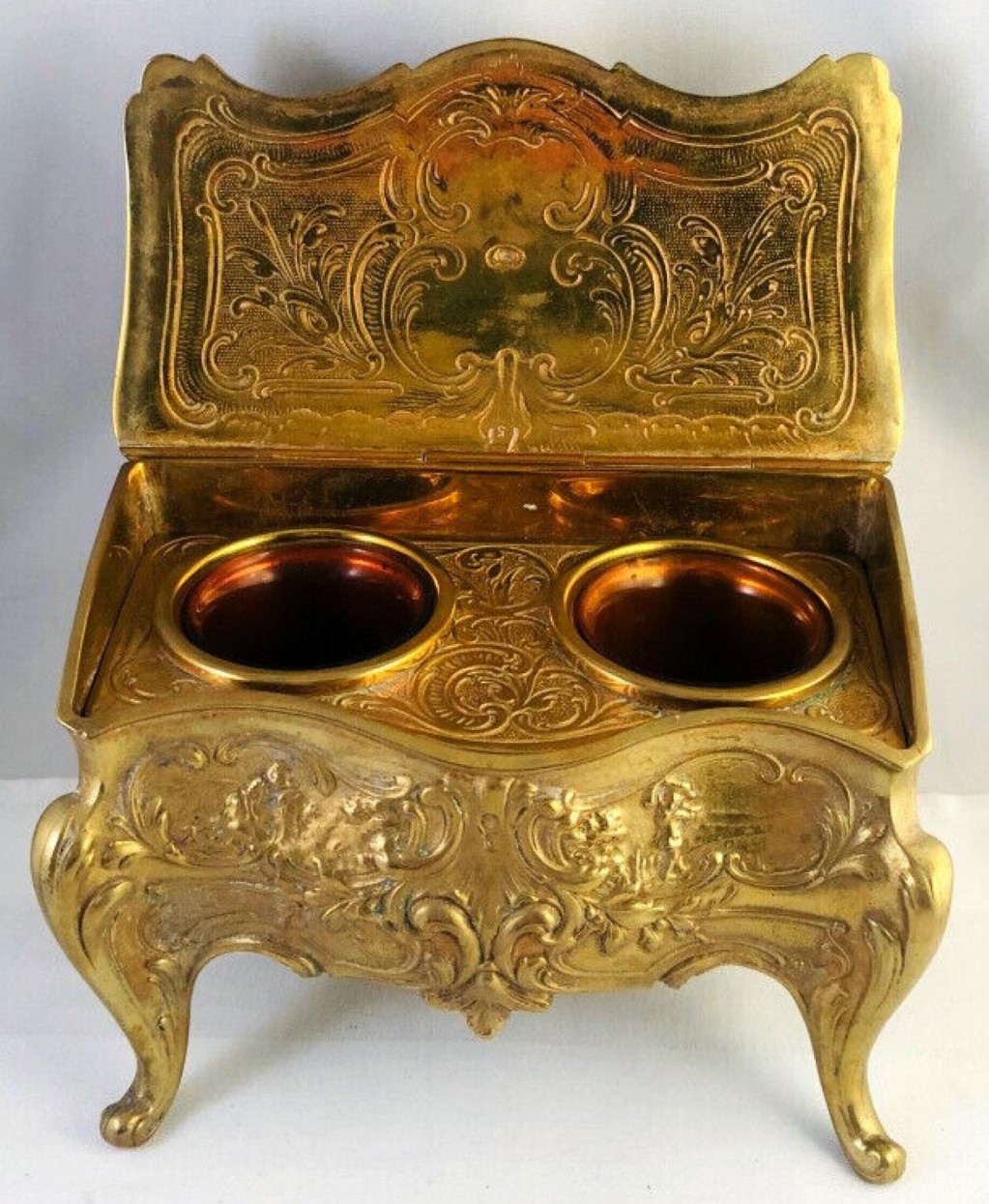 Cast brass figural double inkwell in the form of a French Bombé desk or bureau with a lift-off top. Open the hinged top to access  to amber blown glass inkwells. No embellishment was too elaborate for this Baroque style inkstand, from the serpentine front to the foliate legs, to the elaborate embossing on every surface, including the sides and back. Flowers, leaves, shells, scenes of courting couples and farmers in their fields, all done in highly detailed relief.