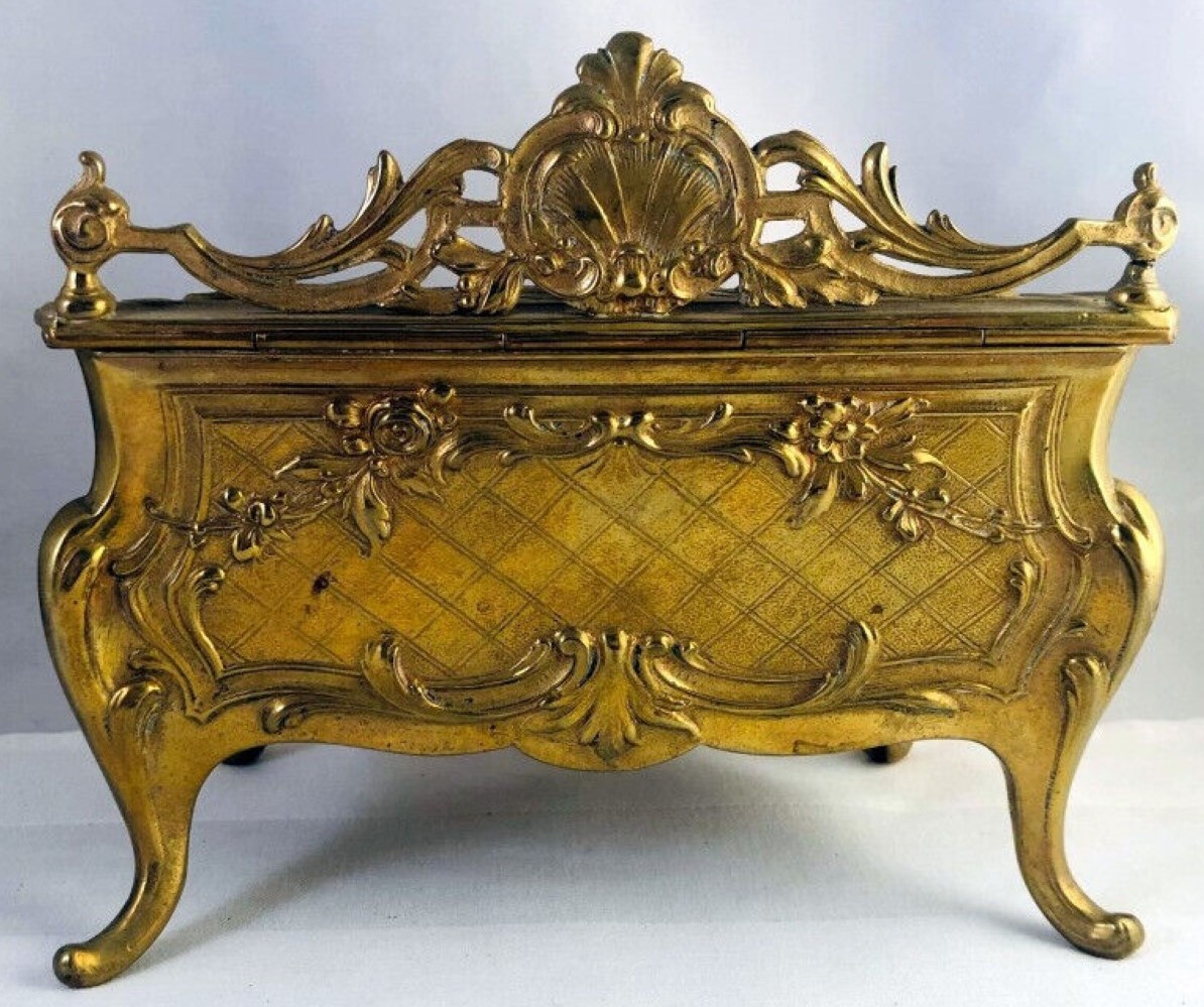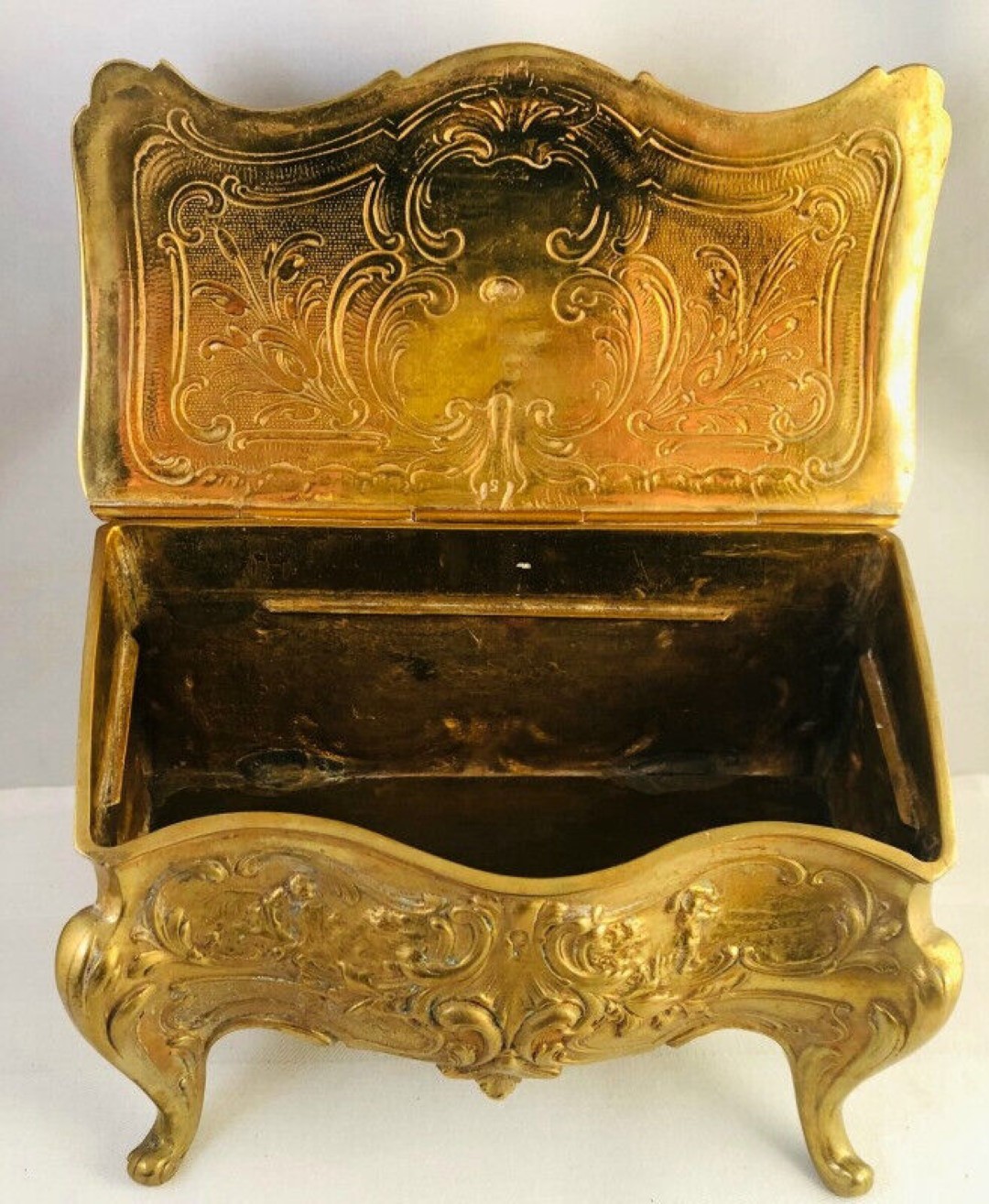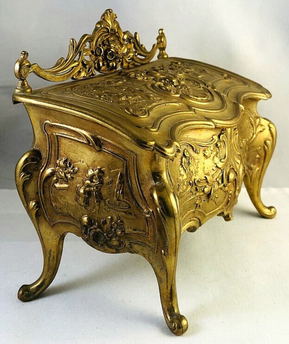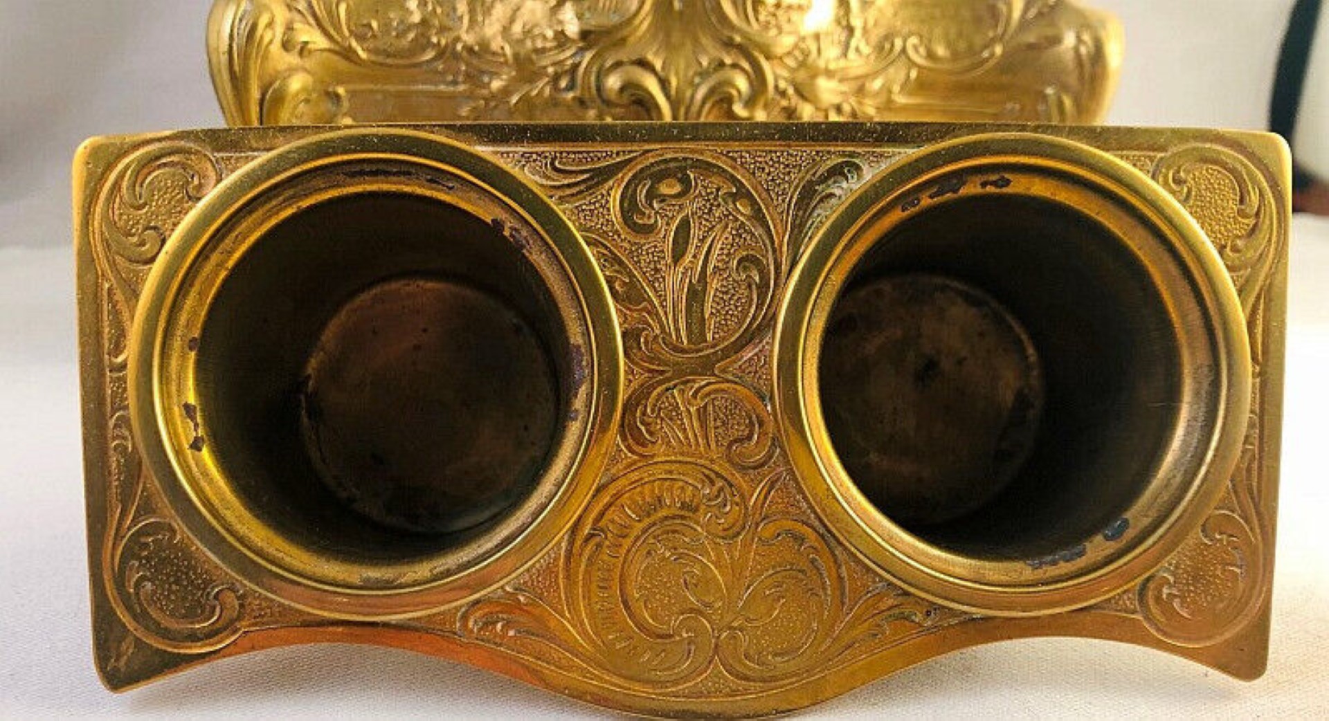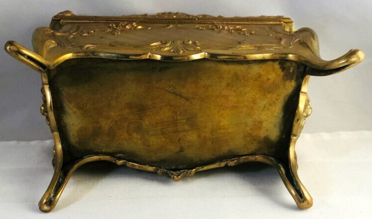 Cast brass figural double inkwell in the form of a French Bombé desk or bureau with a lift-off top. Open the hinged top to access  to amber blown glass inkwells. No embellishment was too elaborate for this Baroque style inkstand, from the serpentine front to the foliate legs, to the elaborate embossing on every surface, including the sides and back. Flowers, leaves, shells, scenes of courting couples and farmers in their fields, all done in highly detailed relief.
