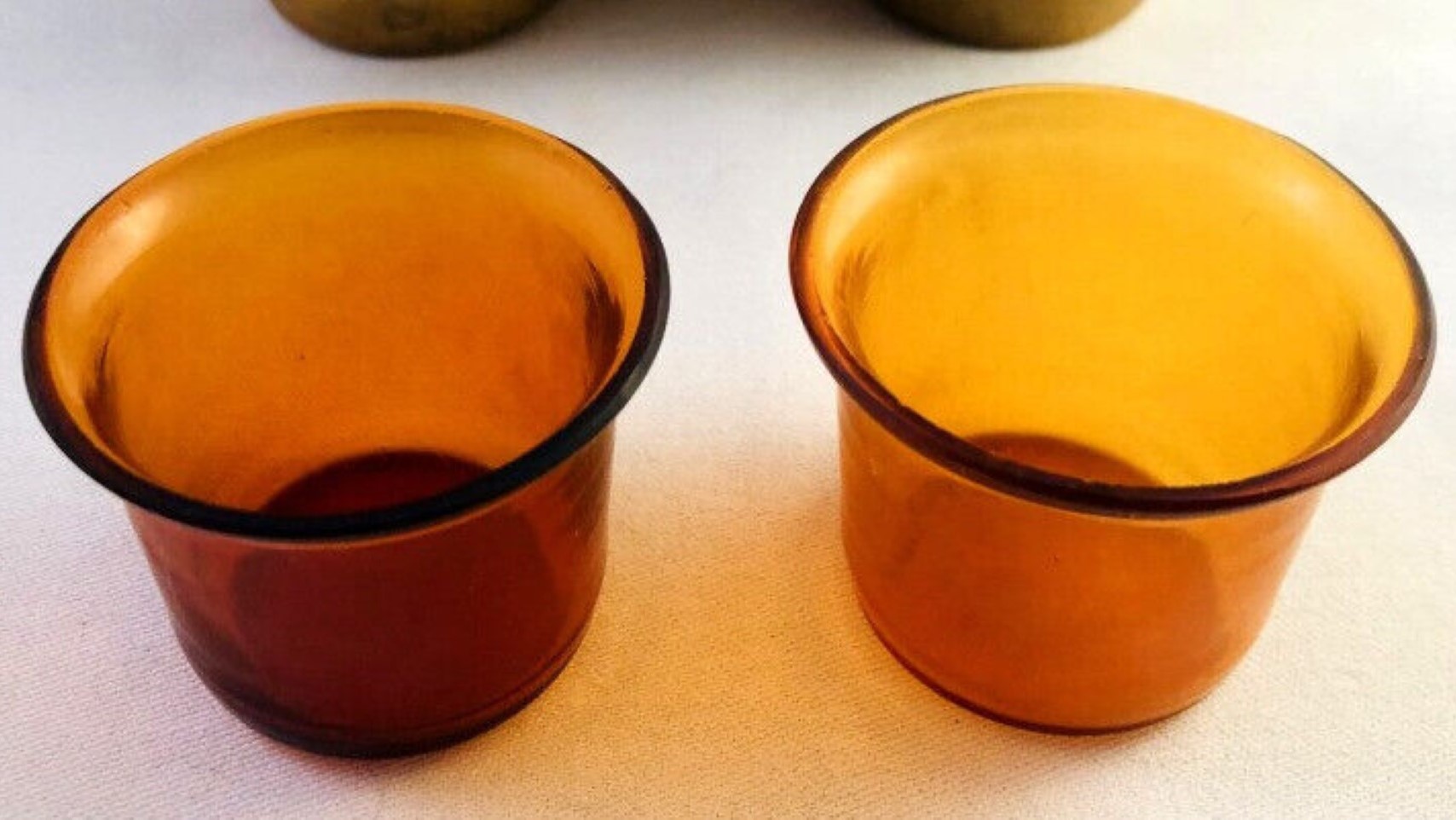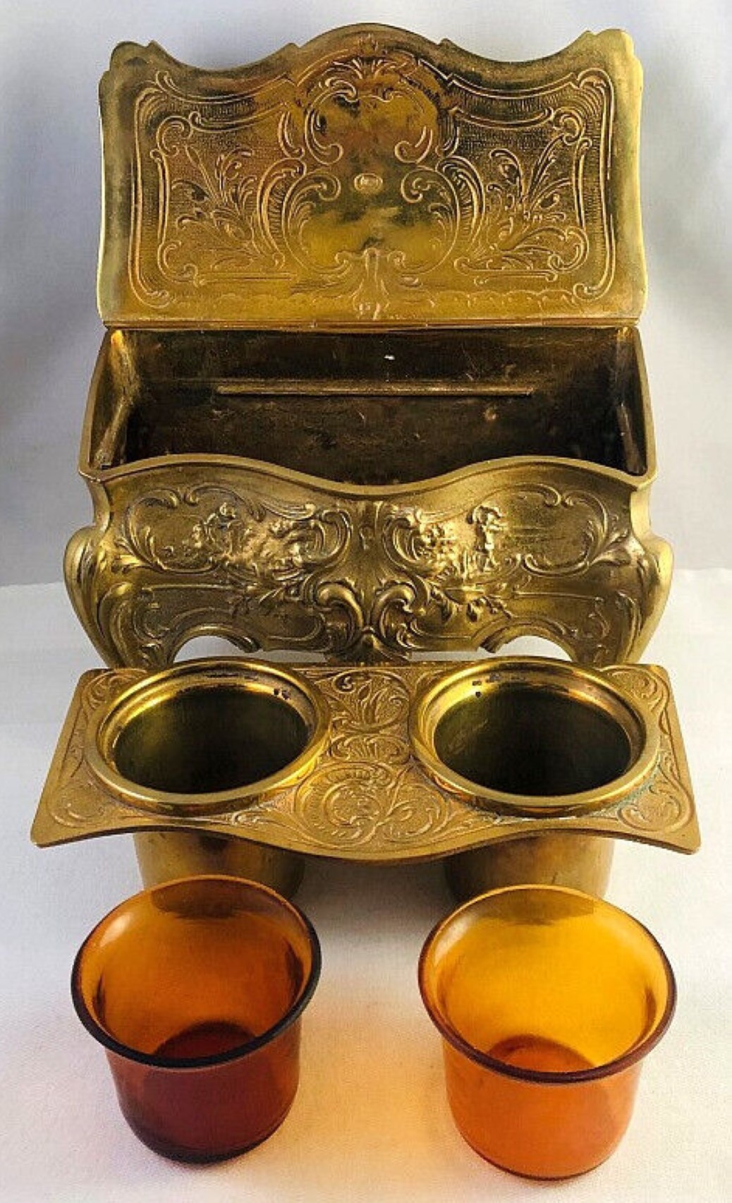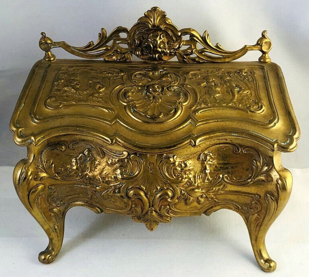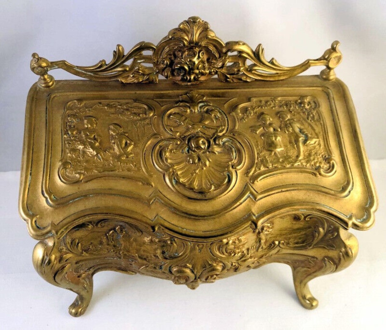 Cast brass figural double inkwell in the form of a French Bombé desk or bureau with a lift-off top. Open the hinged top to access  to amber blown glass inkwells. No embellishment was too elaborate for this Baroque style inkstand, from the serpentine front to the foliate legs, to the elaborate embossing on every surface, including the sides and back. Flowers, leaves, shells, scenes of courting couples and farmers in their fields, all done in highly detailed relief.