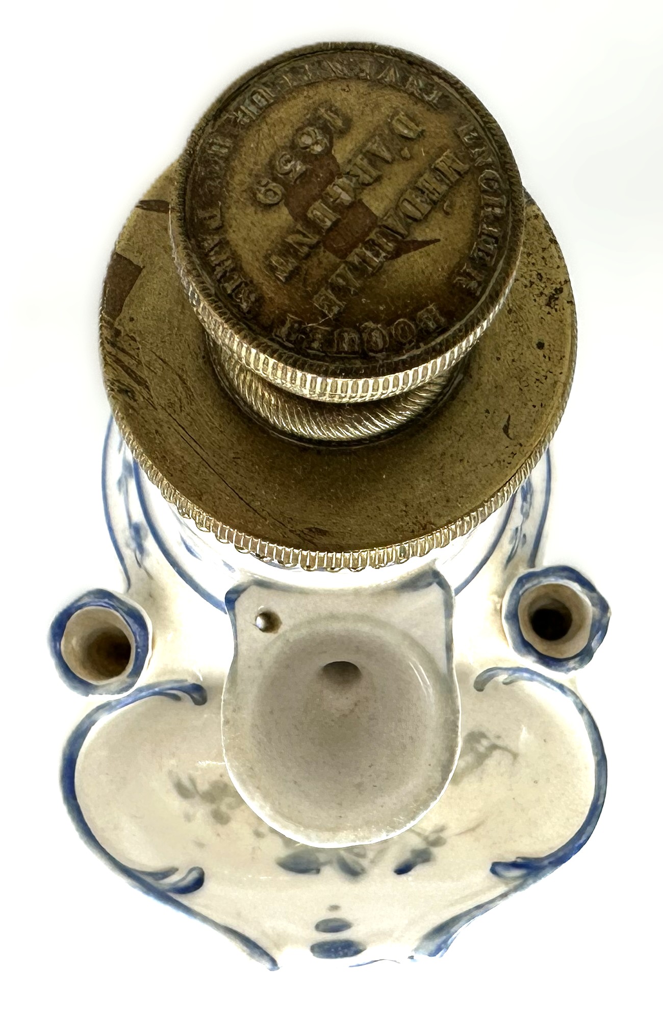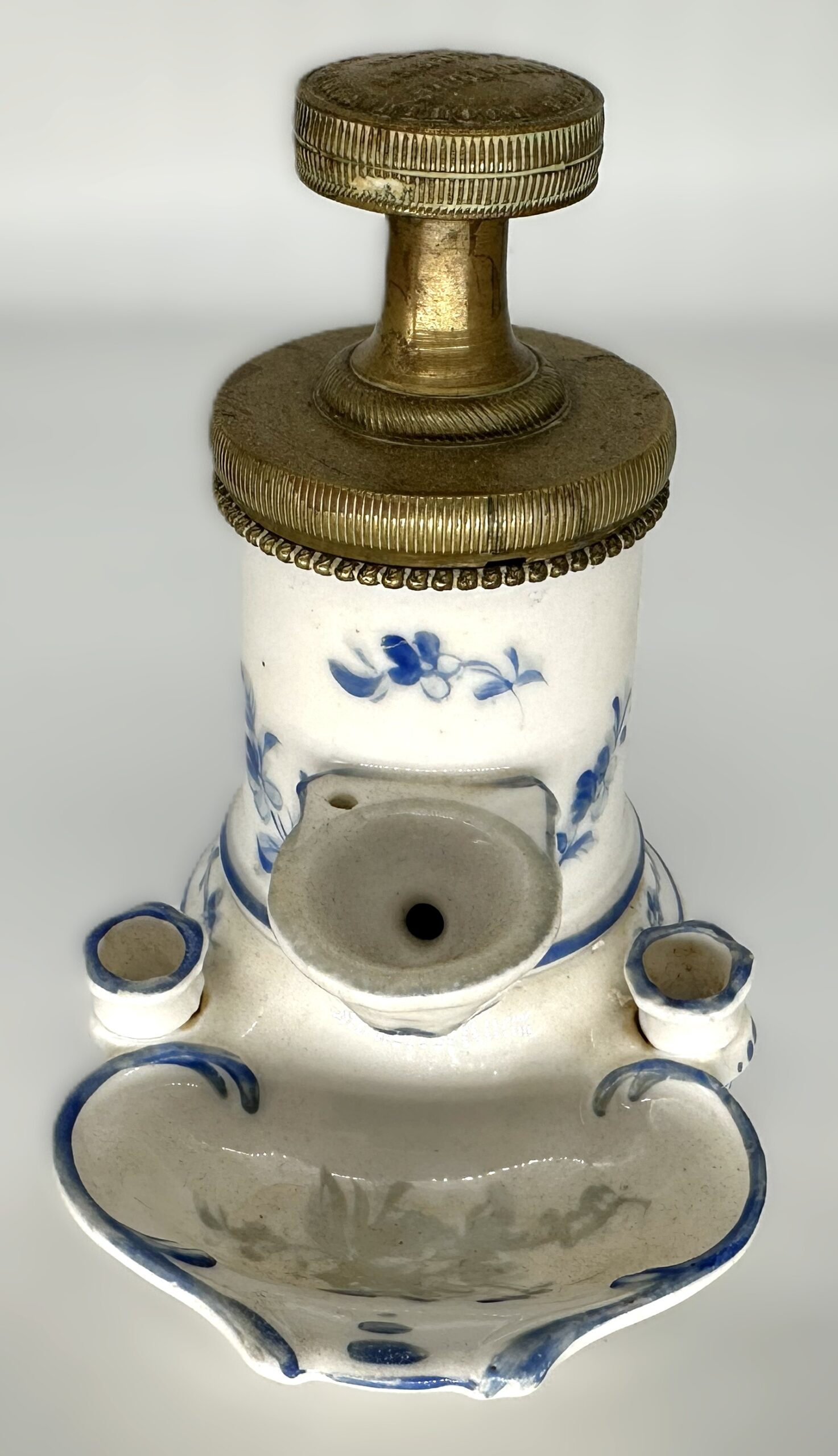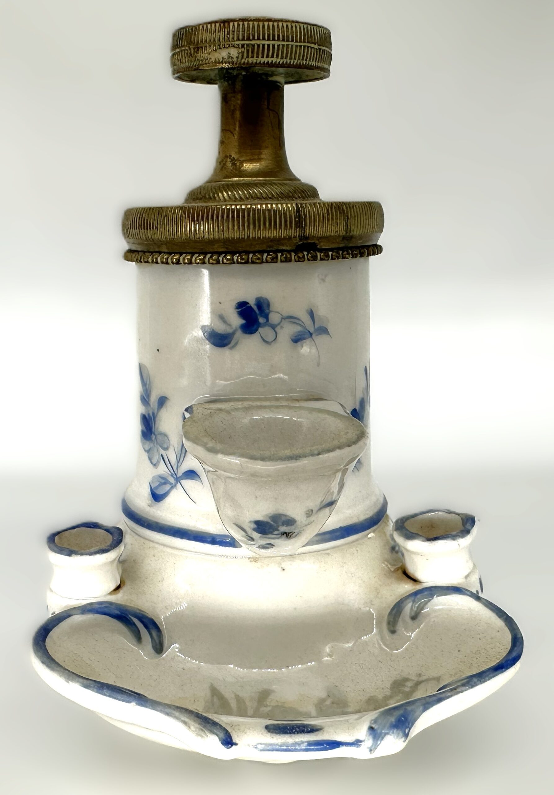 - Fittings: Two small porcelain opening are positioned on either side of the dipping font to serve as quill or pen holders.