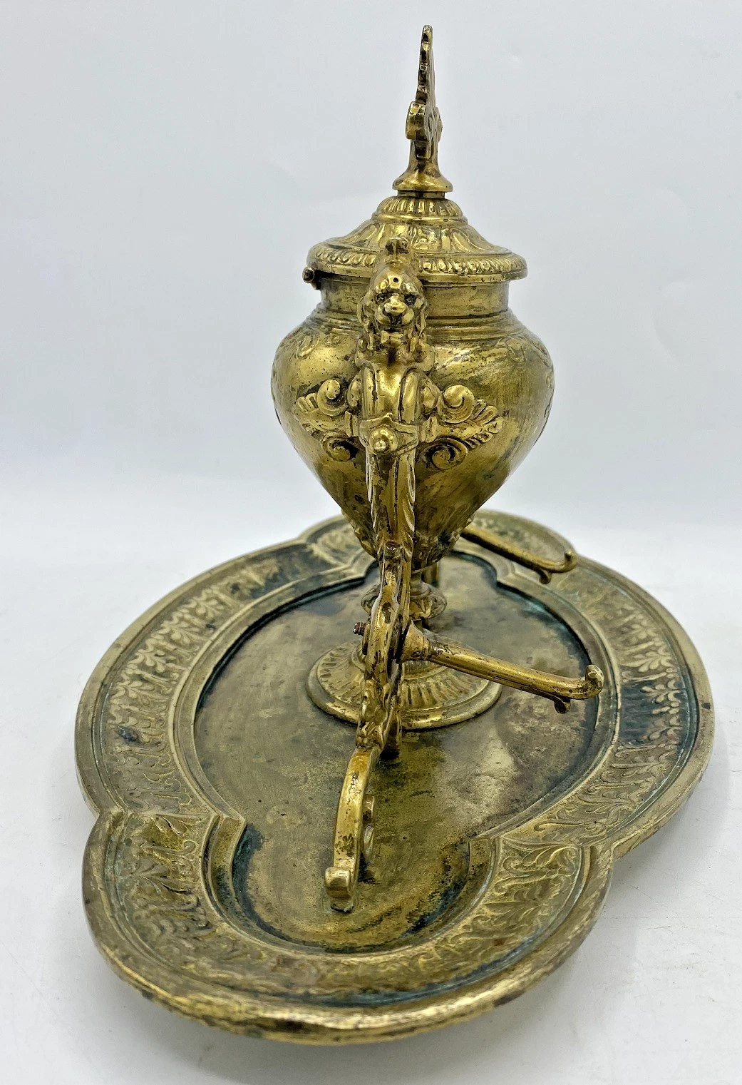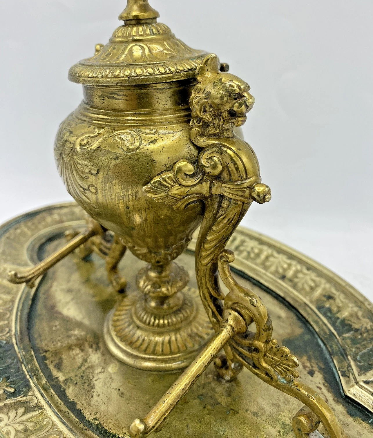 - Missing Insert: The glass or ceramic “well” (the ink pot) is missing. The interior of the urn is quite deep, suggesting it originally held a cylindrical glass insert.